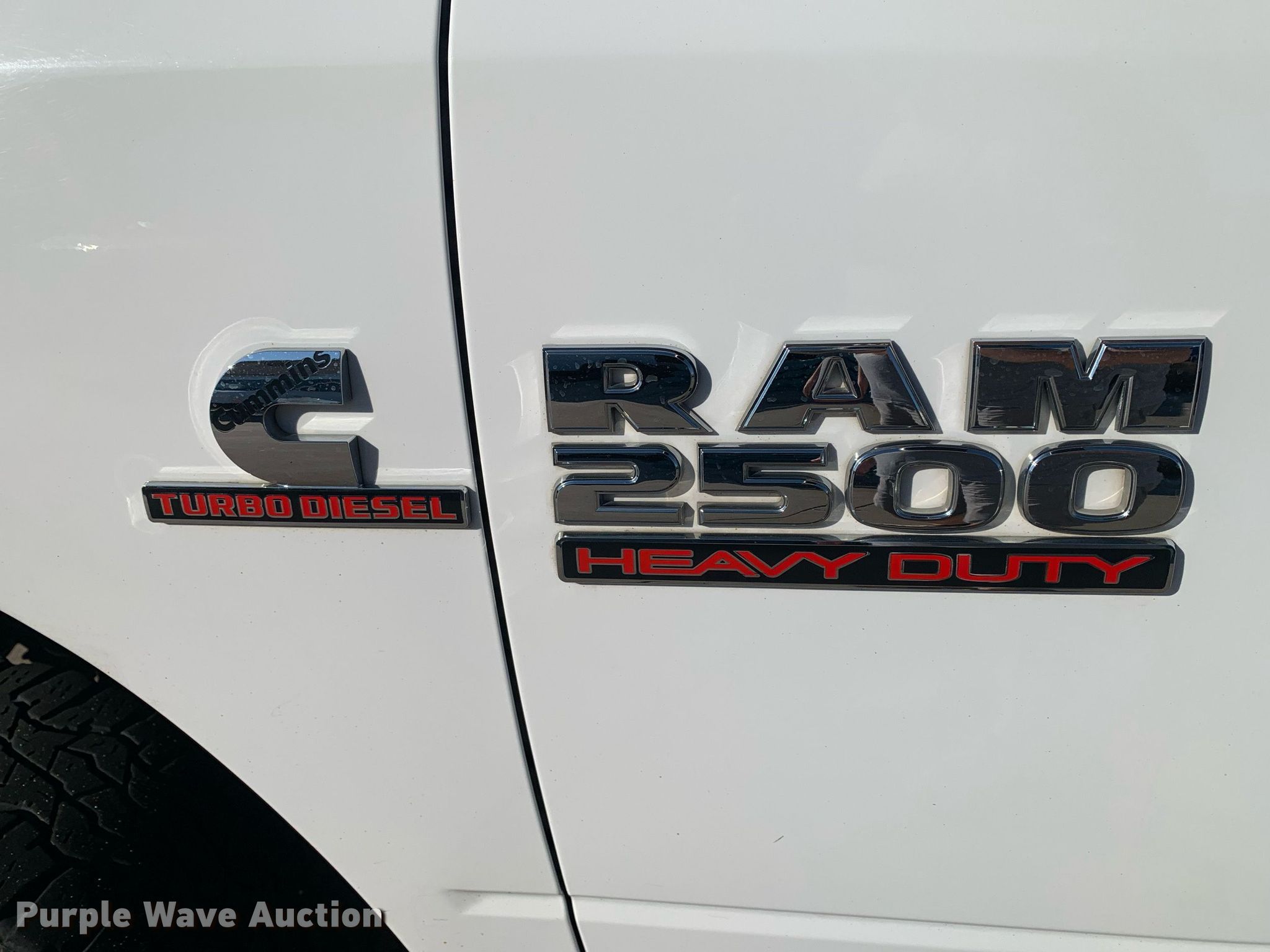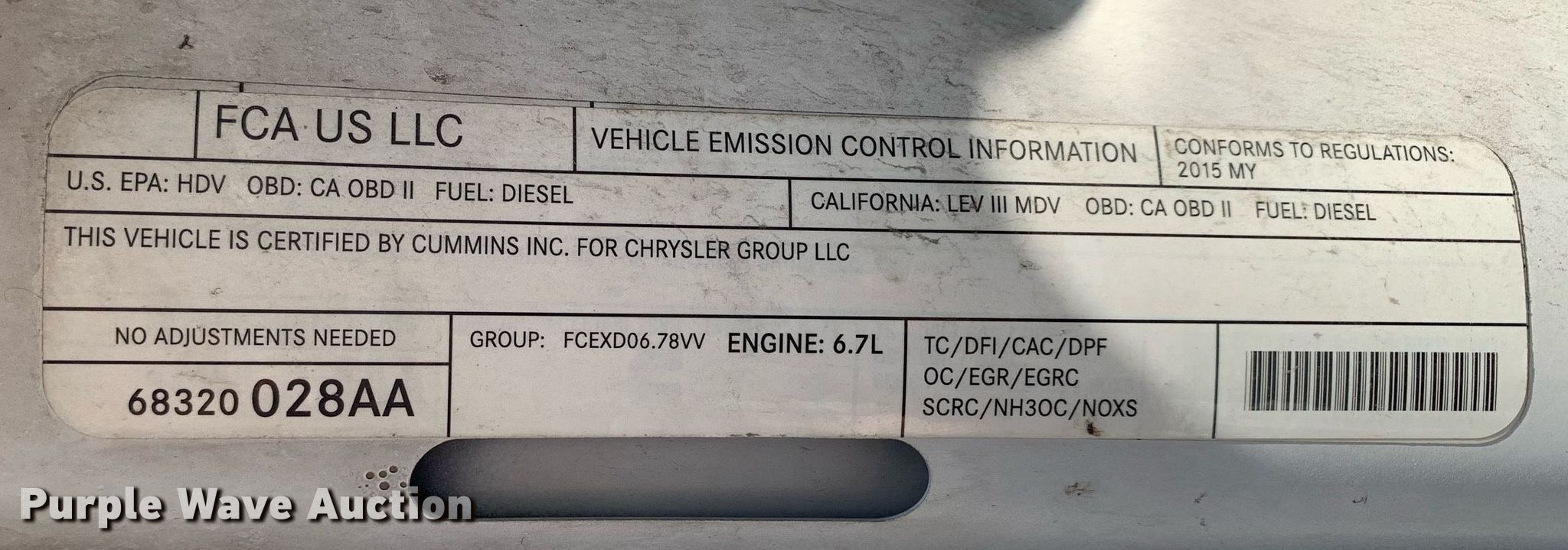 2015 Dodge Ram 2500HD Crew Cab pickup truck. Miles: 278,251 on odometer, VIN: 3C6UR5HL7FG695611, Unit #: P215. Engine Displacement: 6.7L L6 OHV, Cylinders: 6, Fuel type: Diesel. Transmission Automatic, Four wheel drive. Interior AC, Heat, Heated mirrors, Power windows, Power locks, Cruise control, Backup camera. Features Bed: 8' 2" , Hitch: Gooseneck. Tires Size: 275/65R18. Notes DEF deleted, Dash warning indicator: Check engine. Texas title. Title distribution may be delayed up to 14 days from verification of funds. Carroll Distributing & Construction Supply. 10930 Petal Street. Dallas, TX 75238