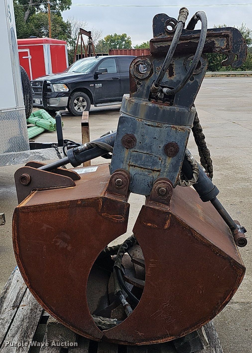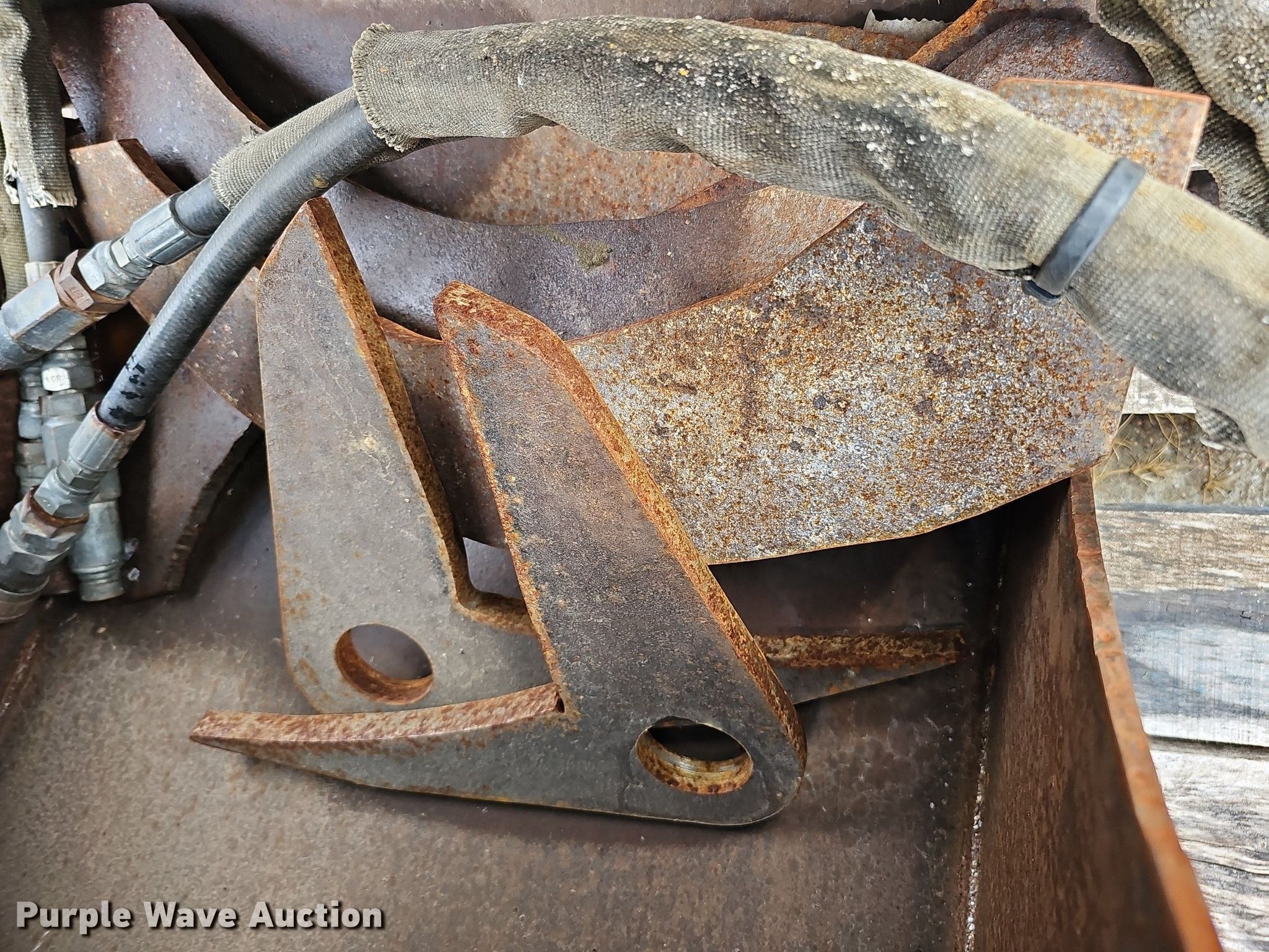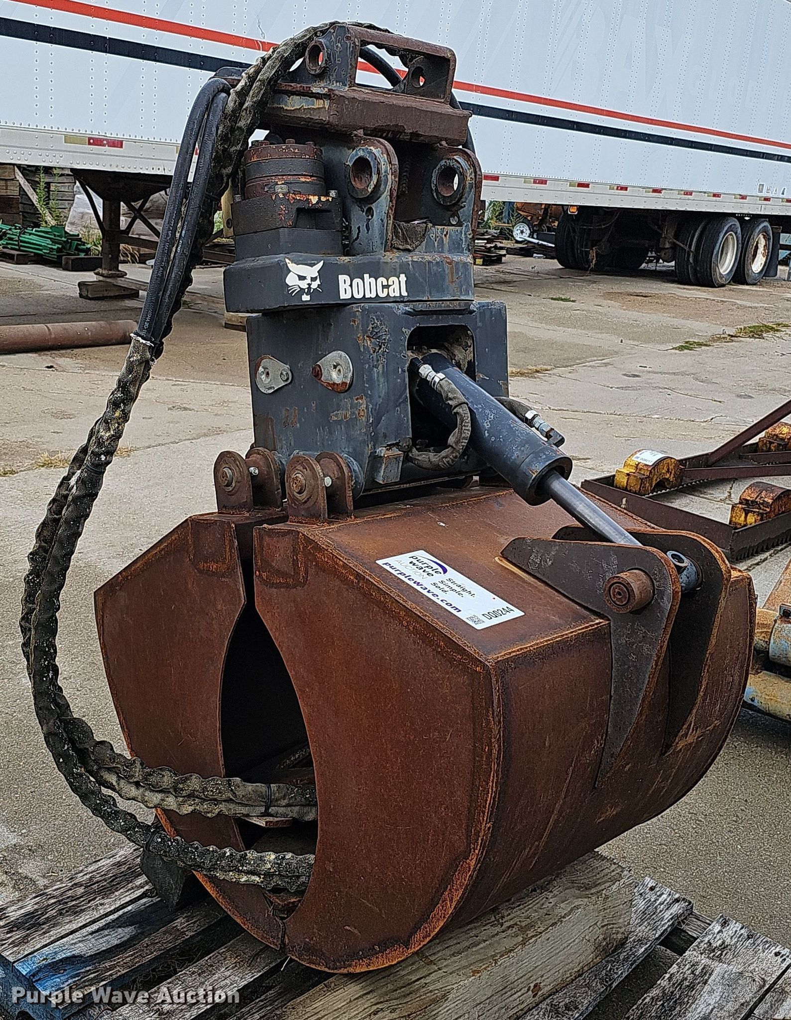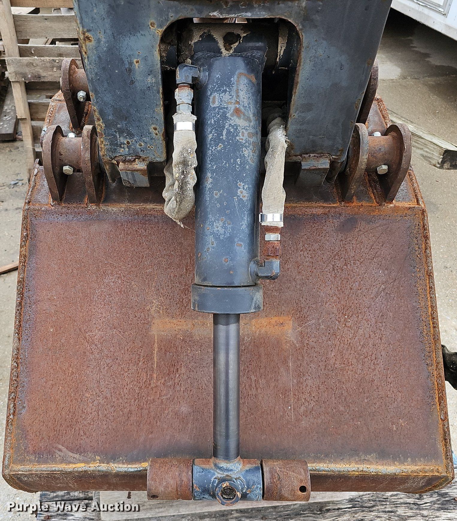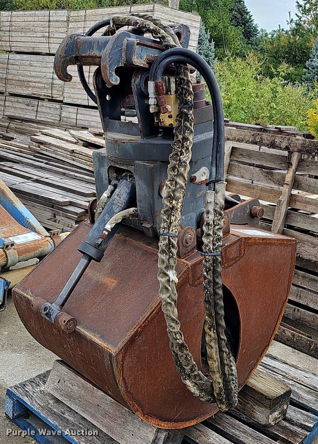 Purple Wave is selling a used Excavator Attach. in Nebraska. This item is a Shop built 24.5"W clamshell bucket with the following: Cutting edge: Weld-on, Bobcat hydraulic rotation, Serial: 077560013, Quick coupler
