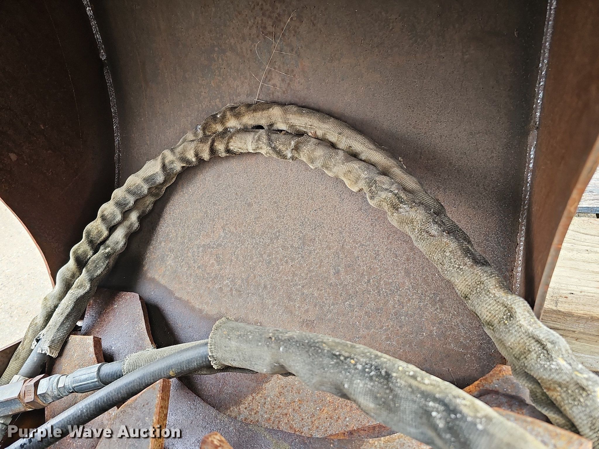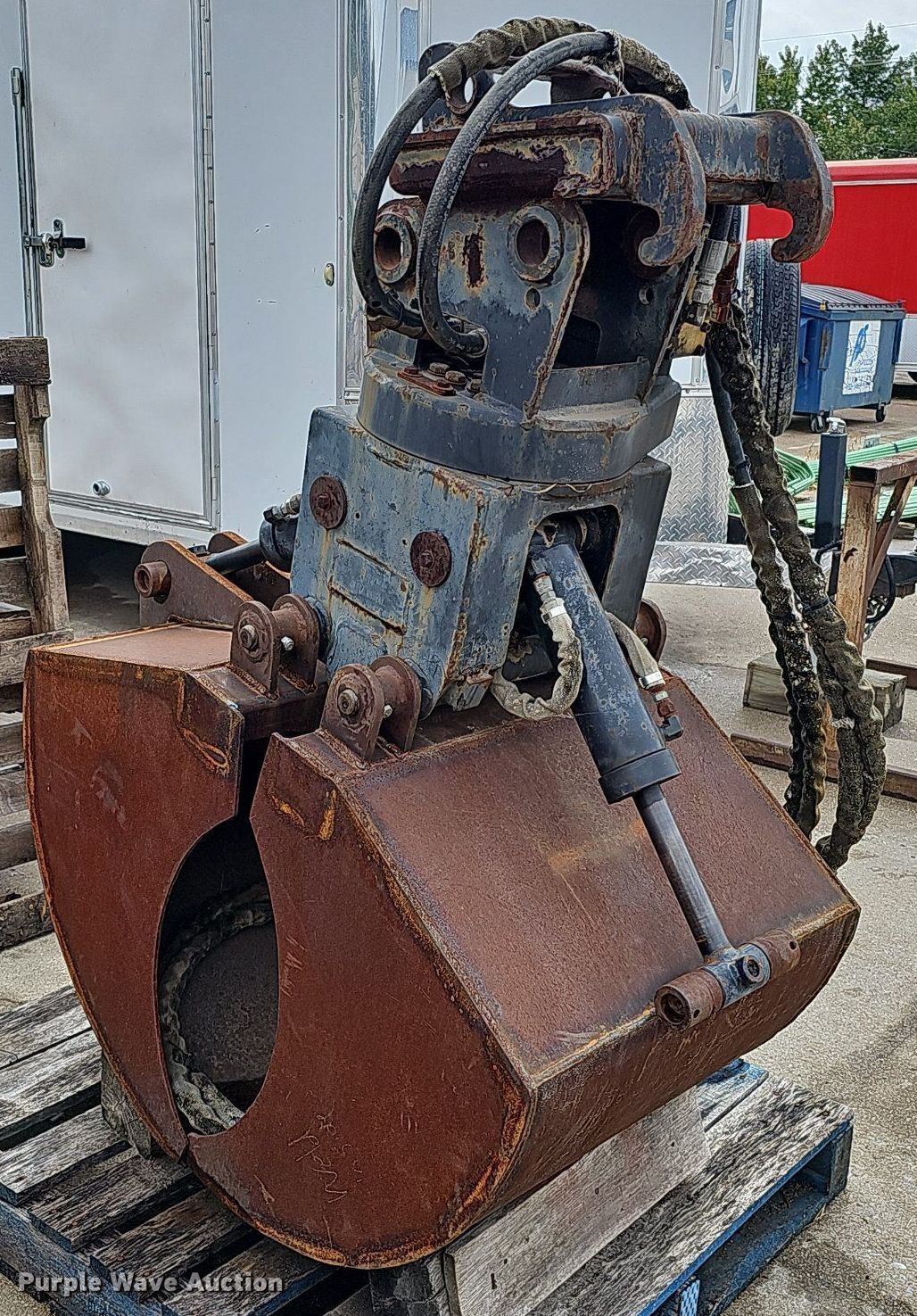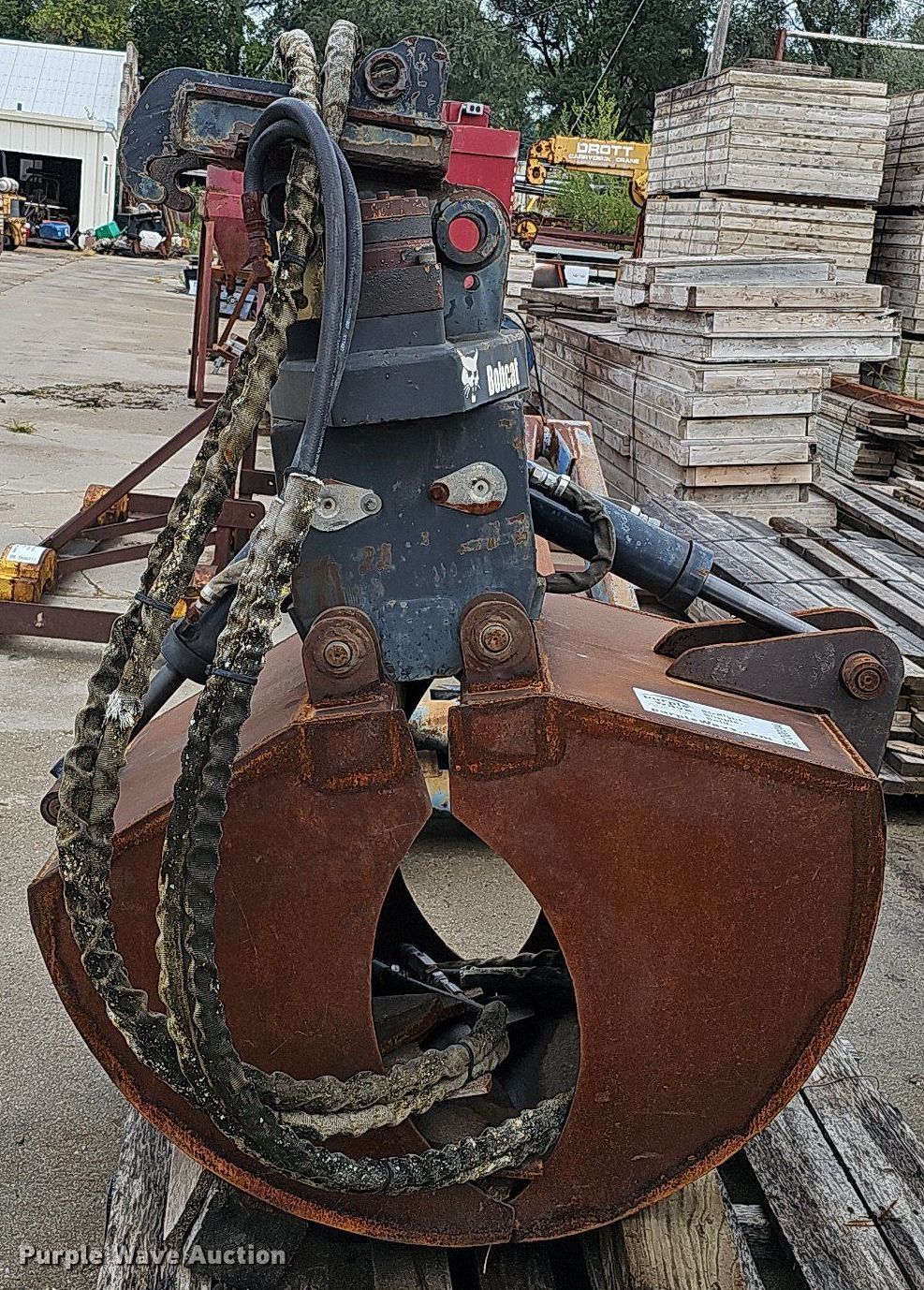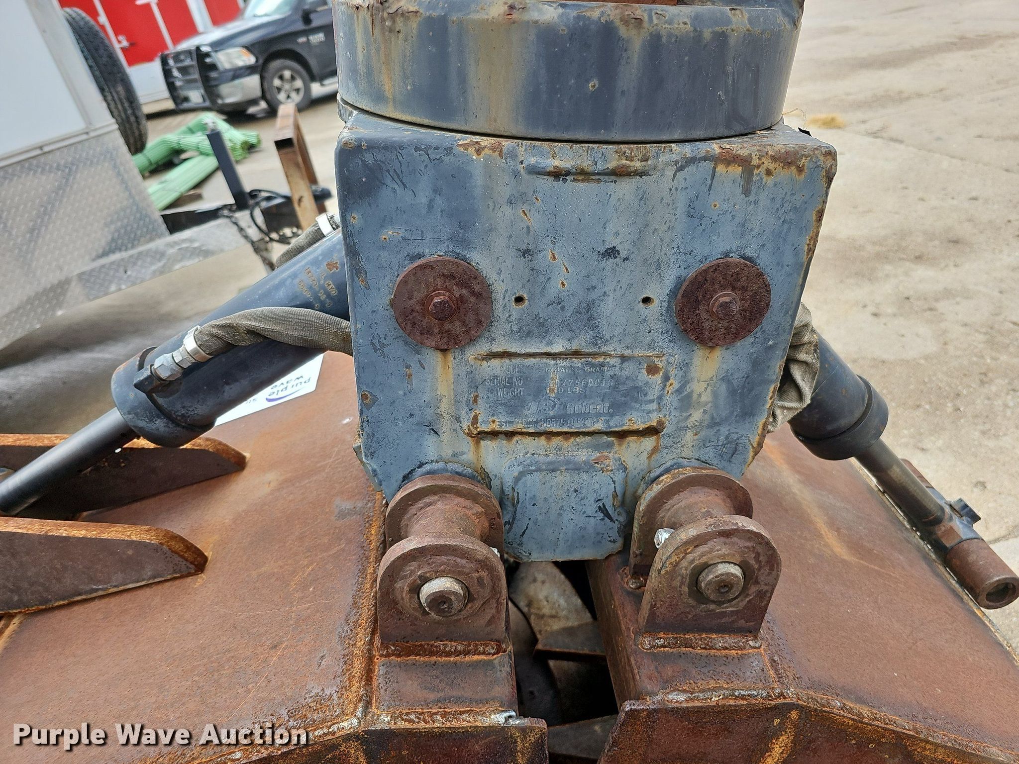 Purple Wave is selling a used Excavator Attach. in Nebraska. This item is a Shop built 24.5"W clamshell bucket with the following: Cutting edge: Weld-on, Bobcat hydraulic rotation, Serial: 077560013, Quick coupler