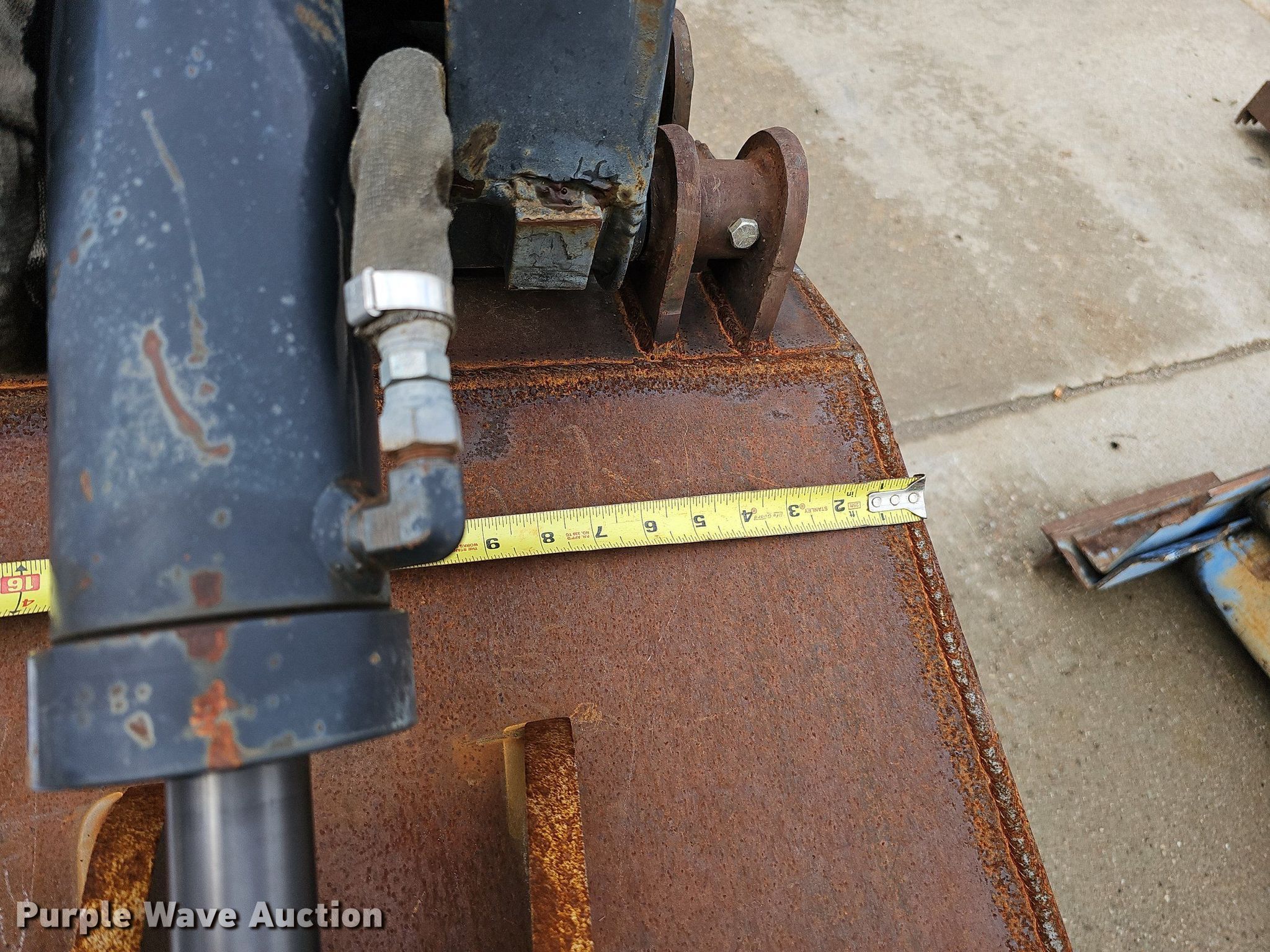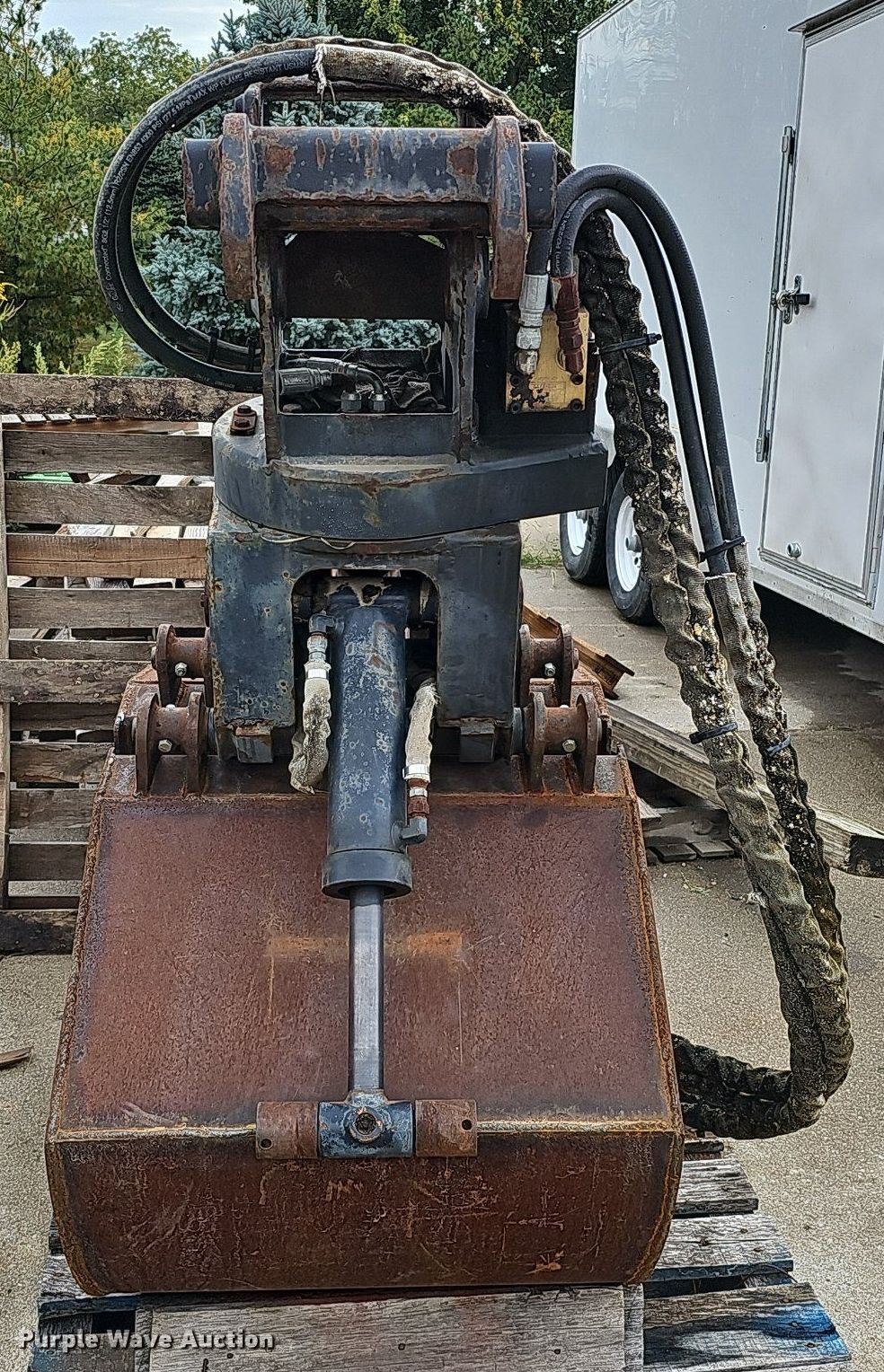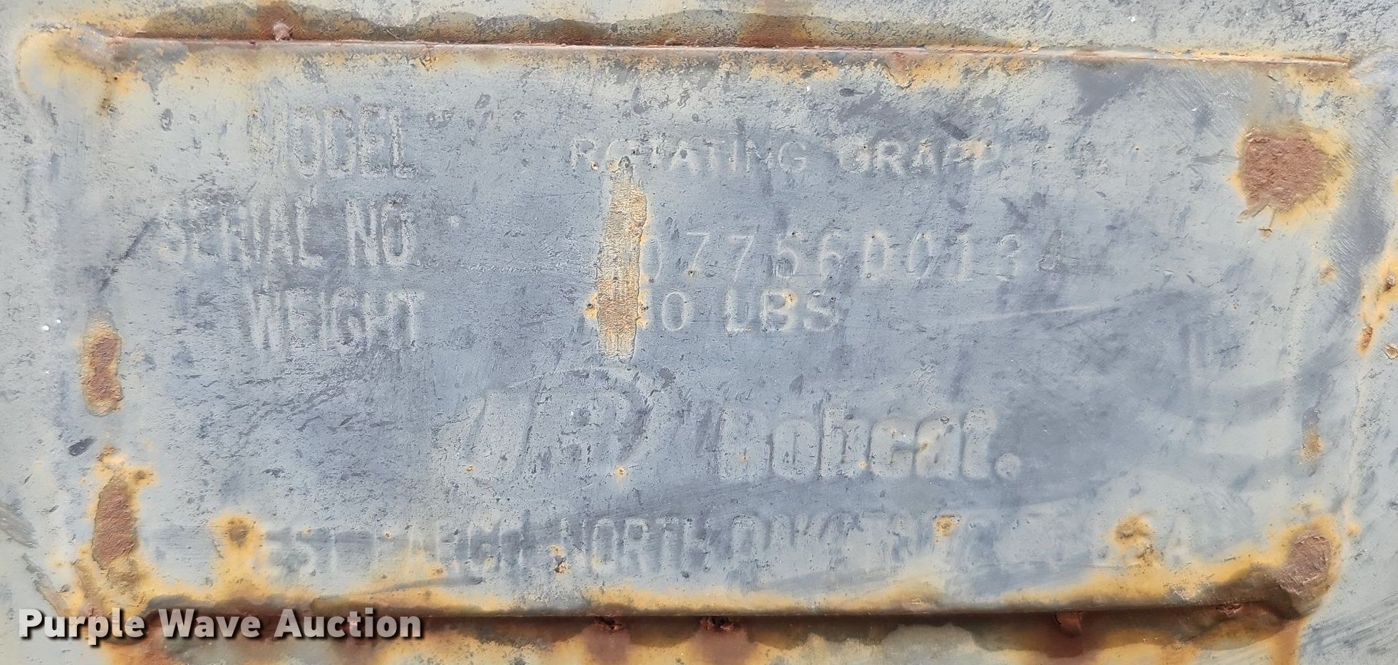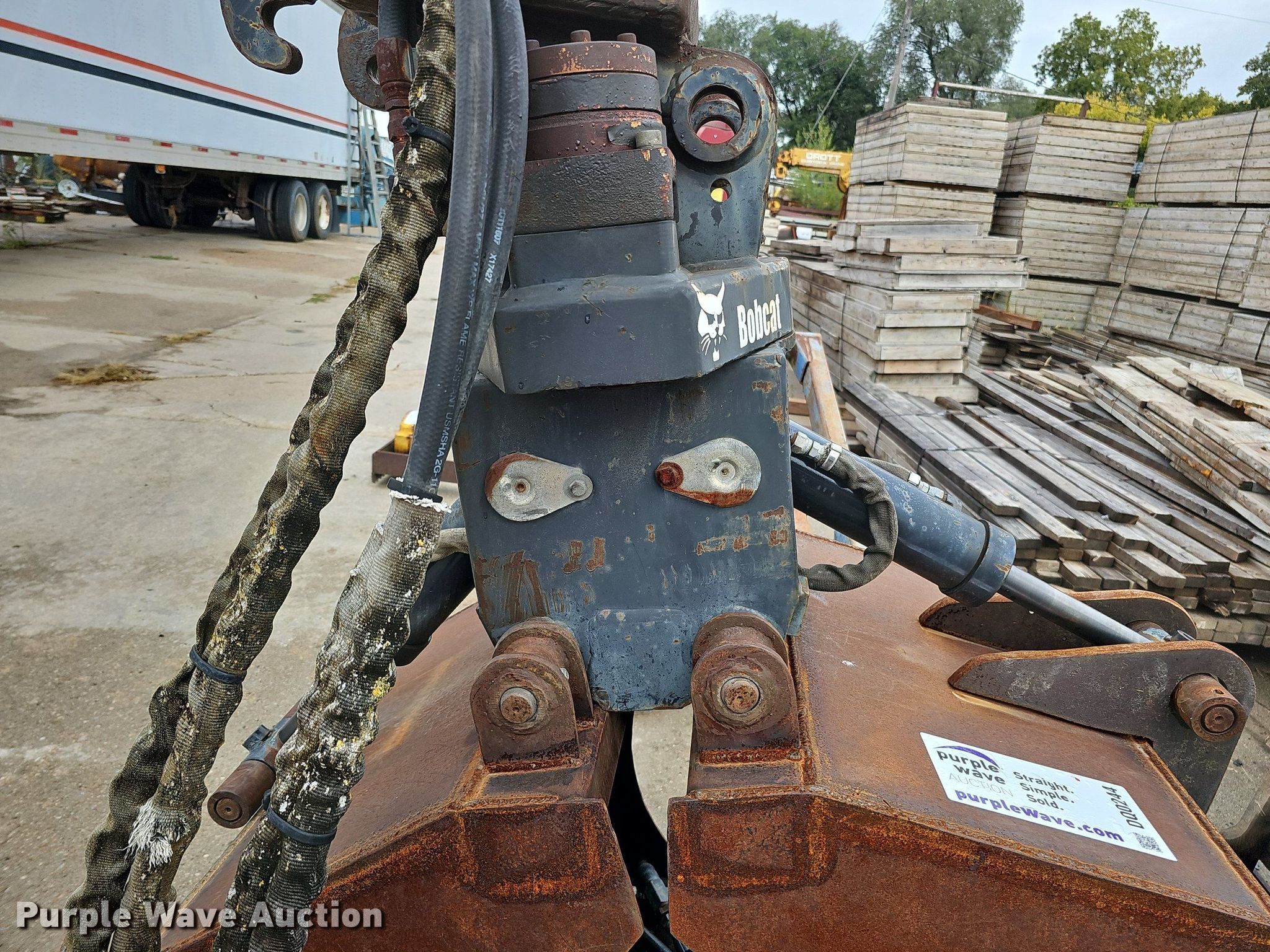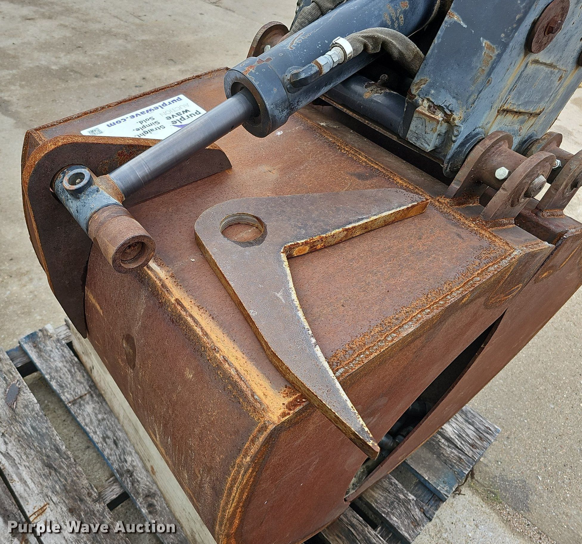 Purple Wave is selling a used Excavator Attach. in Nebraska. This item is a Shop built 24.5"W clamshell bucket with the following: Cutting edge: Weld-on, Bobcat hydraulic rotation, Serial: 077560013, Quick coupler