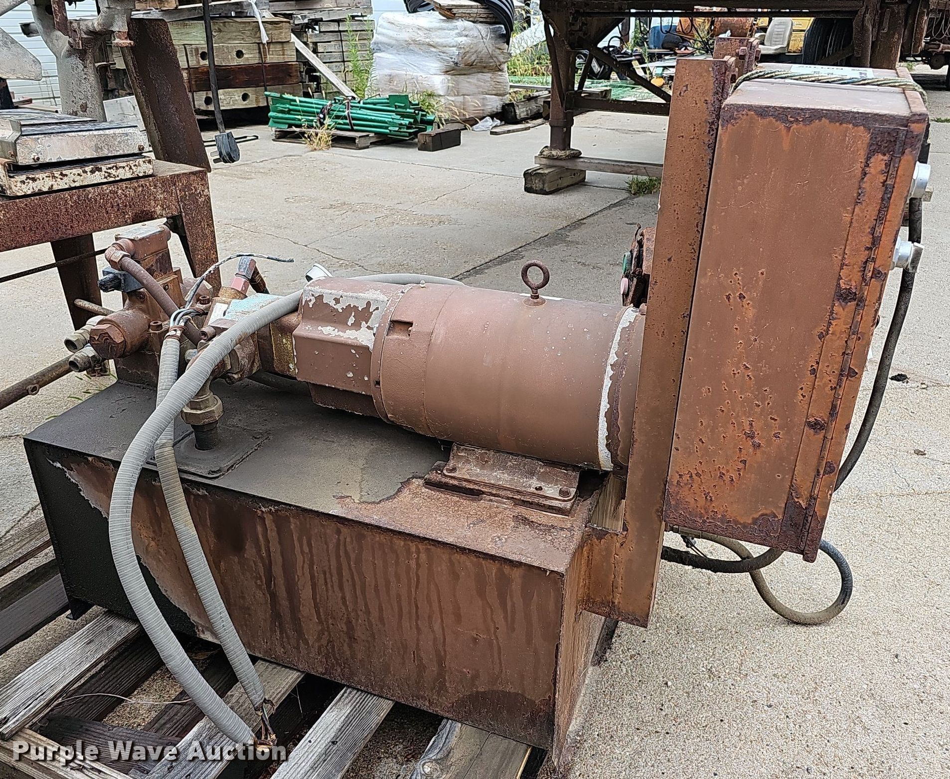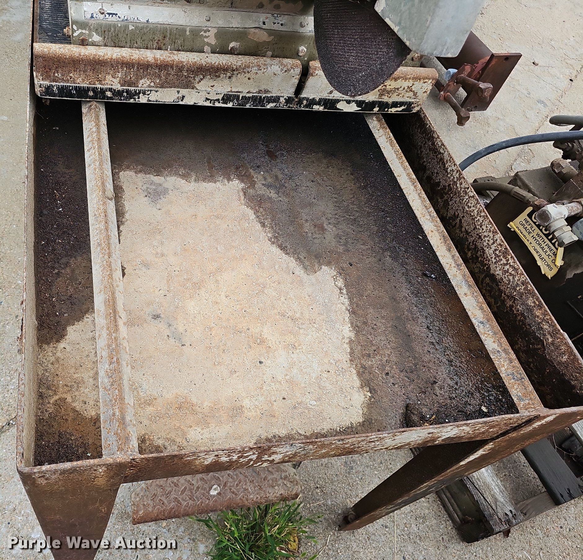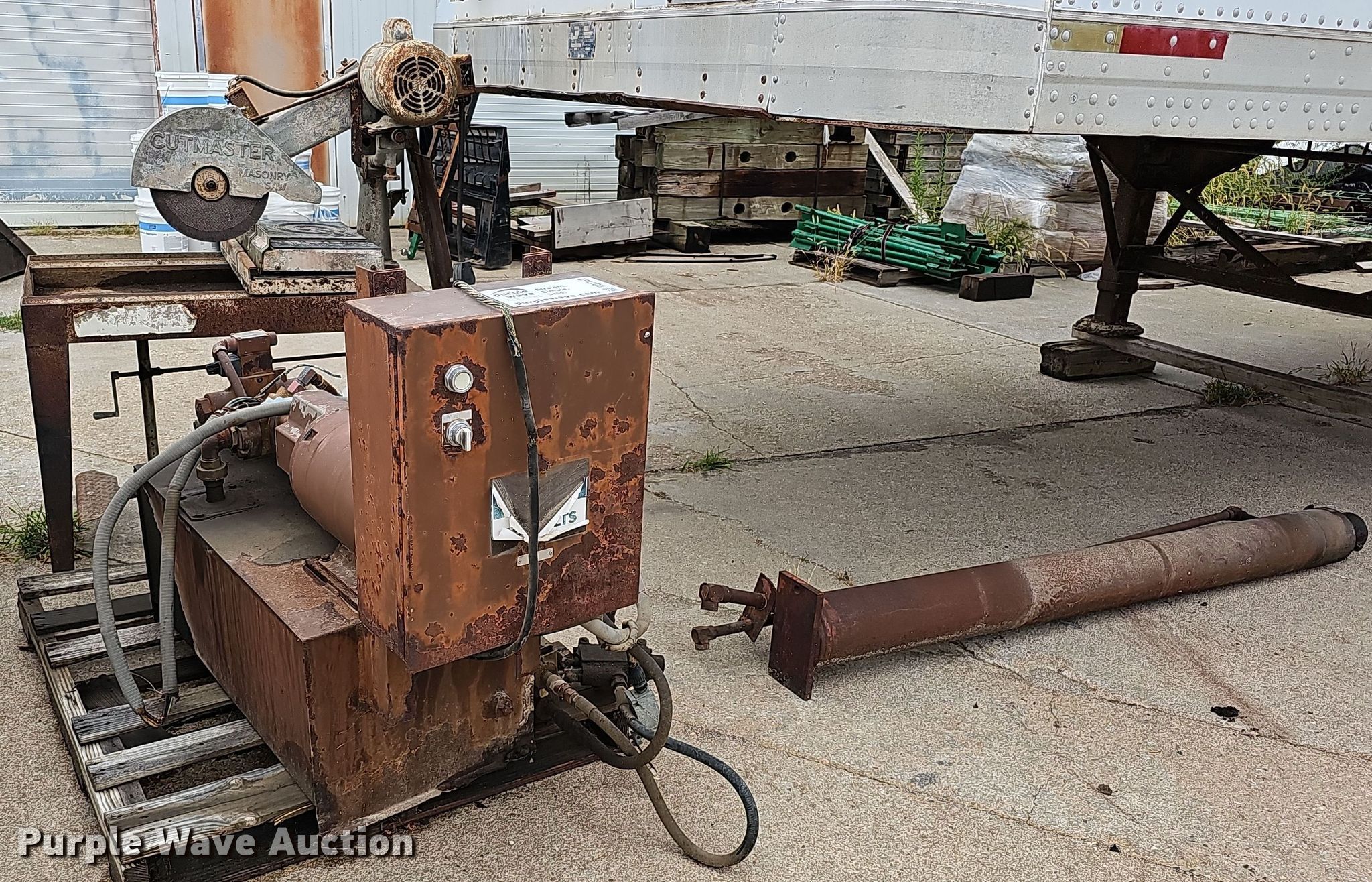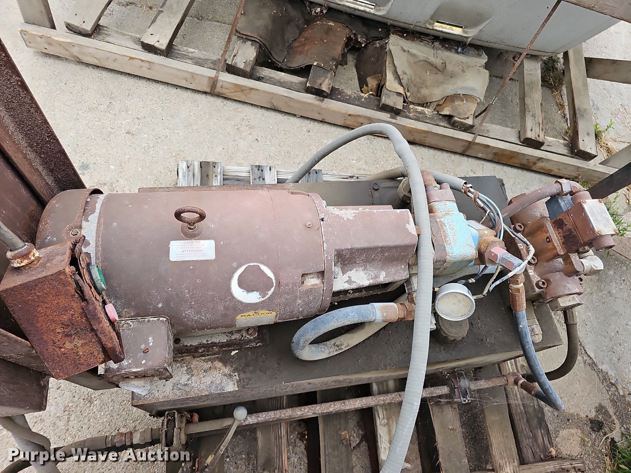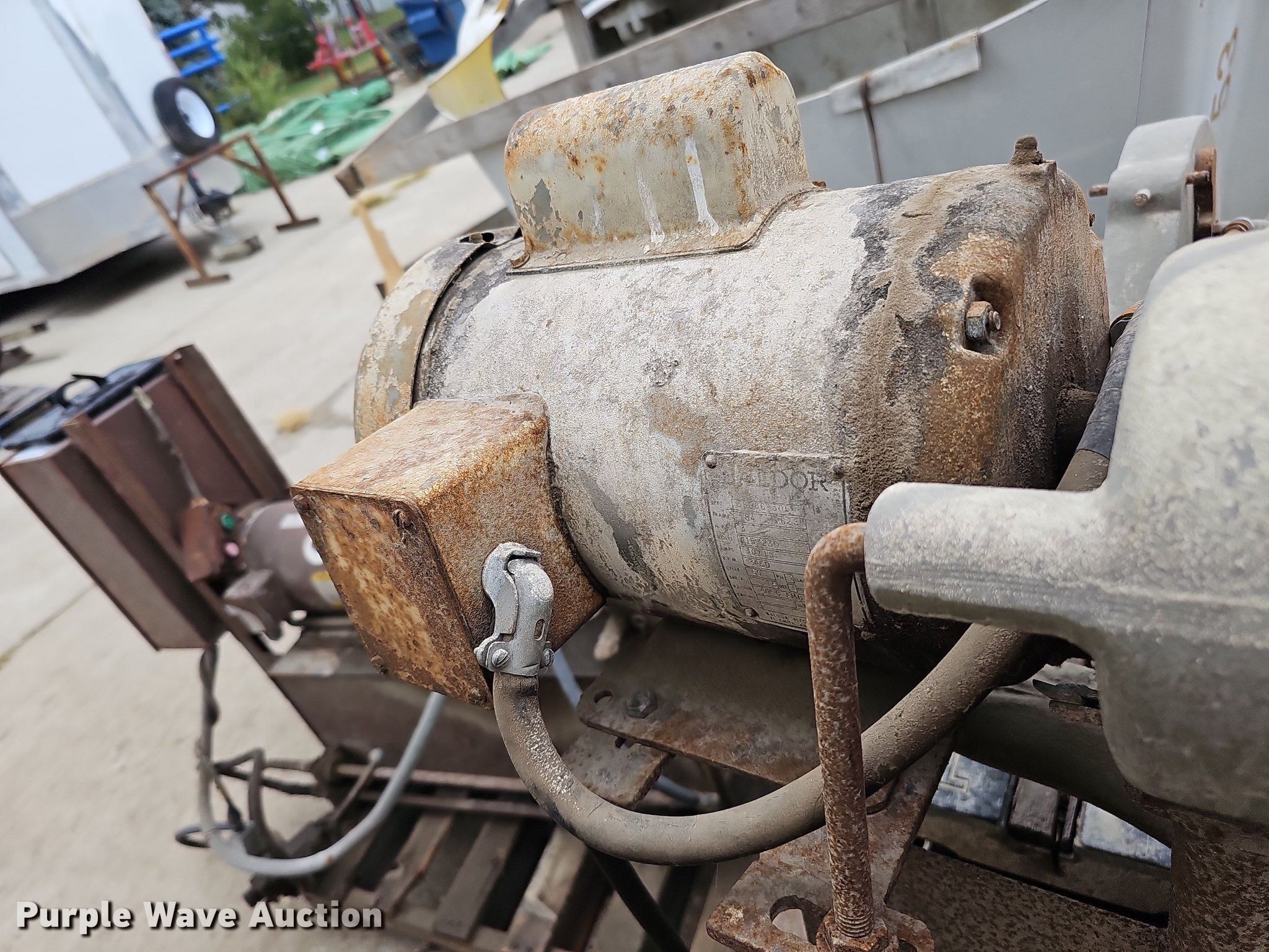 Purple Wave is selling a used Tools in Nebraska. This item is a Tools with the following: Hoist, PTO pump, 36"L x 18"W x 14"H tank, Baldor CM3714T electric motor, 208-230/460V, Three phase, 10 HP, Wiring issues, Masonry Equipment Inc 31-14 masonry saw, 41.5"L x 27"W x 57"H, Baldor 36086-3064 electric motor, 115/230V, Single phase, 3 HP, Serial: 661, Unknown operating conditions