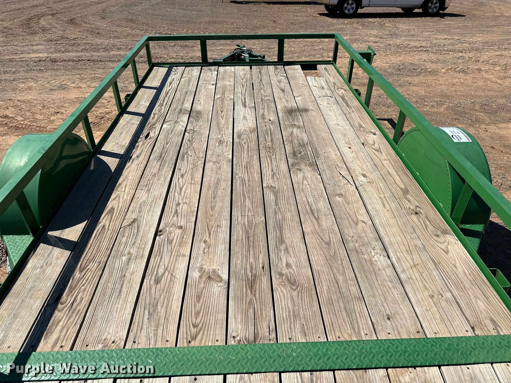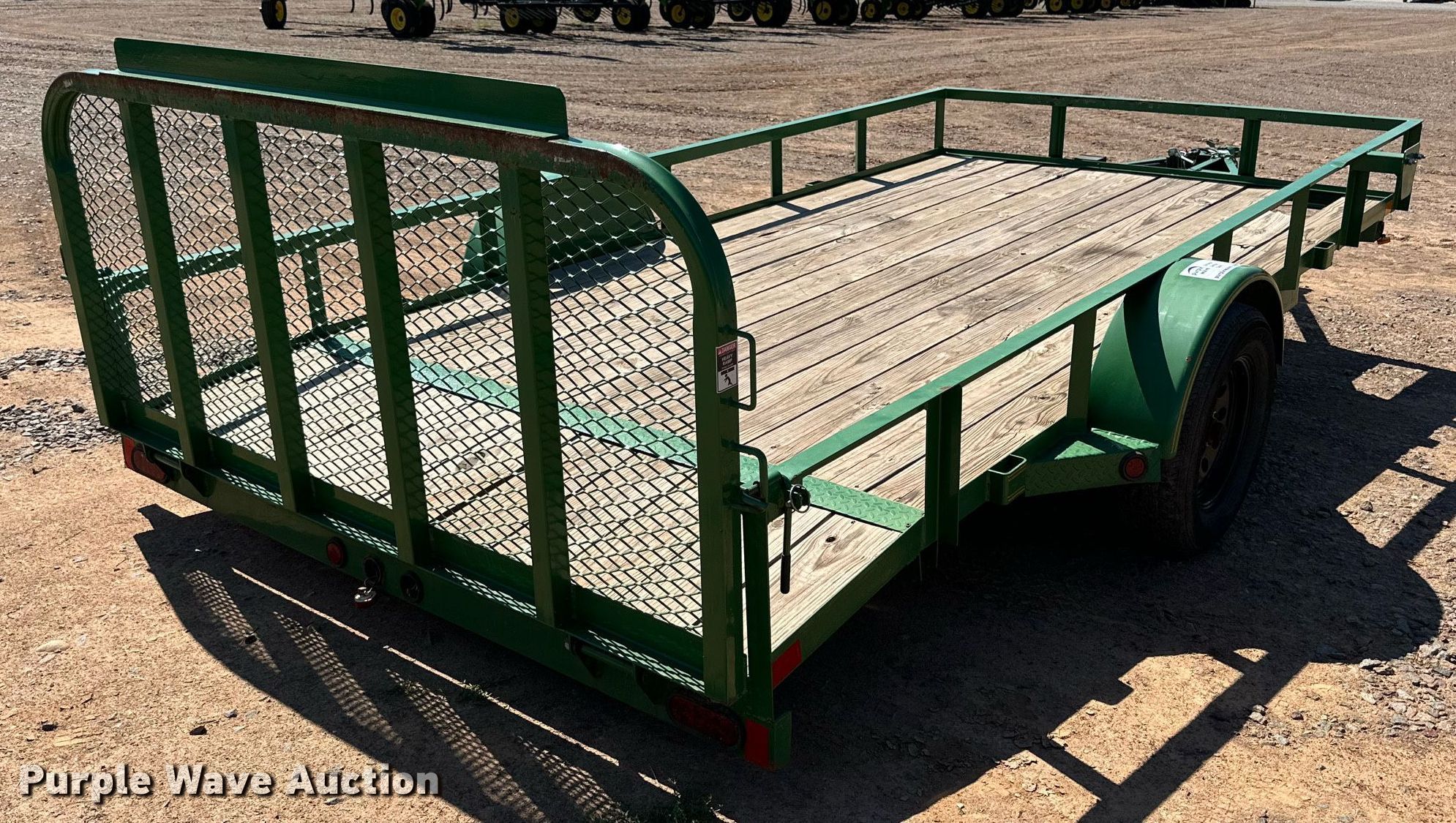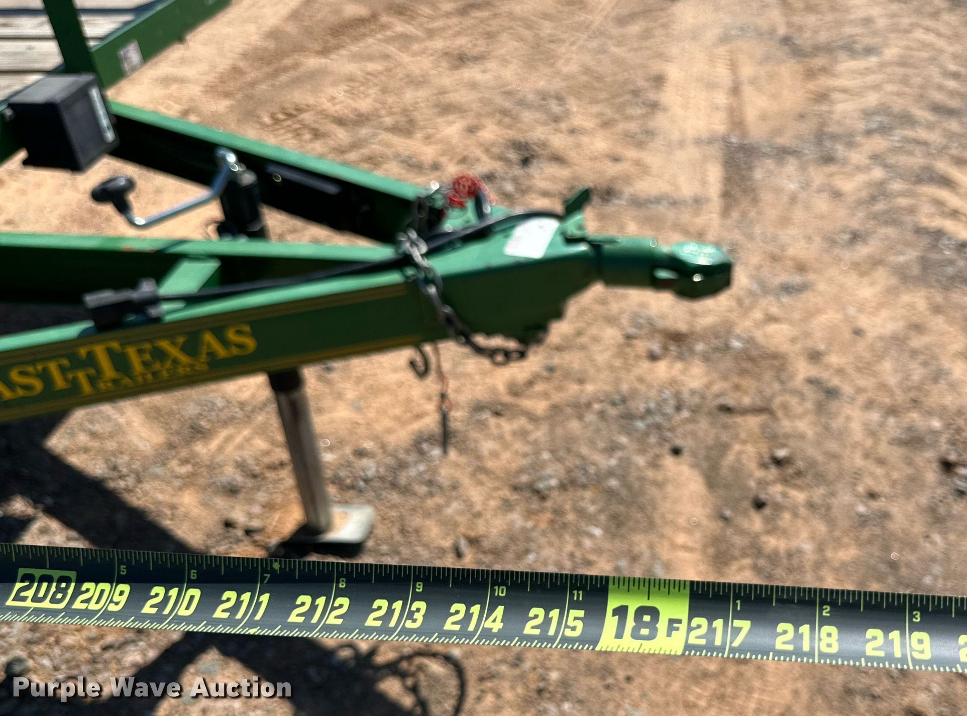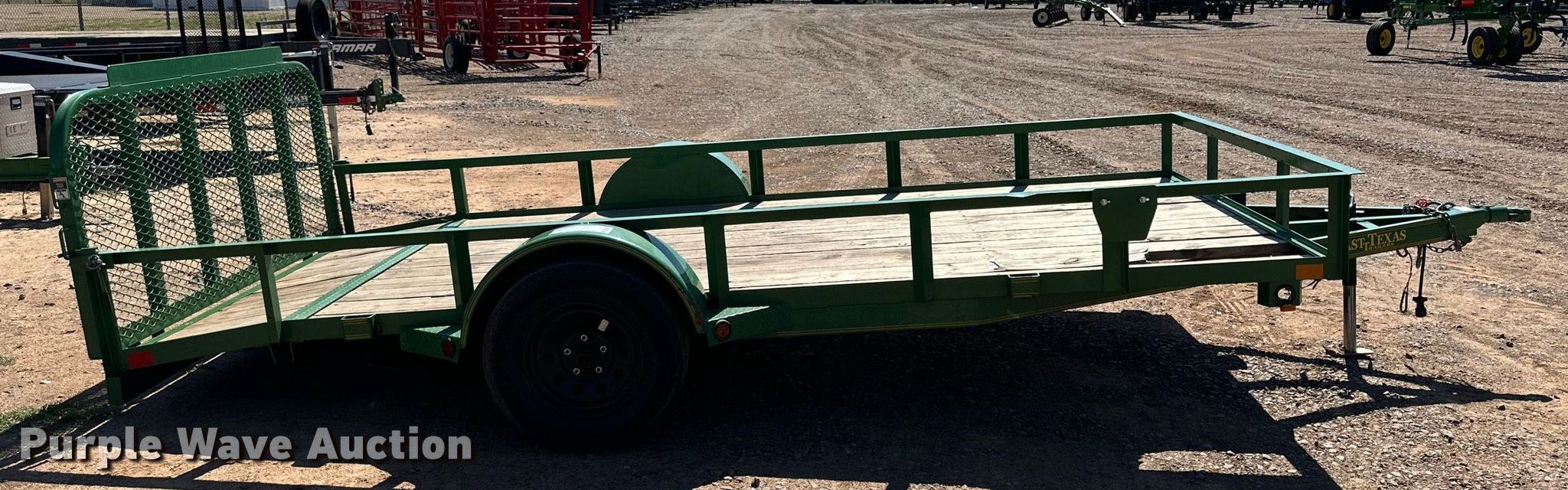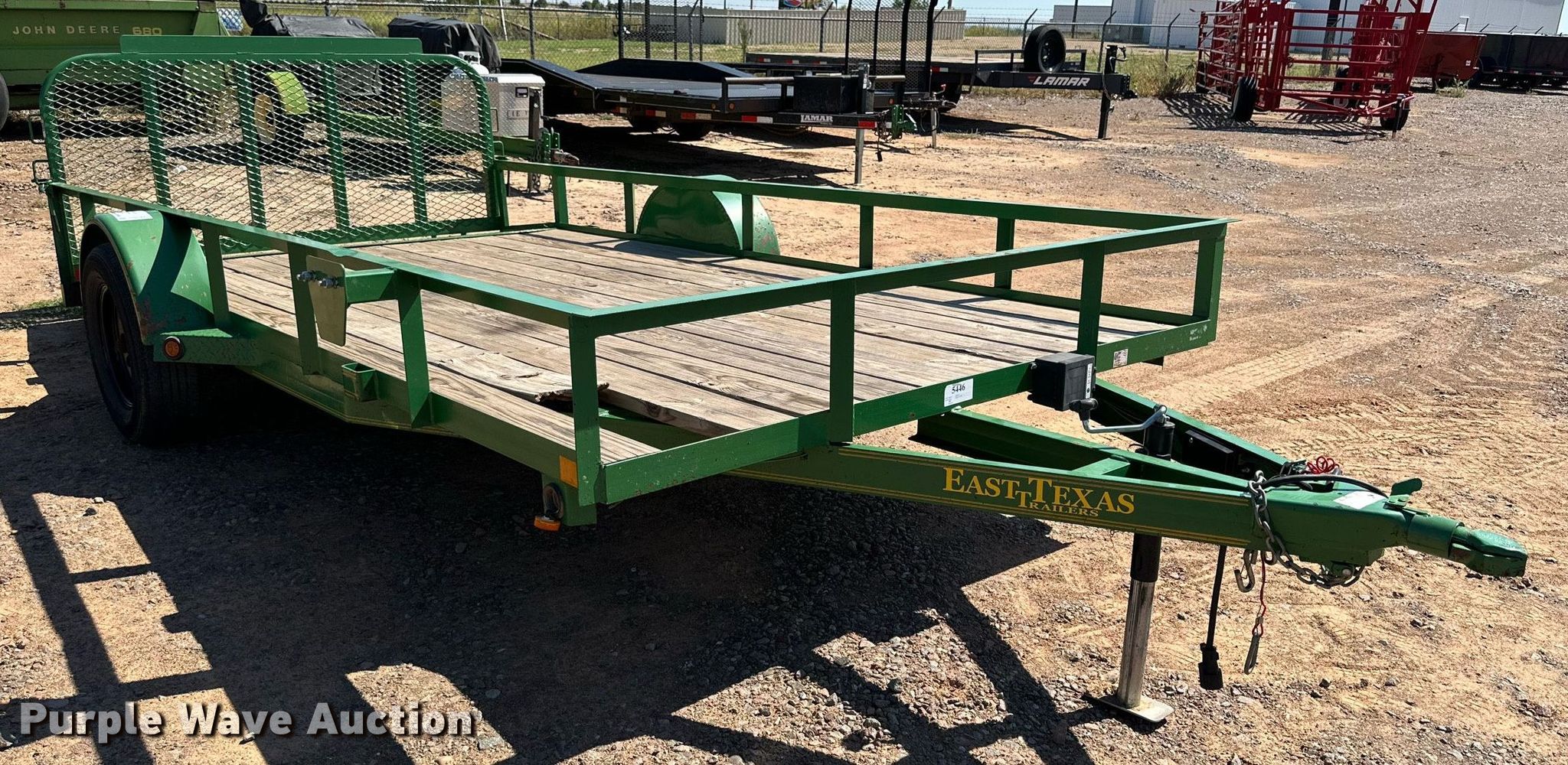 2021 East Texas Trailers utility trailer. VIN: 58SBU1412ME024654. Dimensions Overall: 18' L x 102" W, Deck: 14' L x 82" W, Tail length: 2', Ramps: Manual Length: 3'. Features Deck type: Wood. Chassis Ball hitch: 2", Landing gear: Single, Suspension: Spring, Brakes: Electric, GVWR: 2,990 lbs, GAWR: 3,500 lbs. Tires Steel wheels, Size: 205/75R15. Notes Deck boards damaged. Oklahoma title. Title distribution may be delayed up to 14 days from verification of funds. 7769 US Hwy 287. Childress, TX 79201