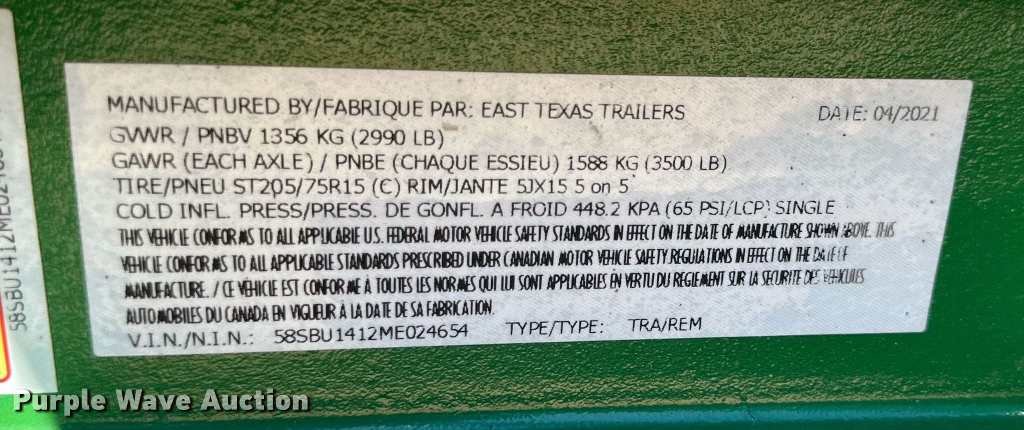 Purple Wave is selling a used Car or Utility Trailer in Texas. This item is a 2021 East Texas Trailers utility trailer with the following: VIN: 58SBU1412ME024654