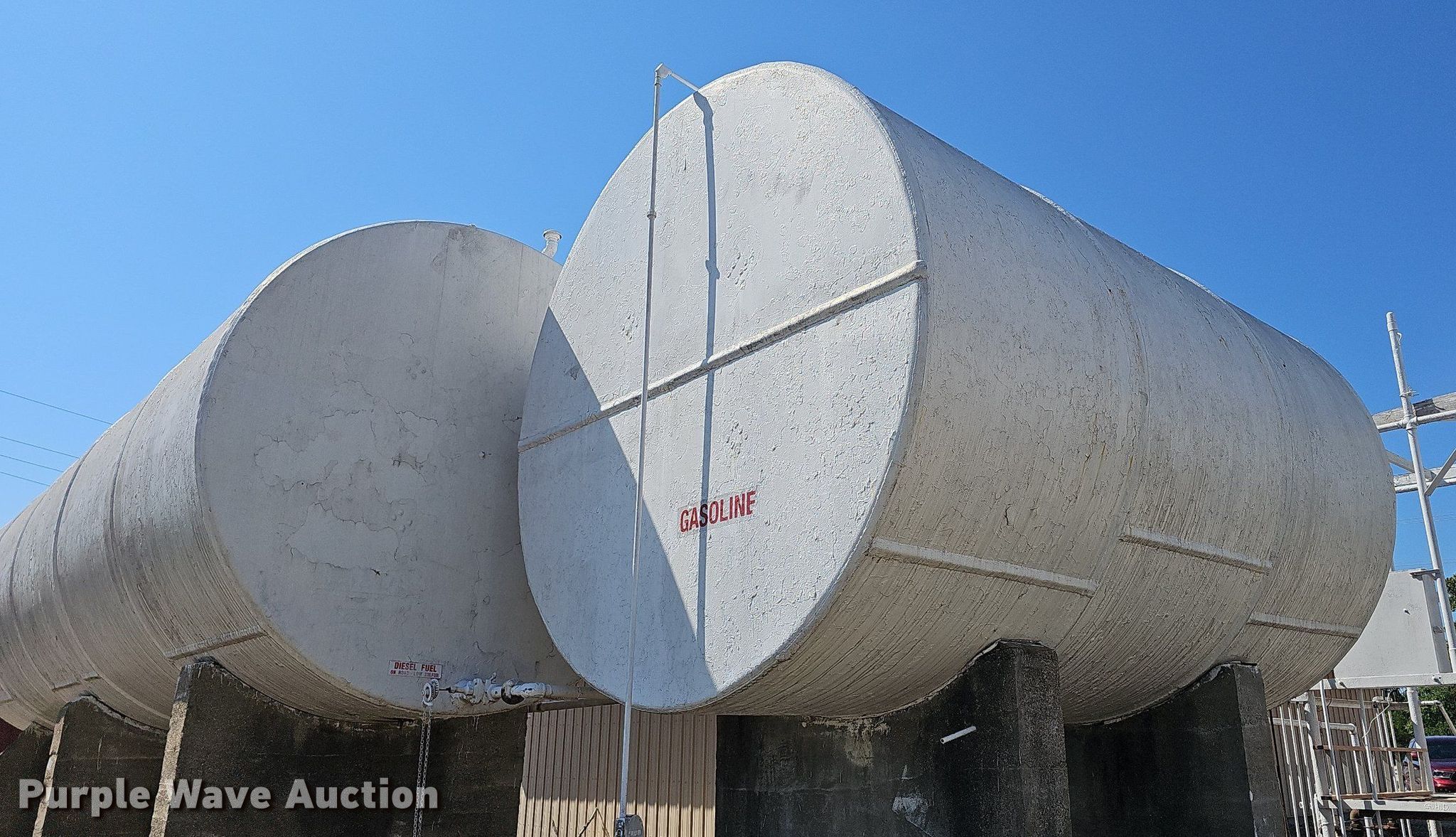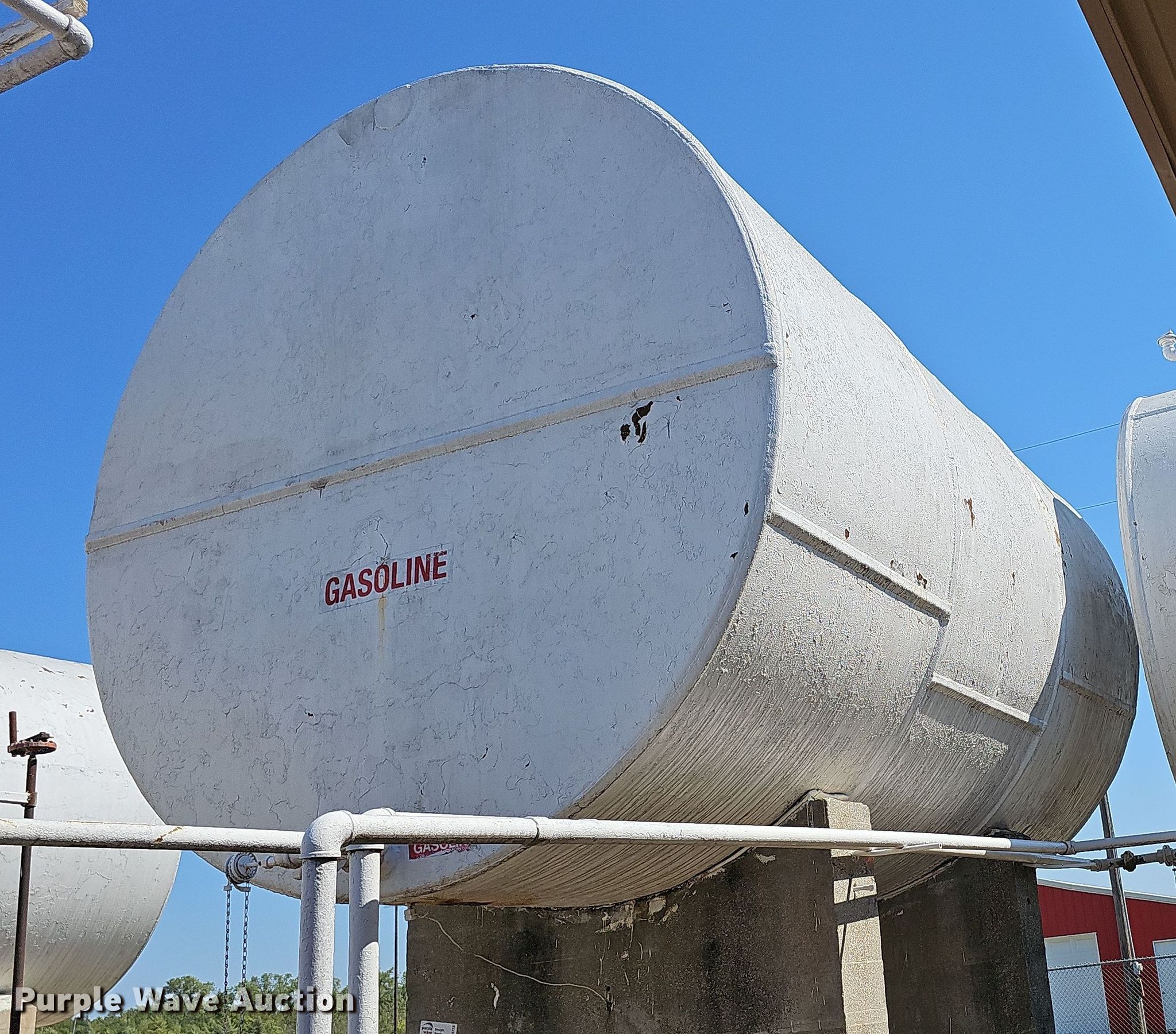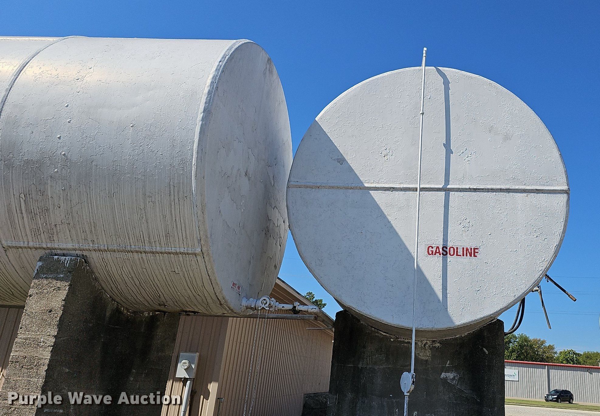 Purple Wave is selling a used Fuel and Lube in Kansas. This item is a (2) fuel tanks with the following: Dyed diesel, 31' L x 11' diameter, Capacity: 17,529 gallons, Gasoline, 16' L x 10' diameter, Capacity: 10,362 gallons