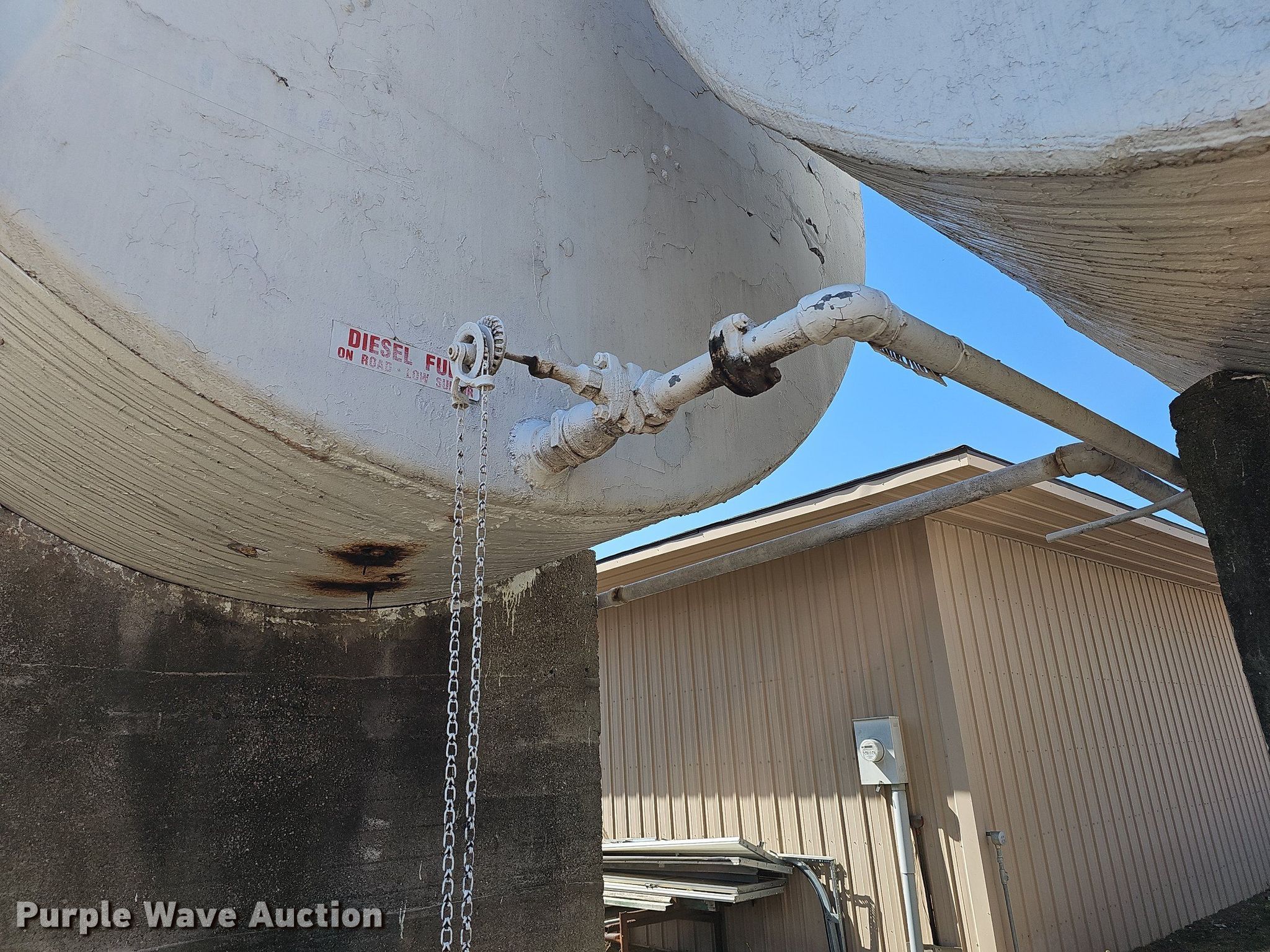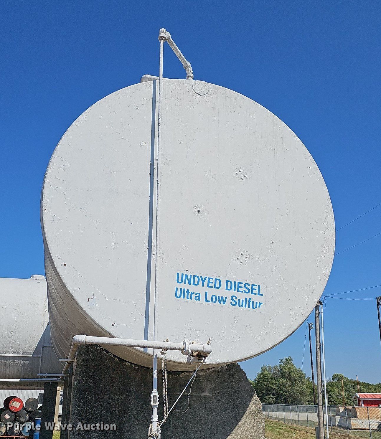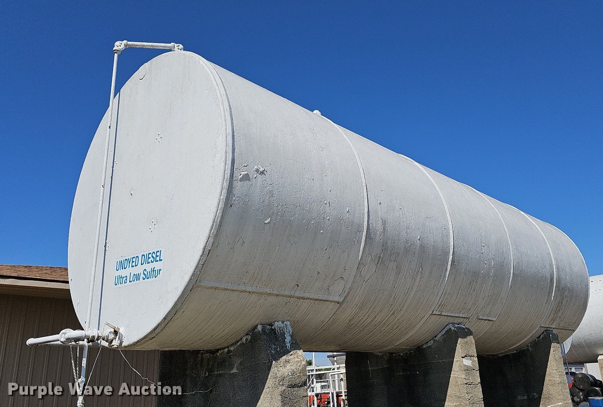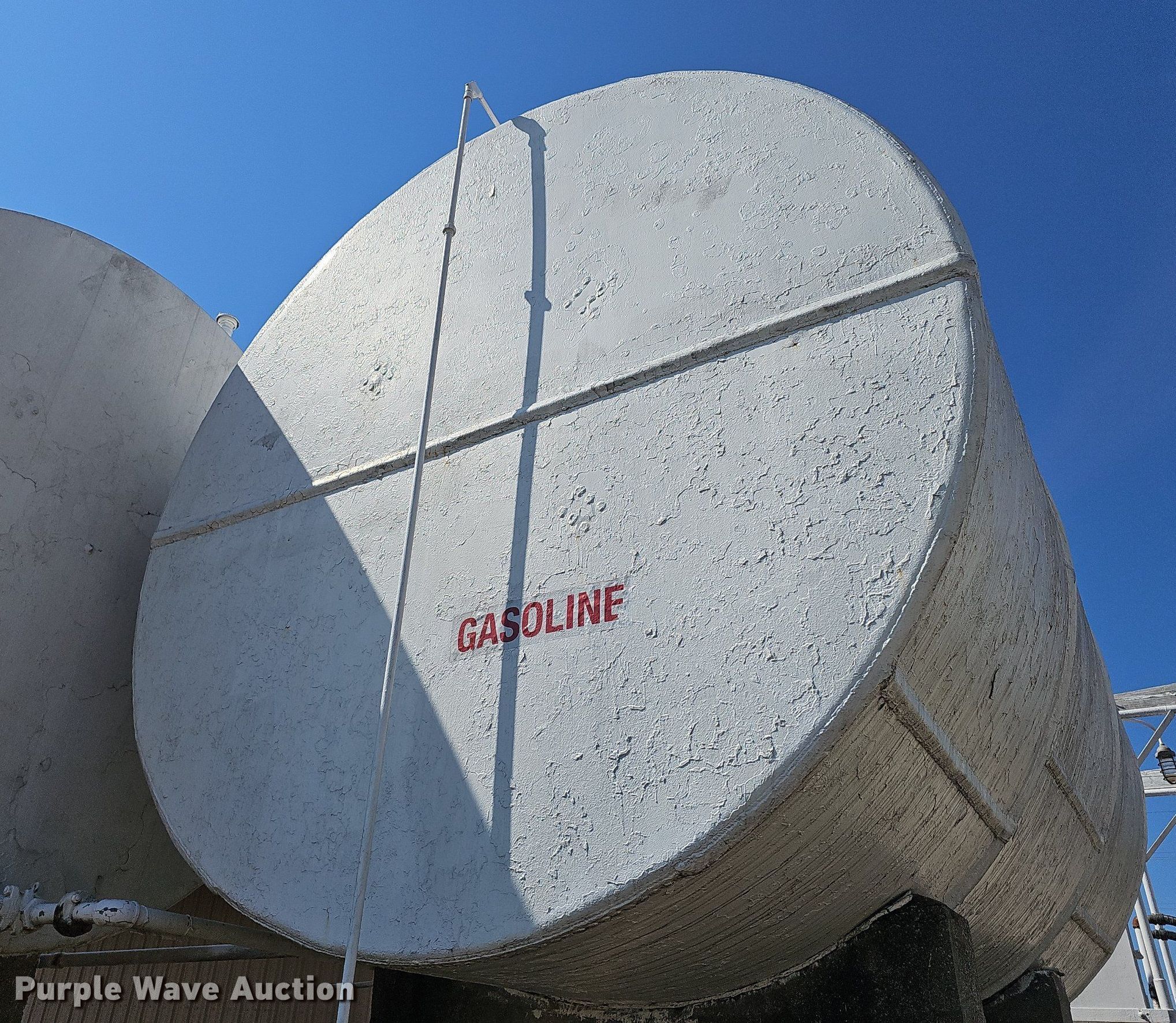 Purple Wave is selling a used Fuel and Lube in Kansas. This item is a (2) fuel tanks with the following: Dyed diesel, 31' L x 11' diameter, Capacity: 17,529 gallons, Gasoline, 16' L x 10' diameter, Capacity: 10,362 gallons