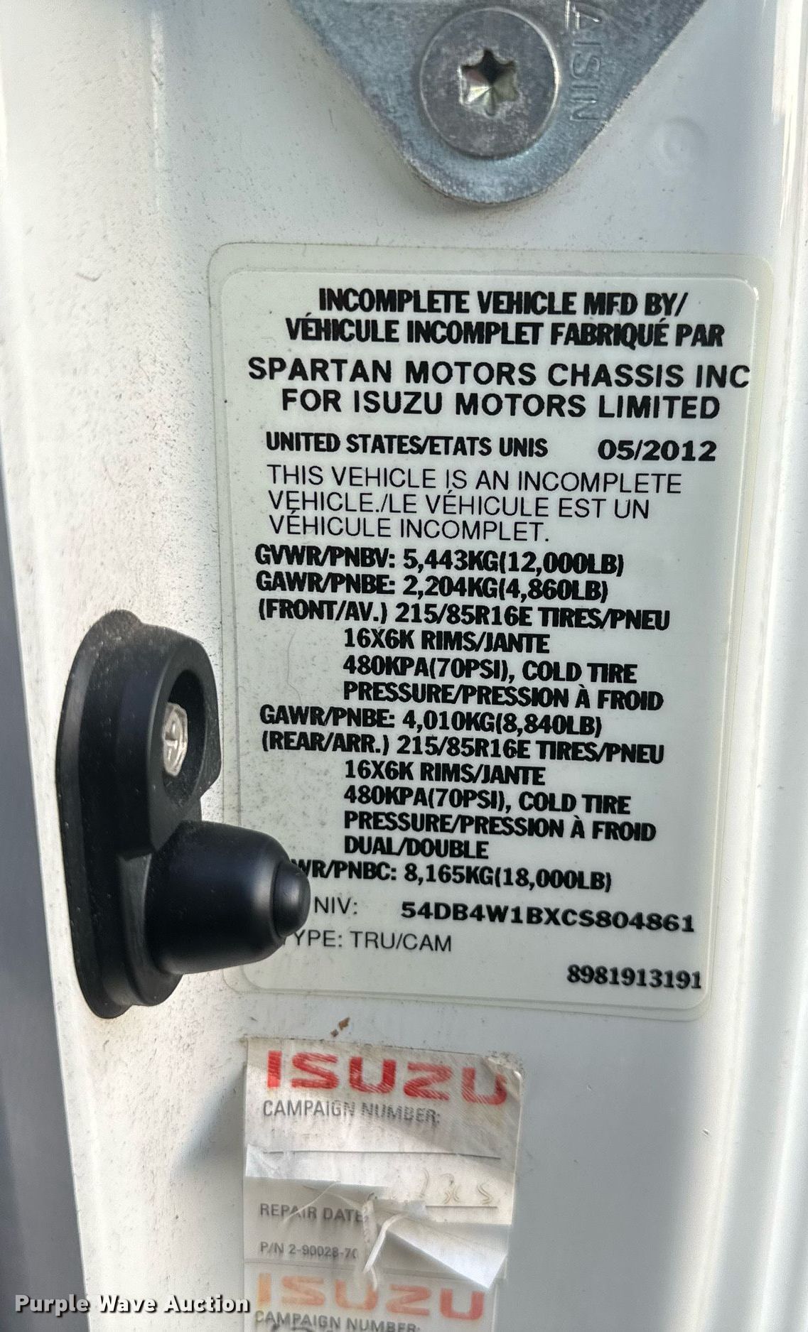Purple Wave is selling a used Applicator Truck in Kansas. This item is a 2012 Isuzu L96 sprayer truck with the following: Miles: 116,442 on odometer, VIN: 54DB4W1BXCS804861