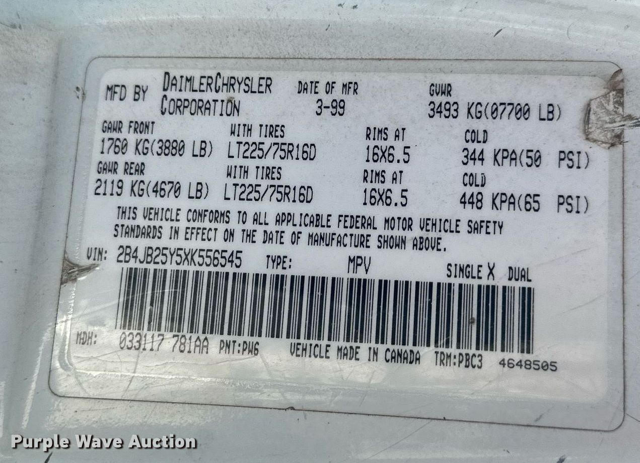 1999 Dodge Ram 2500 handicap accessible van. Miles: 177,436 on odometer, VIN: 2B4JB25Y5XK556545. Engine Displacement: 5.2L V8 OHV, Cylinders: 8, Fuel type: Gas. Transmission Automatic. Interior AC, Heat, Power windows, Power locks, Cruise control. Features Braun wheel chair lift. Tires Size: LT225/75R16. Notes Brake issue , Unknown operating condition. Kansas title. Title distribution may be delayed up to 14 days from verification of funds. Medicalodges Inc.. Atchison, KS 66002