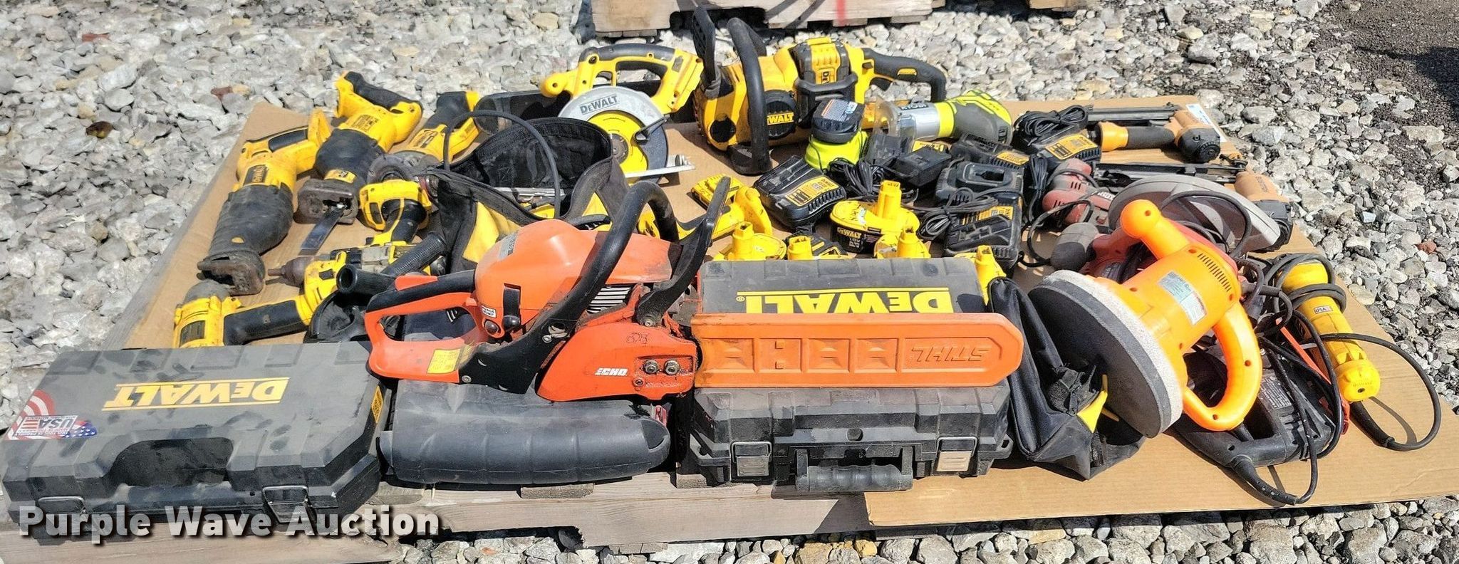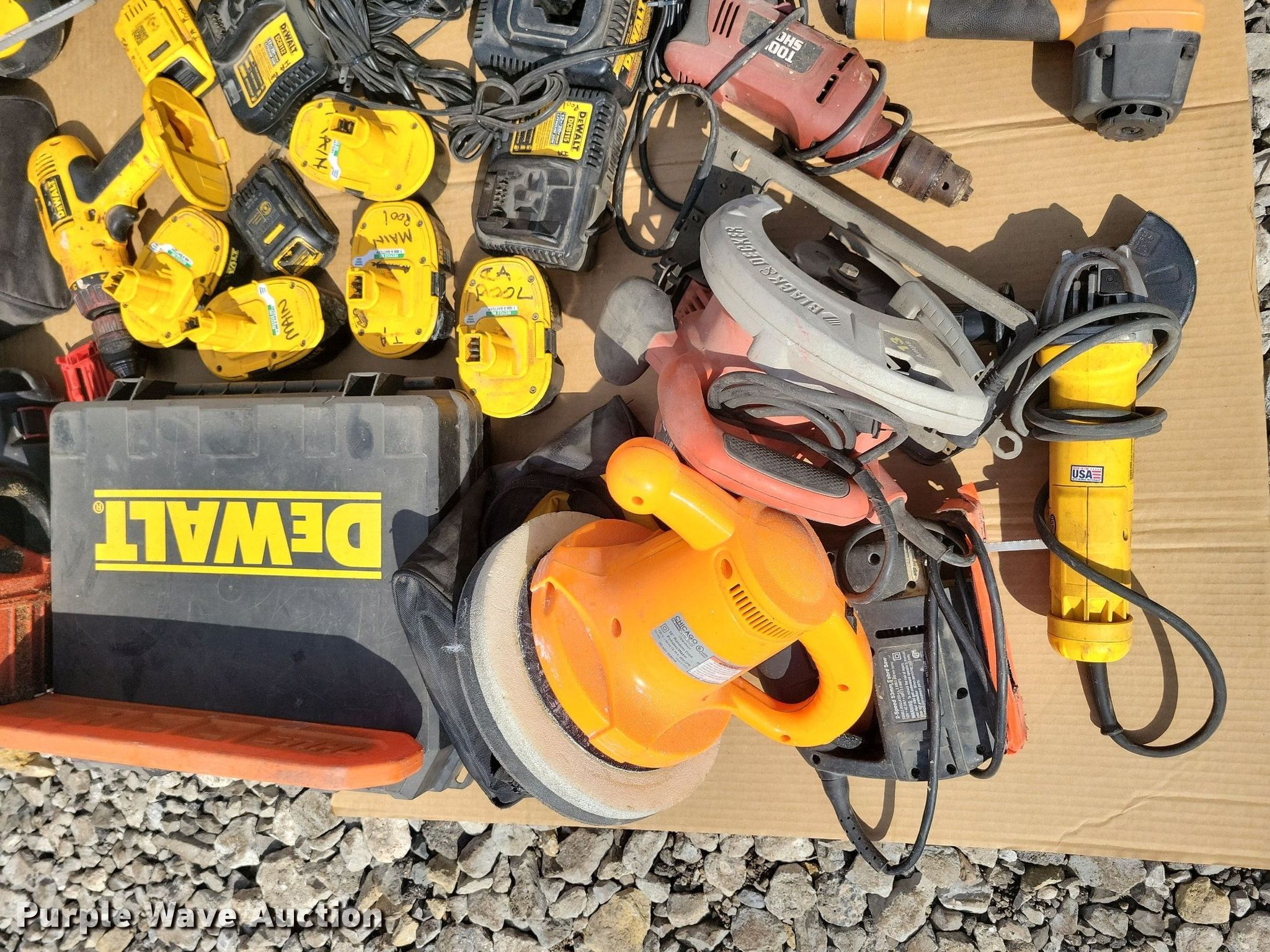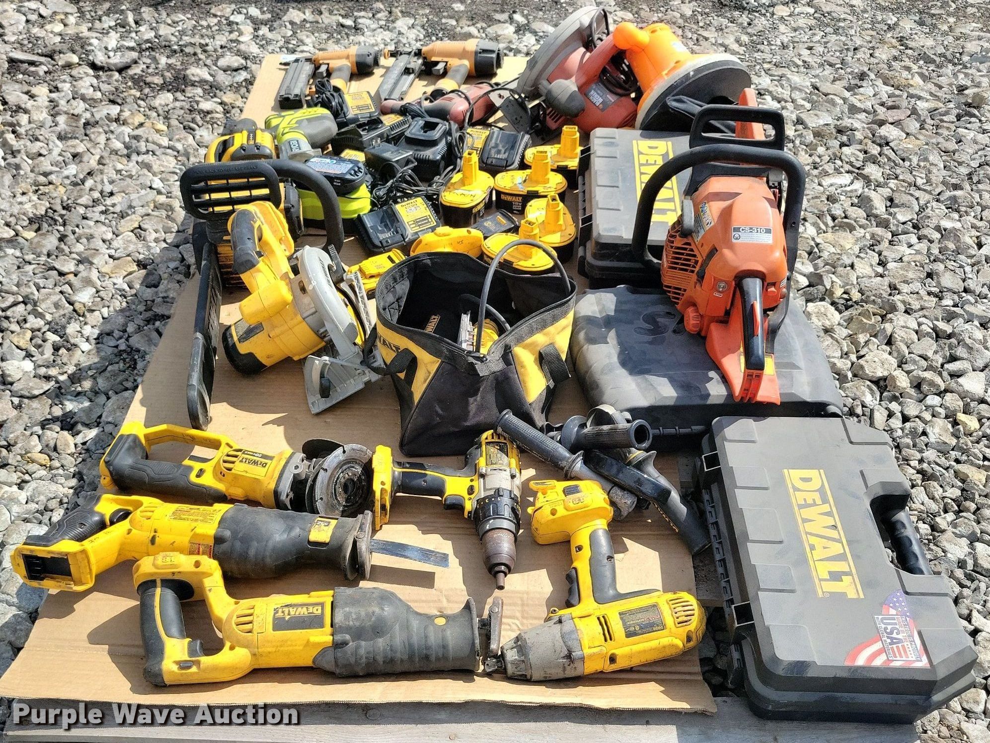 Purple Wave is selling a used Tools in Iowa. This item is a Tools with the following: DeWalt, Angle grinder, Chain saw, Sander, Skilsaw, Sawzall, Cordless impact, Batteries, Bostitch, Brad nailer, Tool Shop, Drill, Black and Decker, Skilsaw, Chicago, 10" polisher/waxer, Craftsman, Saber saw, Echo, Chain saw, Ryobi, Router