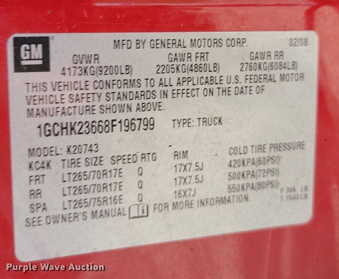 2008 Chevrolet Silverado 2500 Z71 Crew Cab pickup truck. Miles: 375,084 on odometer, VIN: 1GCHK23668F196799. Engine Displacement: 6.6L V8 OHV, Cylinders: 8, Fuel type: Diesel. Transmission Allison, Automatic, Four wheel drive. Interior AC, Heat, Seat: Power driver, Power passenger, Power windows, Power locks, Cruise control. Tires Size: 33X12.50R20LT. Notes Dash warning indicator: Check engine, ABS, Windshield chipped or cracked. Kansas title. Title distribution may be delayed up to 14 days from verification of funds. Fredonia, KS 66736