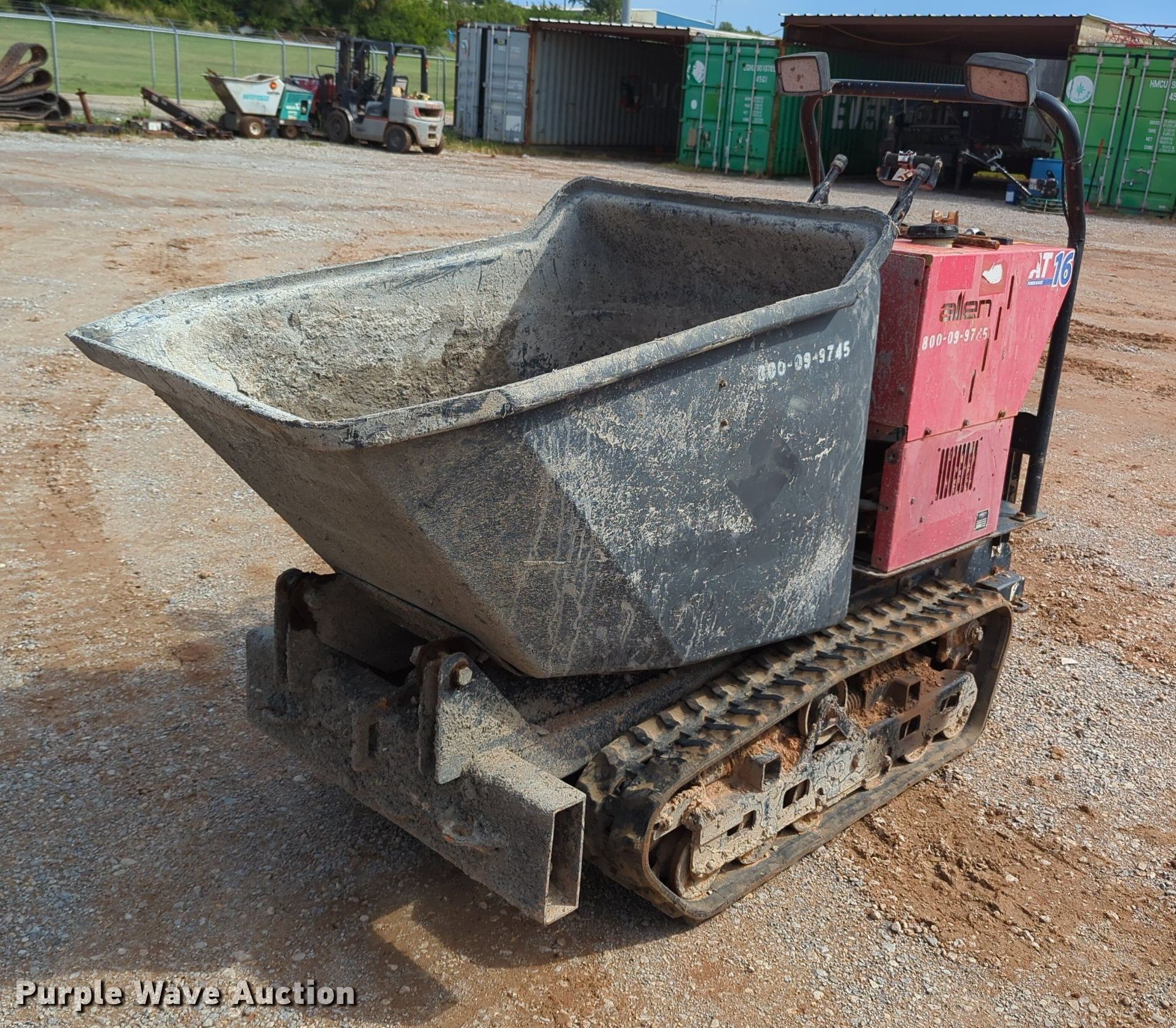 Allen AT16 power buggy. Hours: 395 on meter, Serial: T160415007. Engine Kohler, Cylinders: 2, Fuel type: Gas. Transmission Hydrostatic. Features Dump hopper Capacity: 1,500 lbs. Tracks Width: 7", Rubber. Notes Unknown operating condition. Cantera Concrete Company. 820 N May Ave. Oklahoma City, OK 73107