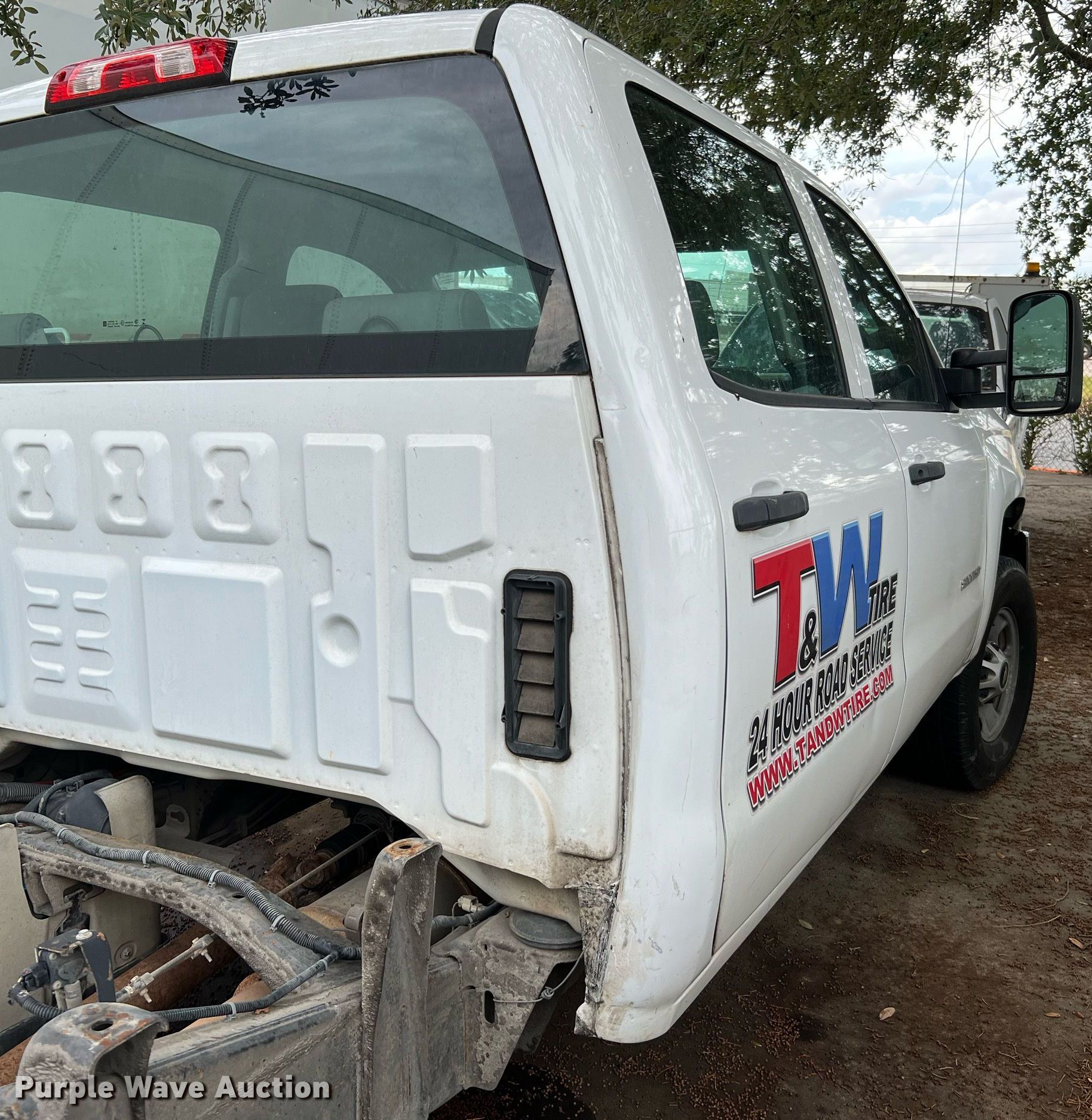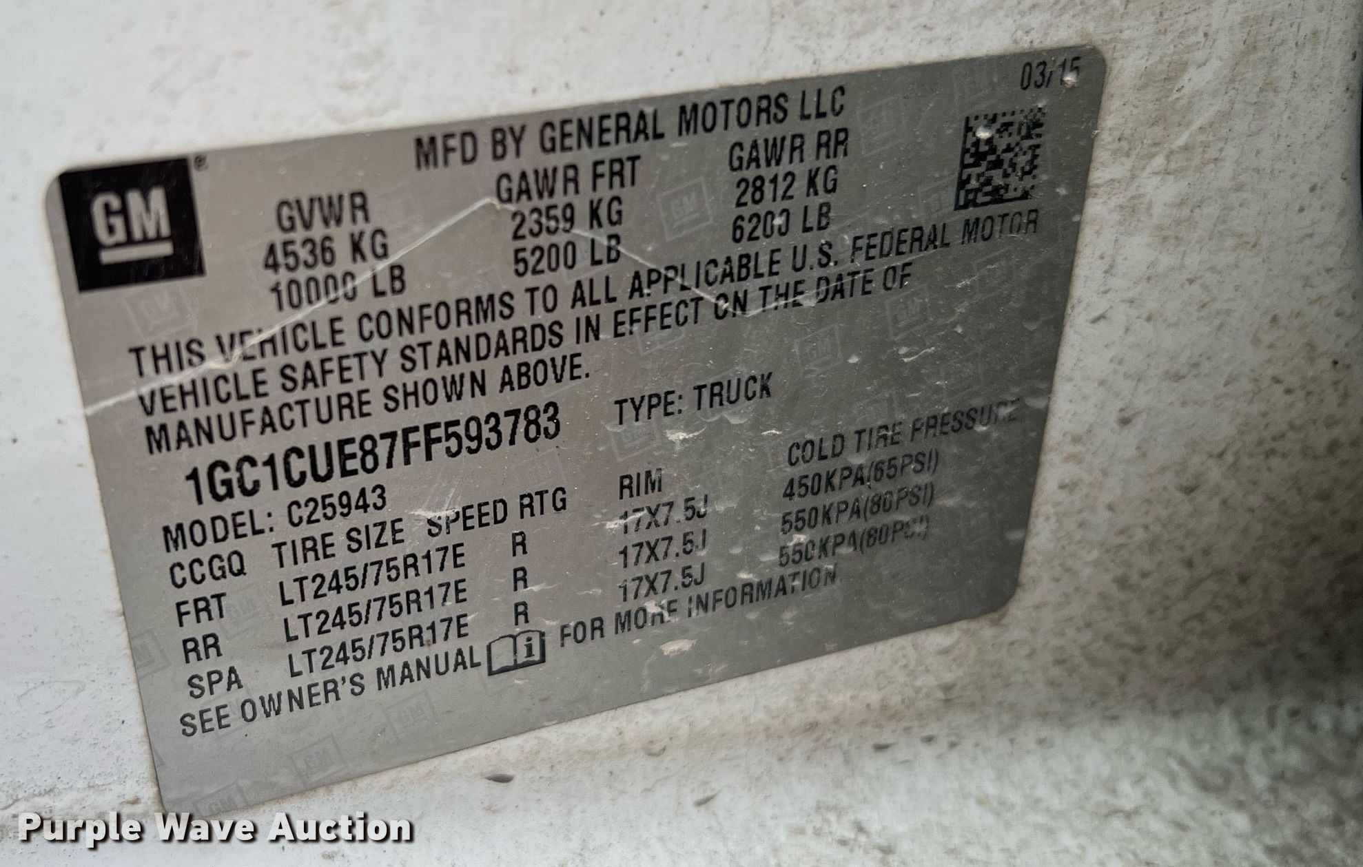 2015 Chevrolet Silverado 2500HD Crew Cab pickup truck cab and chassis. Miles: 307,875 on odometer, VIN: 1GC1CUE87FF593783, Unit #: 389. Engine Displacement: 6.6L V8 OHV, Cylinders: 8, Fuel type: Diesel. Transmission Automatic. Interior AC, Heat, Power windows, Power locks, Cruise control. Features Hitch: Gooseneck. Tires Size: 285/70R17. Notes Contents not included, Windshield chipped or cracked, Dead battery, Non-operational unit. Texas title. Title distribution may be delayed up to 14 days from verification of funds. T&W Tire. 3130 E Pasadena Freeway. Pasadena, TX 77503
