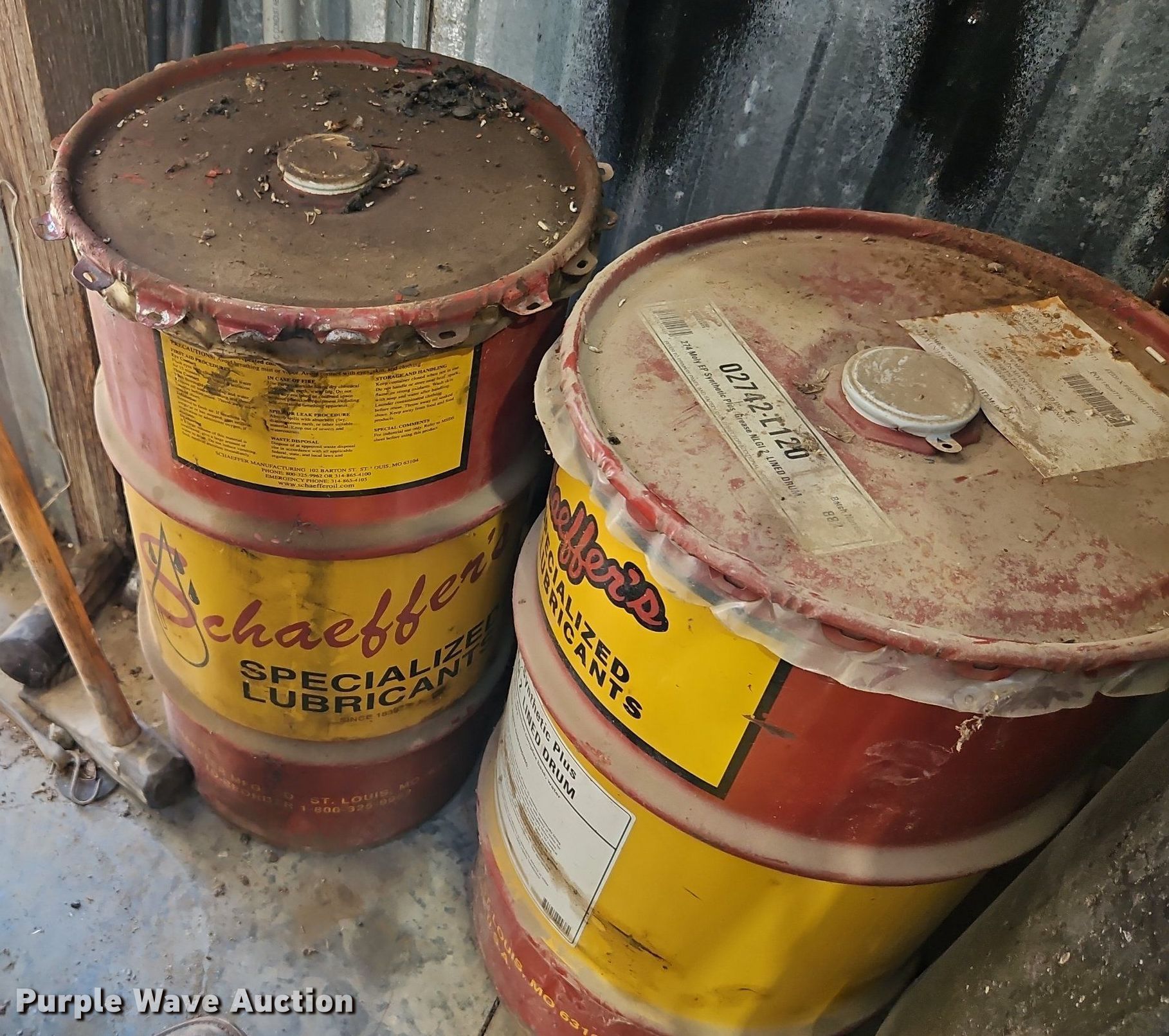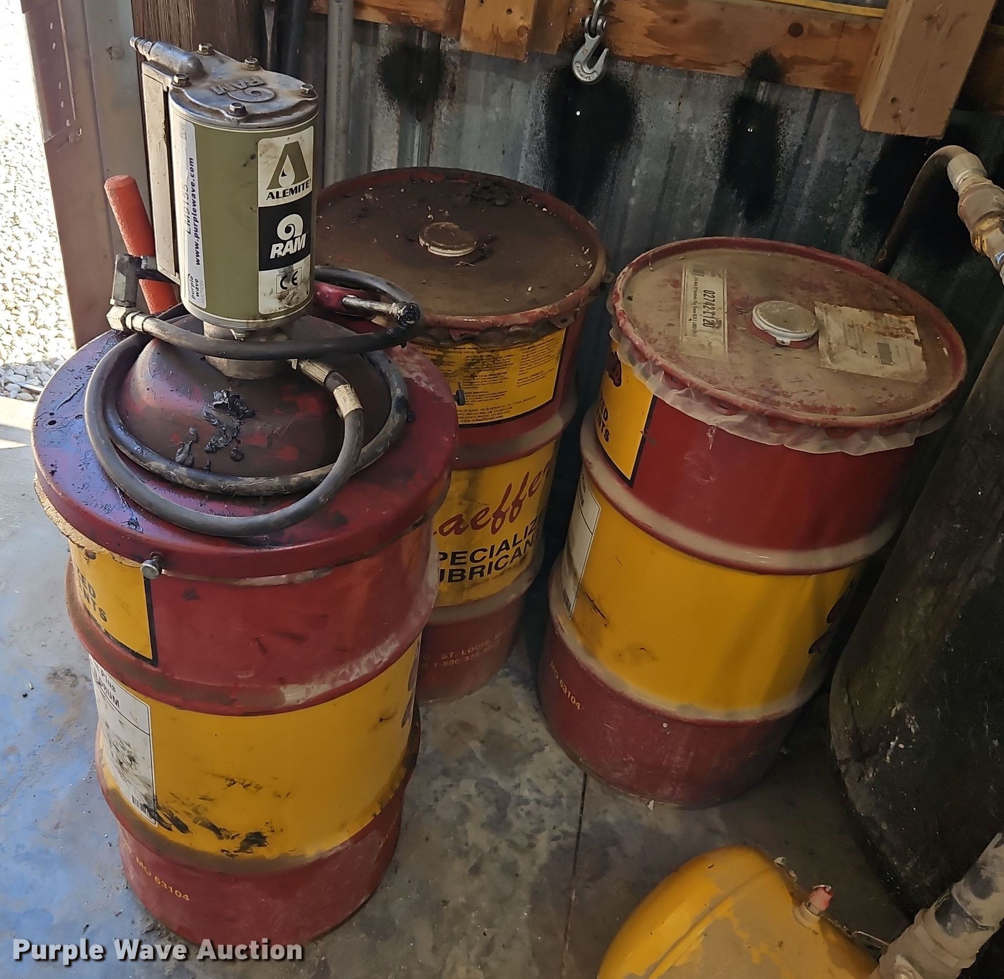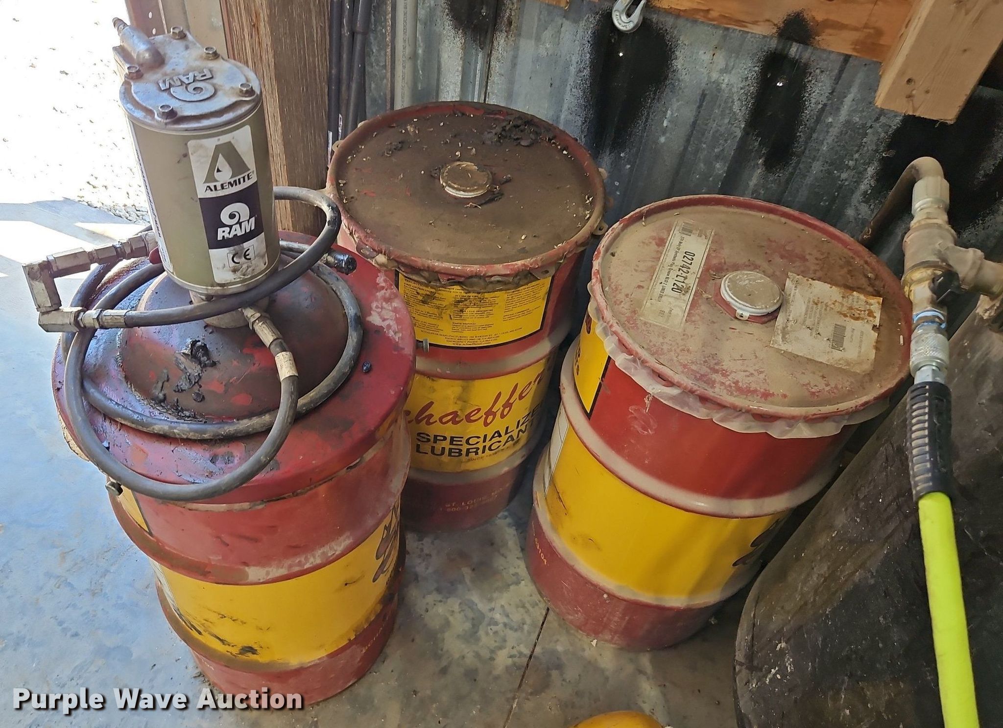 Purple Wave is selling a used Tools in Kansas. This item is a Alamite Ram pneumatic grease pump with the following: (3) barrels of Schaeffer's grease, 33 gallon, (1) unused, (2) partial