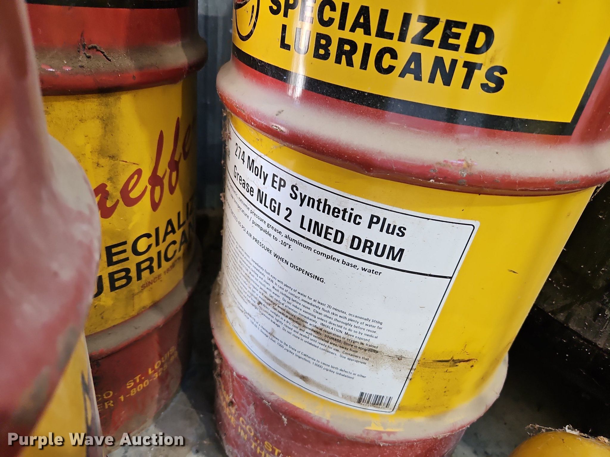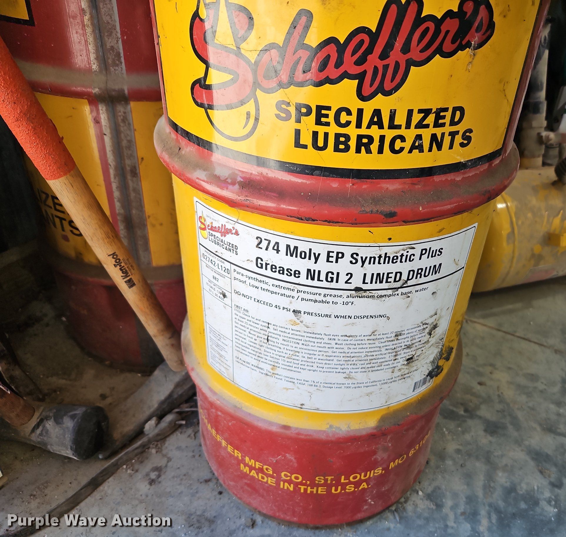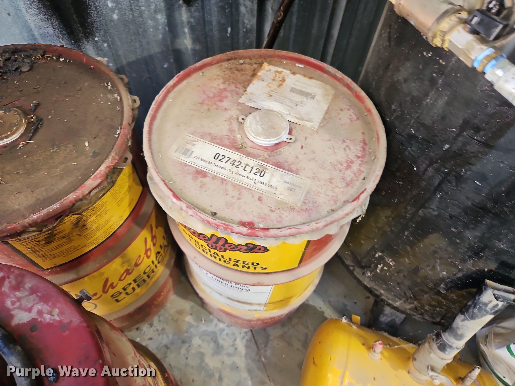 Purple Wave is selling a used Tools in Kansas. This item is a Alamite Ram pneumatic grease pump with the following: (3) barrels of Schaeffer's grease, 33 gallon, (1) unused, (2) partial