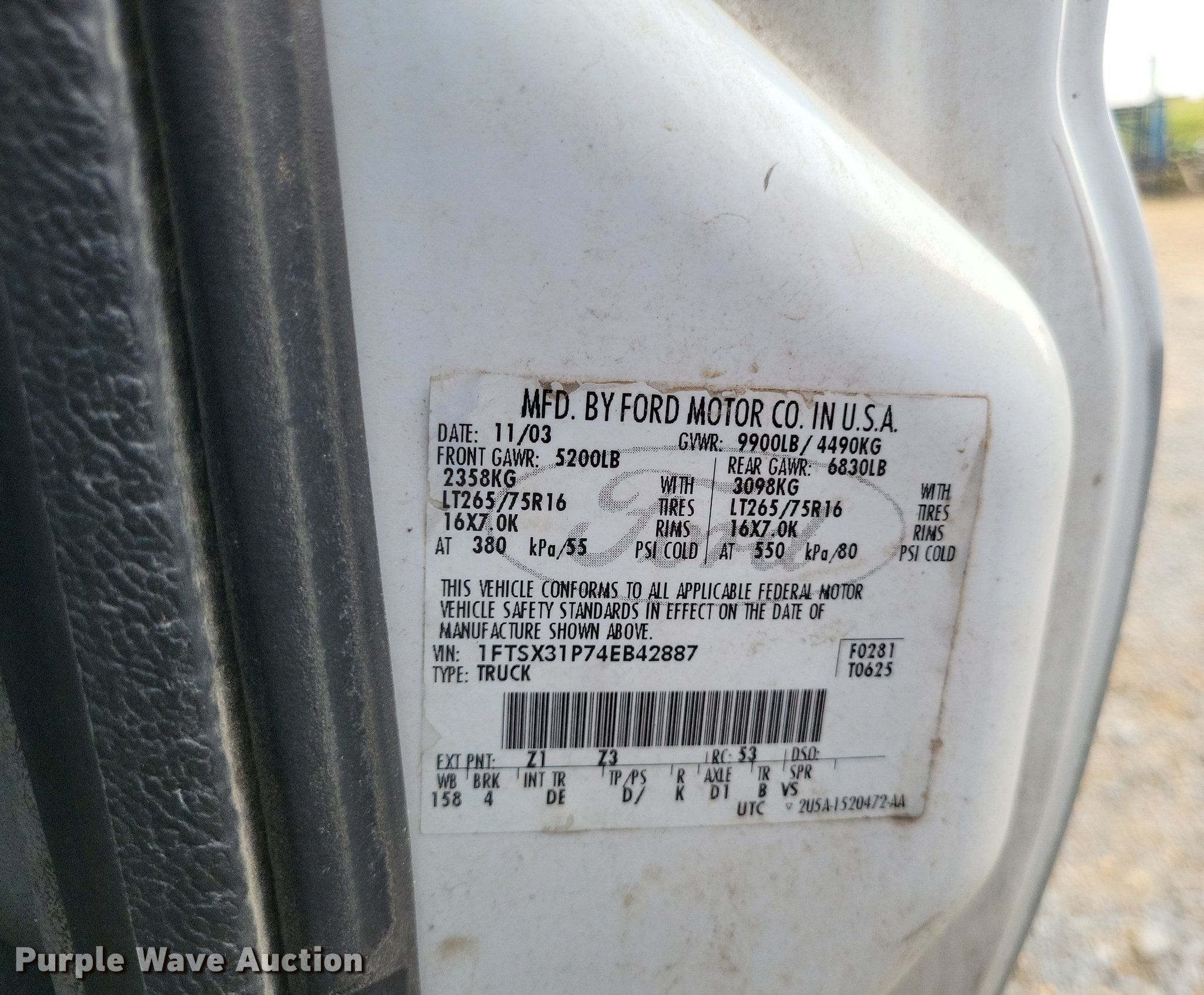 Purple Wave is selling a used 3/4 or 1 Ton Pickup or Van in Missouri. This item is a 2004 Ford F350 Super Duty XLT SuperCab pickup truck with the following: Miles: 337,865 on odometer, VIN: 1FTSX31P74EB42887