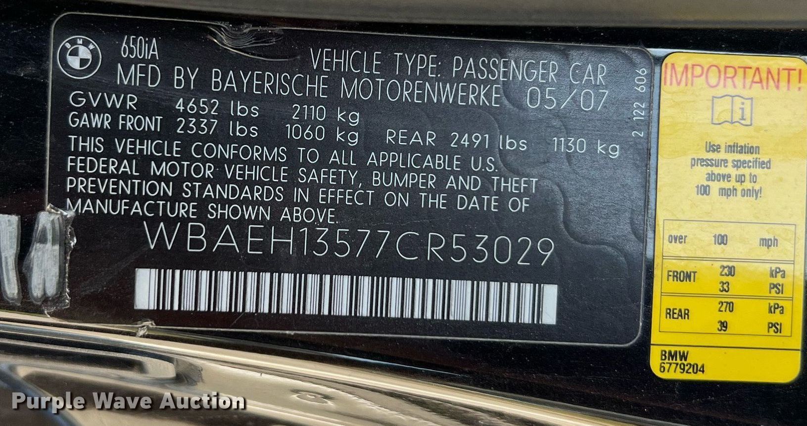 Purple Wave is selling a used Passenger Vehicle in Texas. This item is a 2007 BMW 650i with the following: Miles: 114,299 on odometer, Miles or hours may vary, unit still in use, VIN: WBAEH13577CR53029