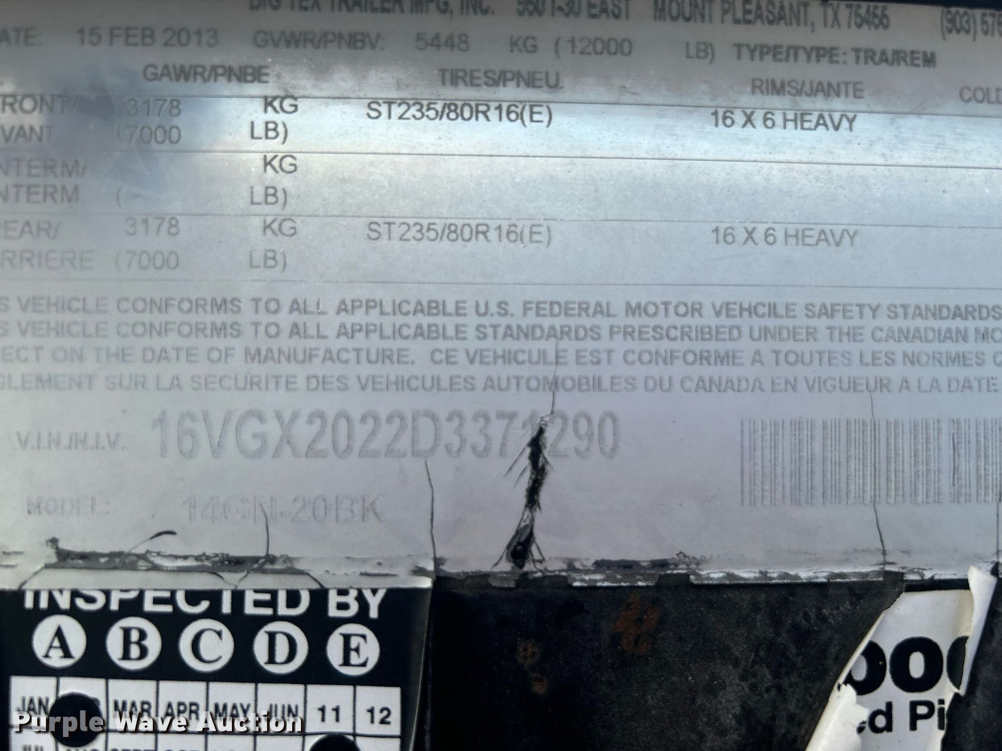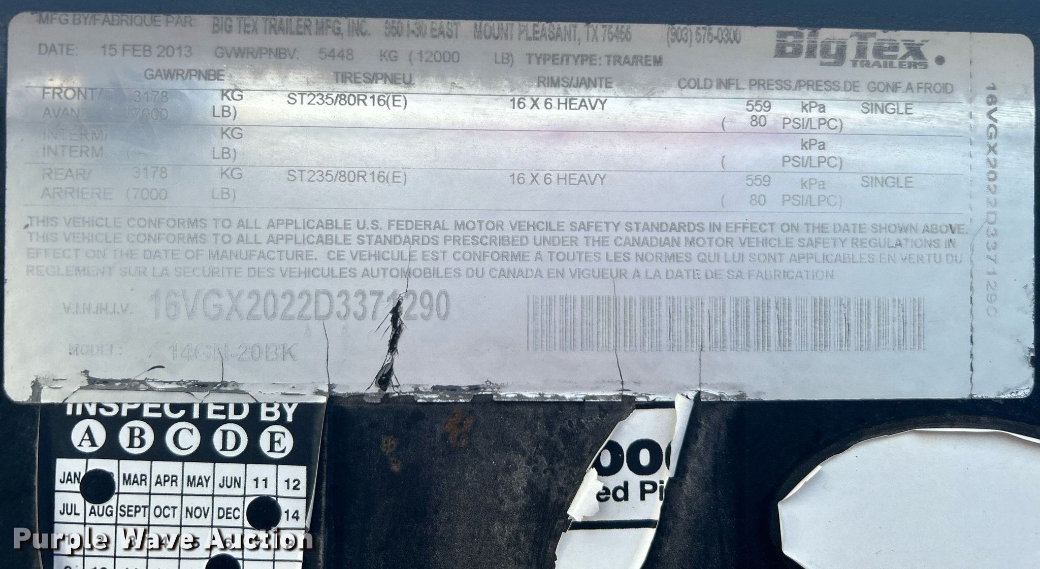 Purple Wave is selling a used Equip. Trailer in Oklahoma. This item is a 2013 Big Tex 14GN-20BK equipment trailer with the following: VIN: 16VGX2022D3371290