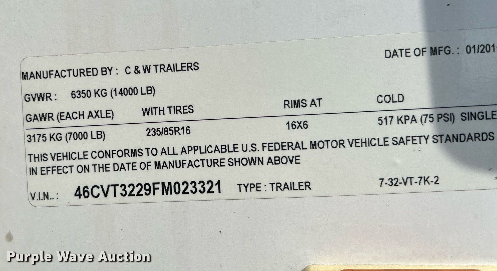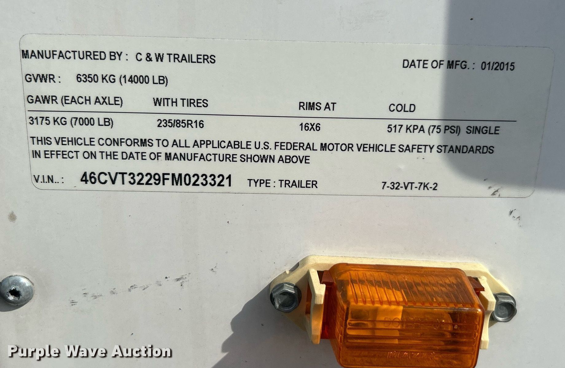 Purple Wave is selling a used Enclosed Cargo Trailer in Oklahoma. This item is a 2015 C&W trailers 732VT7K2 enclosed cargo trailer with the following: VIN: 46CVT3229FM023321