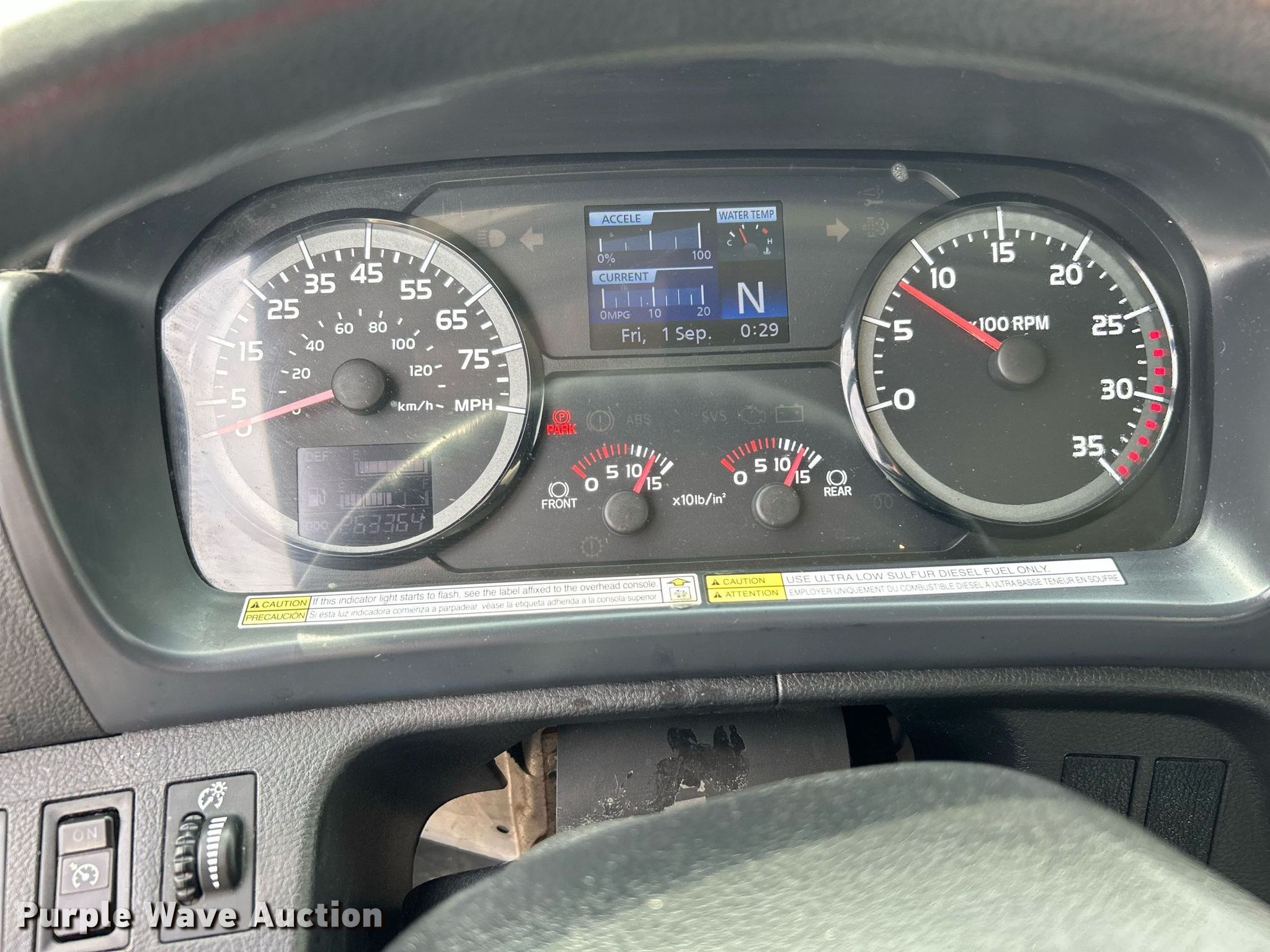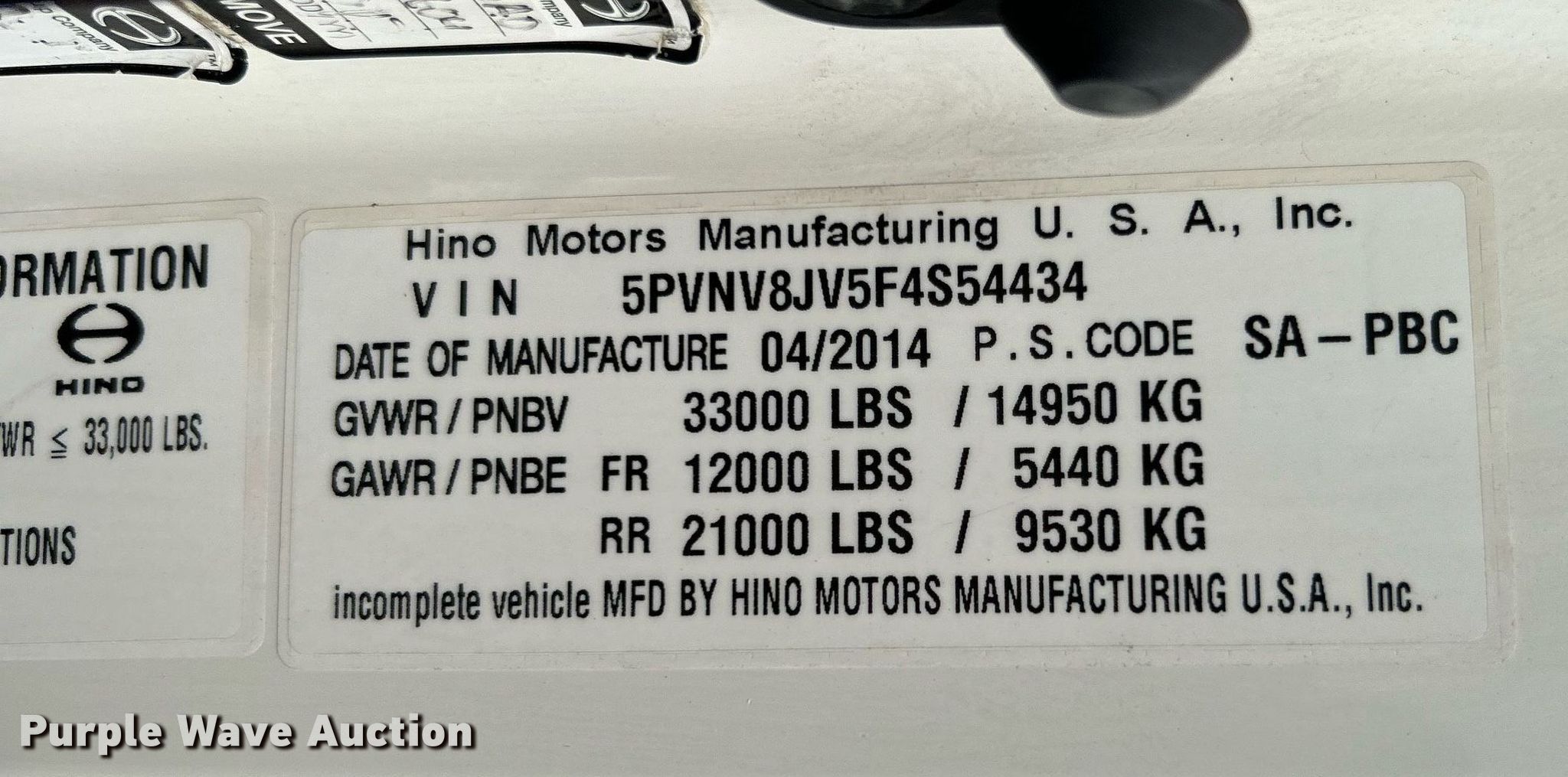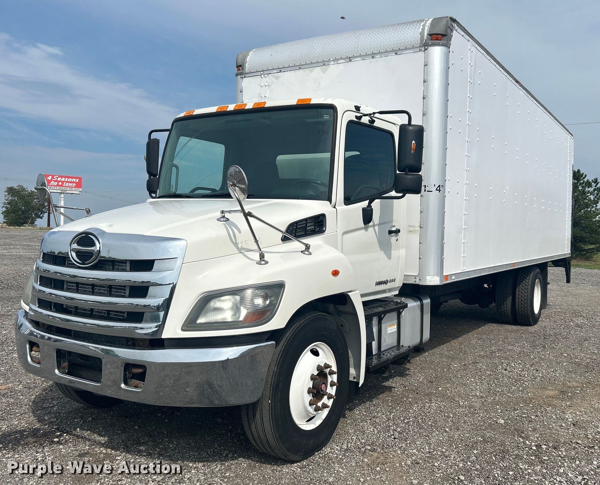2015 Hino 338 box truck. Miles: 263,364 on odometer, VIN: 5PVNV8JV5F4S54434. Engine Fuel type: Diesel. Transmission Automatic. Chassis Axles: Single, Suspension: Spring, Brakes: Air. Interior AC, Heat, Power windows, Cruise control. Features Box bed Supreme Corp , 26' L x 101" W x 99" H, End gate lift Maxon RC, Capacity: 3,000 lbs.. Tires Front: 295/75R22.5. Notes Windshield chipped or cracked. Oklahoma title. Title distribution may be delayed up to 14 days from verification of funds. 15107 North 137th East Avenue. Collinsville, OK 74021