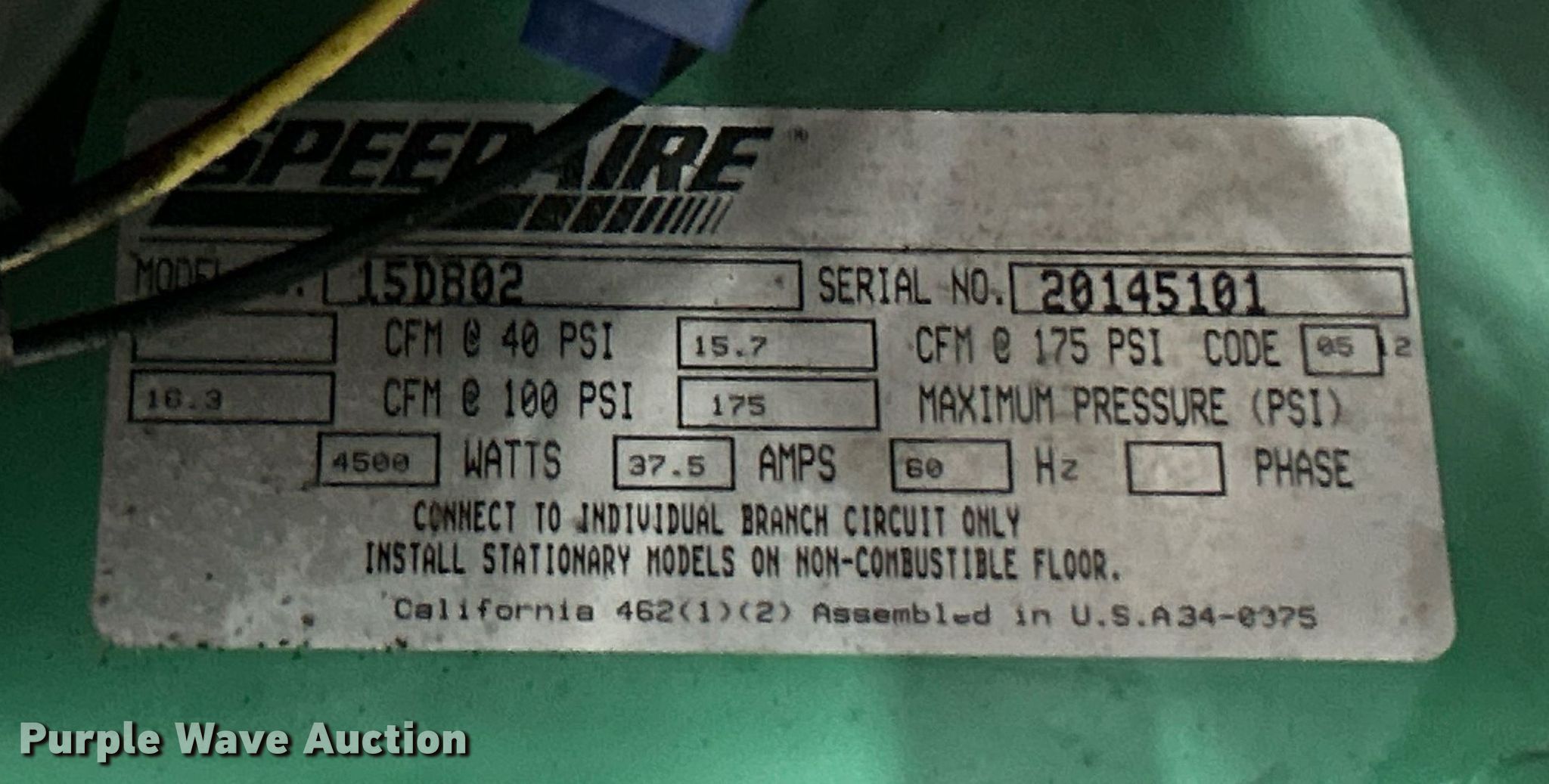 Purple Wave is selling a used Welder (Manual) in Oklahoma. This item is a Speed Aire 15D802 welder/generator with the following: Serial: 20145101