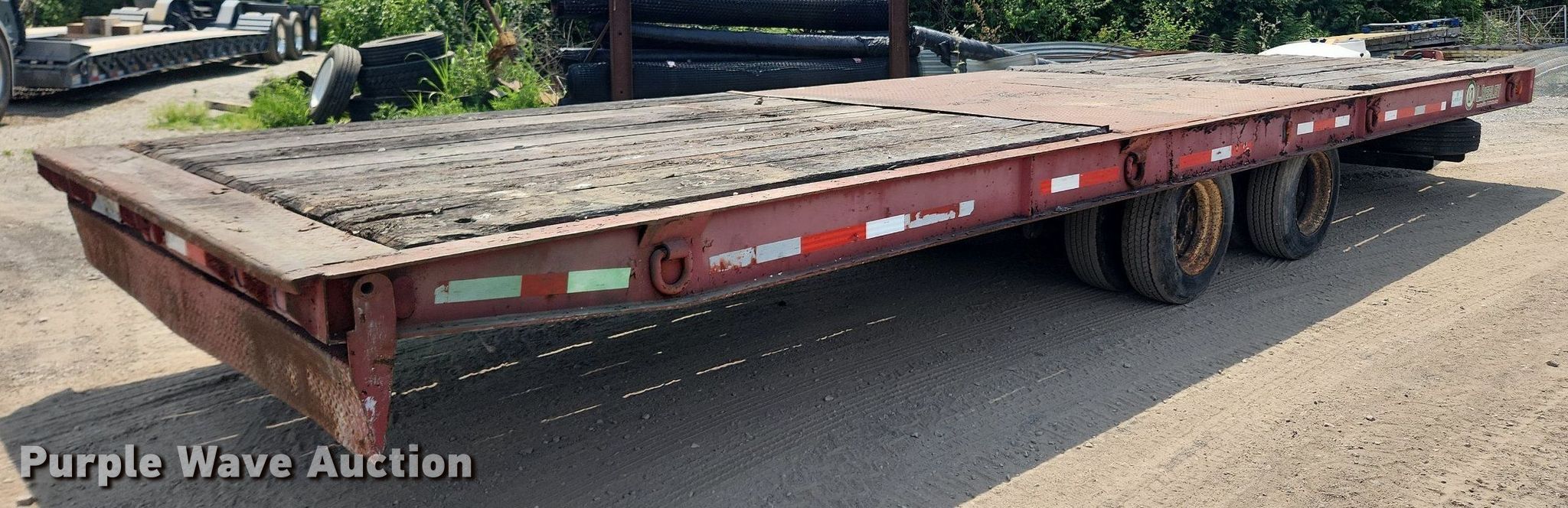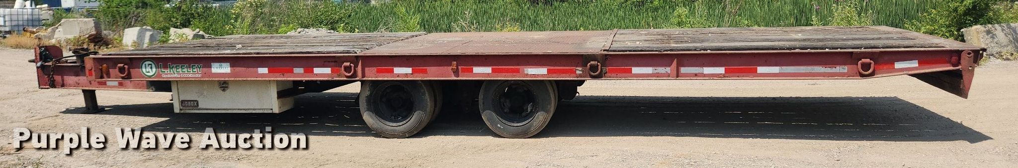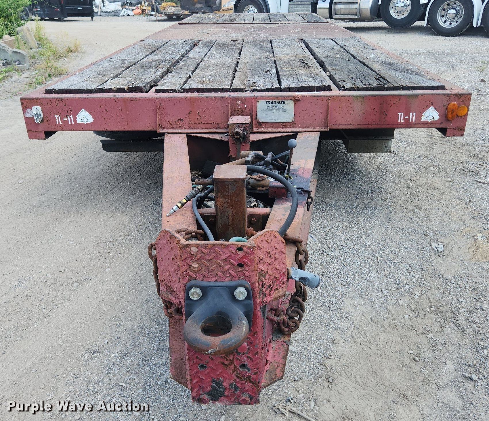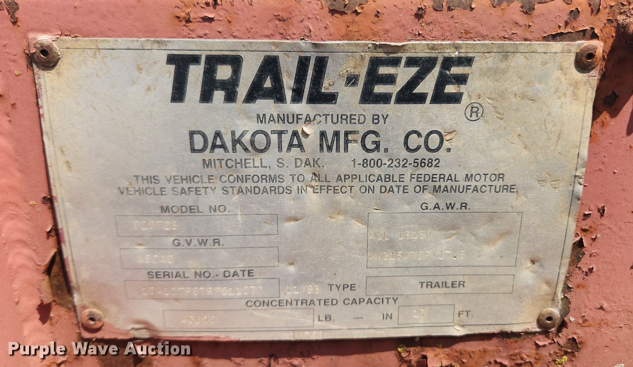 1994 Trail-Eze D20T28 tilt deck equipment trailer. VIN: 1DA12TP97RP011070. Dimensions Overall: 34' L x 102" W, Deck: 28' L x 102" W. Features Deck type: Wood. Chassis Hitch: Pintle, Landing gear: Single, Suspension: Spring, Brakes: Air, Axles: Tandem, GVWR: 48,240 lbs, GAWR: 16,160 lbs. Tires Steel wheels, Size: 215/75R17. Keeley Construction. Cahokia, IL 62206