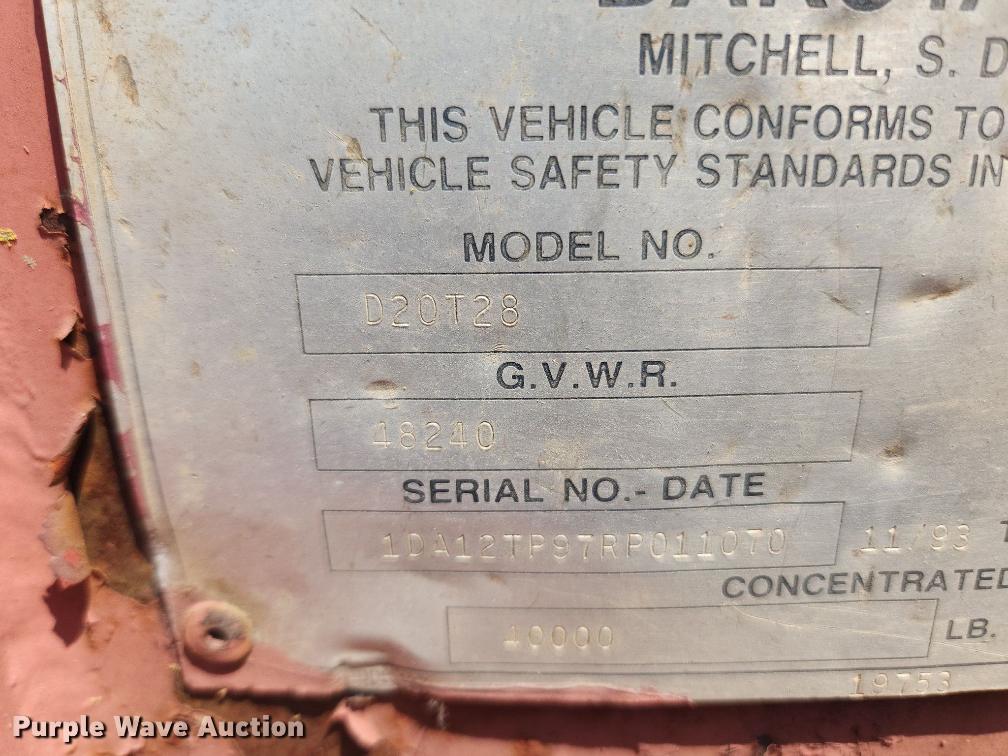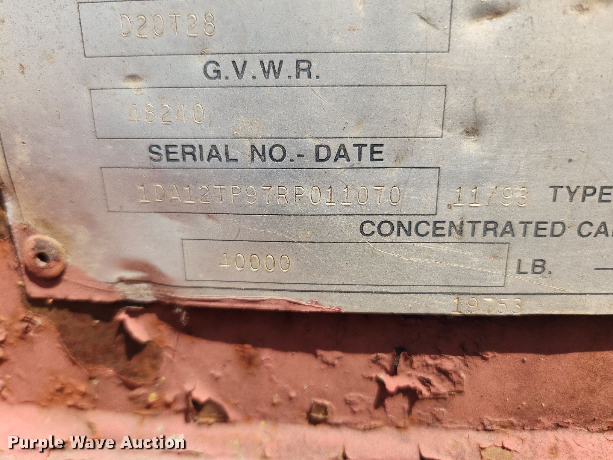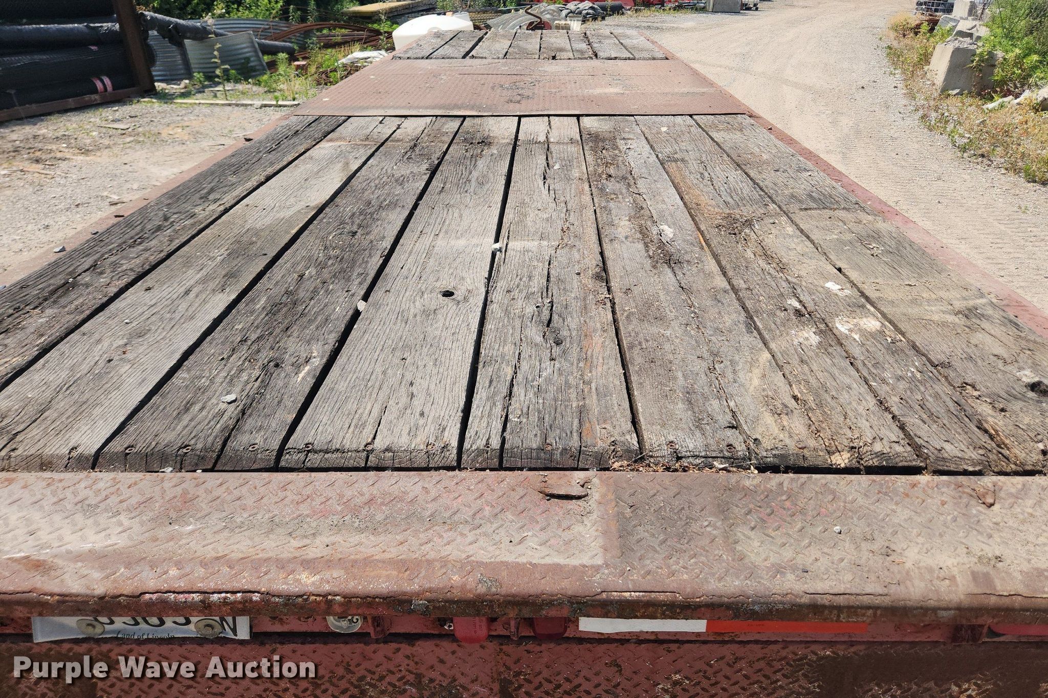1994 Trail-Eze D20T28 tilt deck equipment trailer. VIN: 1DA12TP97RP011070. Dimensions Overall: 34' L x 102" W, Deck: 28' L x 102" W. Features Deck type: Wood. Chassis Hitch: Pintle, Landing gear: Single, Suspension: Spring, Brakes: Air, Axles: Tandem, GVWR: 48,240 lbs, GAWR: 16,160 lbs. Tires Steel wheels, Size: 215/75R17. Keeley Construction. Cahokia, IL 62206