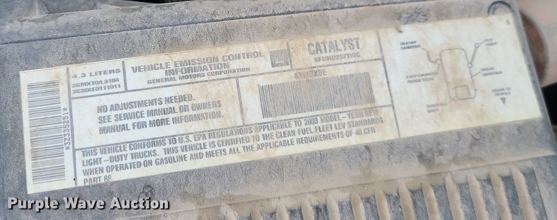 2003 Chevrolet Silverado 1500 pickup truck. Miles: 177,154 on odometer, VIN: 1GCEC14X73Z335251. Engine Displacement: 4.3L V6 OHV , Cylinders: 6, Fuel type: Gas. Transmission Automatic. Interior AC, Heat, Cruise control. Tires Size: 265/70R17. Notes Dash warning indicator: Check engine, Windshield chipped or cracked. Montana title. Title distribution may be delayed up to 14 days from verification of funds. W. Summers LLC. 8093 Lookout Point Rd. Odessa, MO 64076