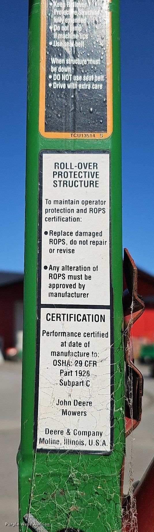 John Deere 1435 Series II lawn mower. Hours: 938 on meter, Cutting width: 72", Serial: TC1435D070214. Engine Yanmar 3RNV76-DJMA, Serial: CH3011D228896, Displacement: 1.116L, Cylinders: 3, Fuel type: Diesel, kW: 19.2. Transmission Hydrostatic. Chassis Four wheel drive. Operators station OROPS. Features Counter weights, Mower deck Width: 72", John Deere F1400, Serial: TC1472X070484, Hydraulic front deck lift, Rear suitcase weights. Tires Front: 23x10.50-12, Rear: 18x8.50-10. Jordan Machinery / S & N Auto Sales. 25050 US Hwy 275. Waterloo, NE 68069