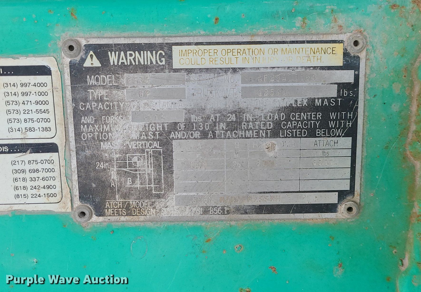 Mitsubishi FG35 forklift. Hours: 8,740 on meter, Serial: AF29S00069. Engine Cylinders: 6, Fuel type: LPG. Transmission Powershift. Operators station Canopy. Features Maximum lift capacity: 8,000 lbs, Maximum lift height: 148", Mast stages: 2, Side shift, Mast tilt, Fork length: 48". Tires Front: 7.50-16, Rear: 7-12. La Crosse Lumber Company. Marshall, MO 65340