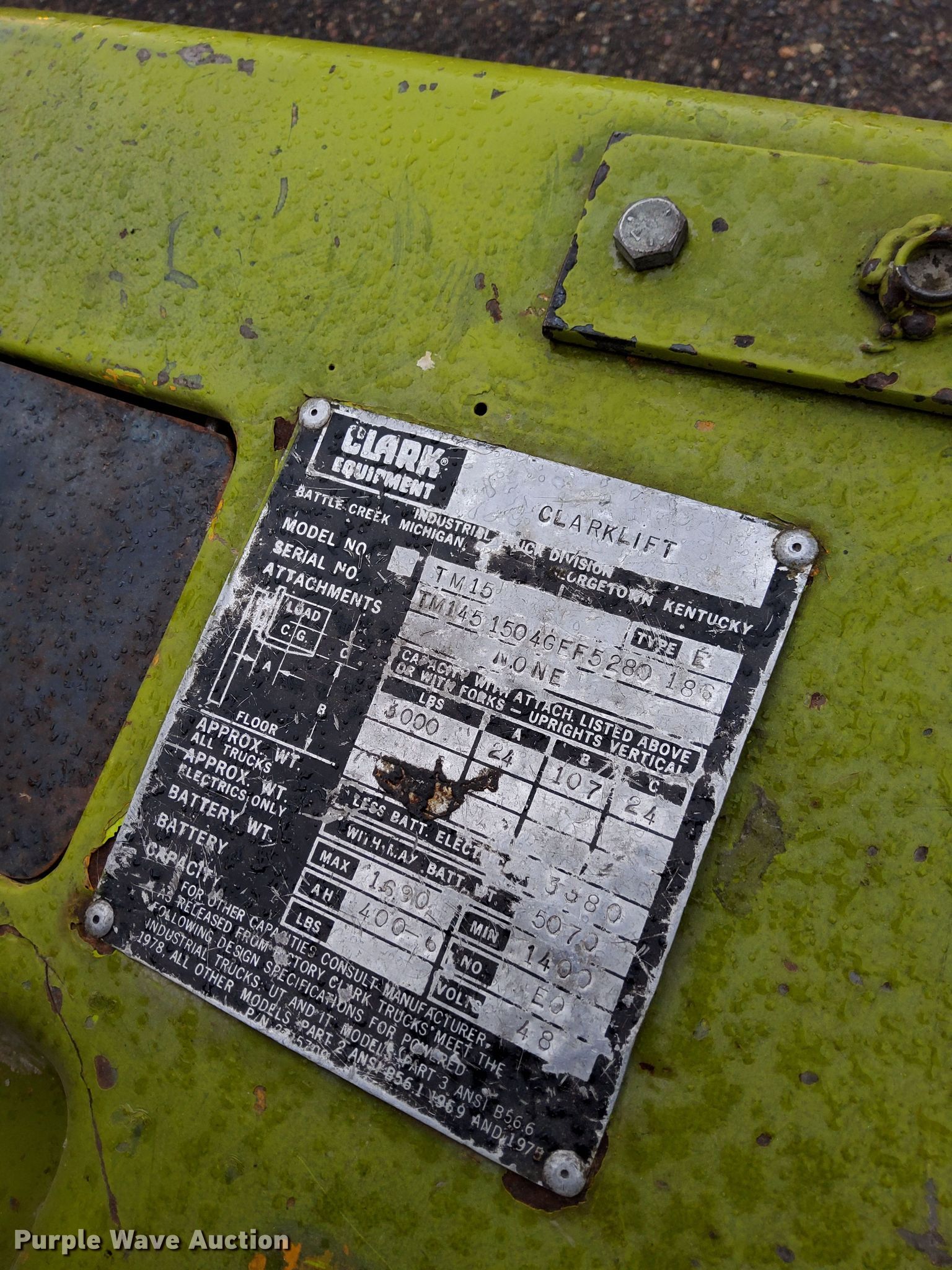 Purple Wave is selling a used Warehouse Forklift in Minnesota. This item is a Clark TM15 forklift with the following: Hours: 9,306 on meter, Serial: TM1451504GEF280186