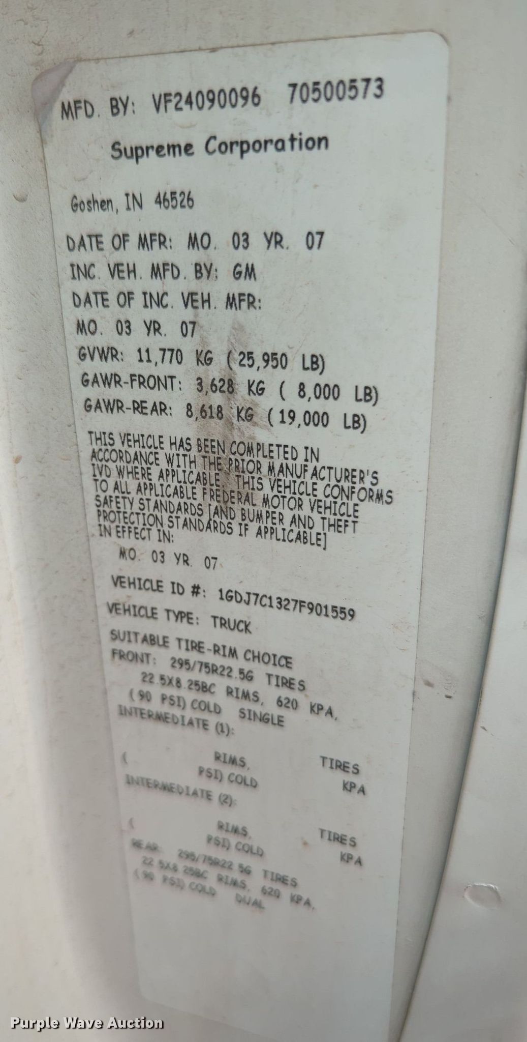 2007 GMC 7500 box truck. Miles: 331,137 on odometer, VIN: 1GDJ7C1327F901559. Engine Displacement: 7.8L, Cylinders: 6, Fuel type: Diesel. Transmission Automatic. Chassis Axles: Single, Suspension: Spring, Brakes: Hydraulic, GVWR: 25,950 lbs. Interior AC, Heat. Features Box bed 24' L x 96" W x 96" H, Floor: Wood, Slider ramp. Tires Size: 295/75R22.5. Notes Hail damage. Oklahoma title. Title distribution may be delayed up to 14 days from verification of funds. Tynath logistics. 1111 S Council Rd. Oklahoma City, OK 73128