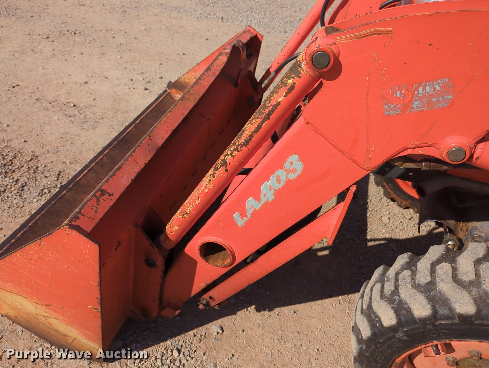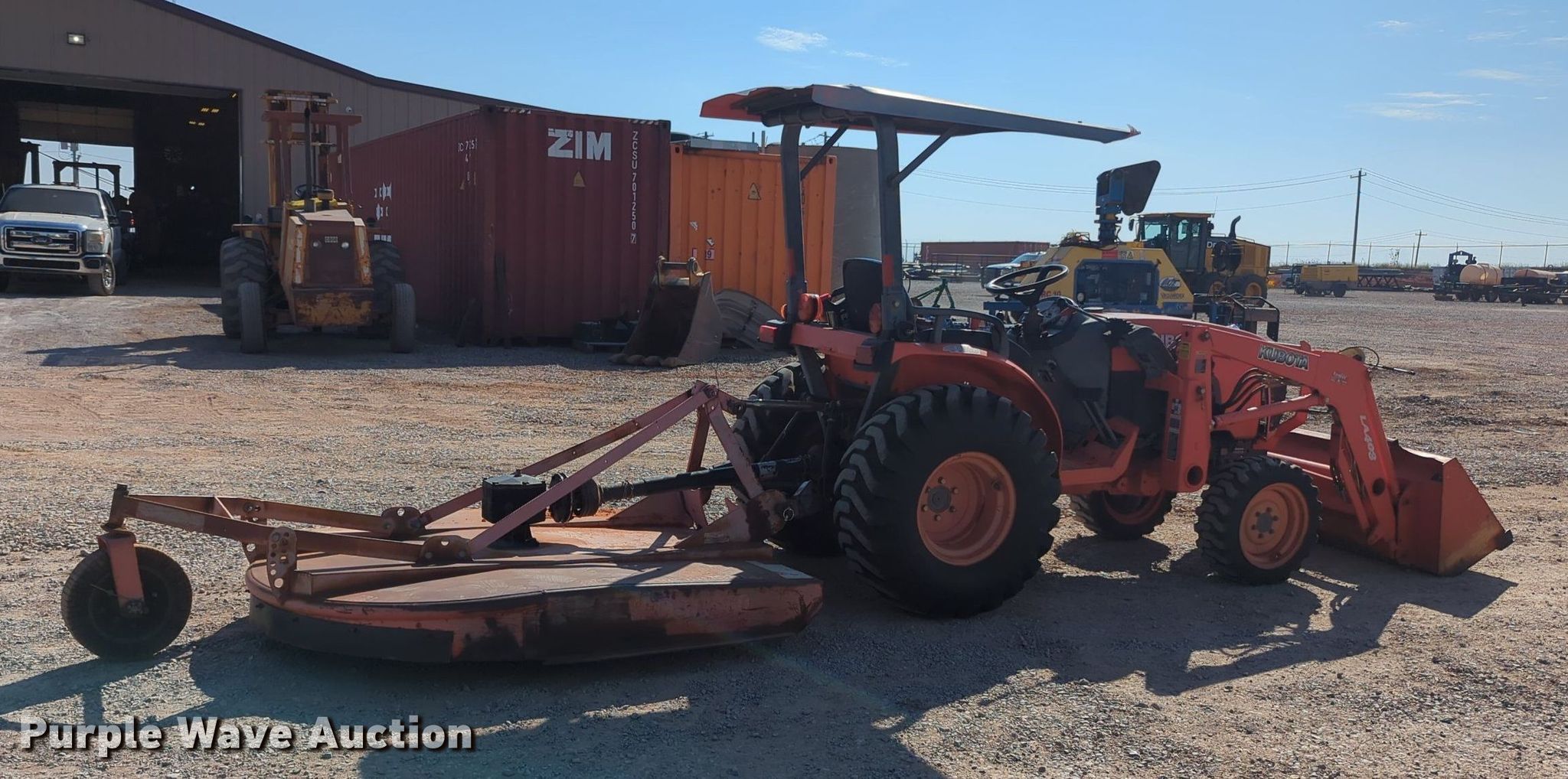 Kubota B3030 MFWD tractor. Hours: 803 on meter, Serial: B3030HSD50171. Engine Kubota , Cylinders: 4, Fuel type: Diesel. Transmission Hydrostatic. Features PTO: 540, Top link, Loader Kubota LA403, Controls: Joystick, Bucket Width: 54", Woods rotary mower Width: 60". Tires Front: 23x8.50-14, Rear: 12 4-16. Okie Construction & Welding. 600 West Commerce Road. Clinton, OK 73601
