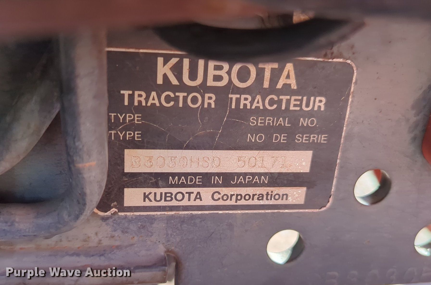 Purple Wave is selling a used Tractor in Oklahoma. This item is a Kubota B3030 MFWD tractor with the following: Hours: 803 on meter, Serial: B3030HSD50171