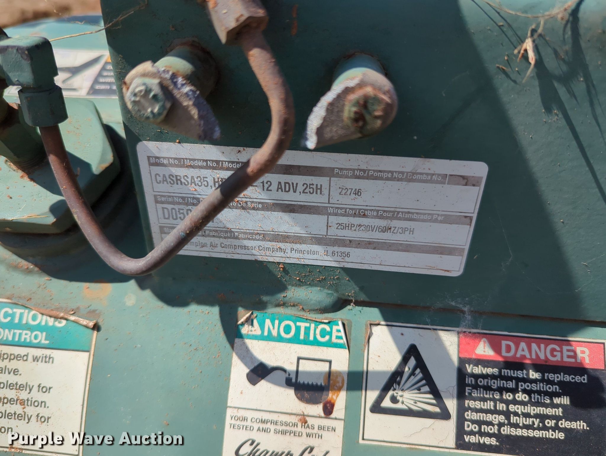 Purple Wave is selling a used Air Compressor in Oklahoma. This item is a Champion air compressor with the following: Volts: 240
