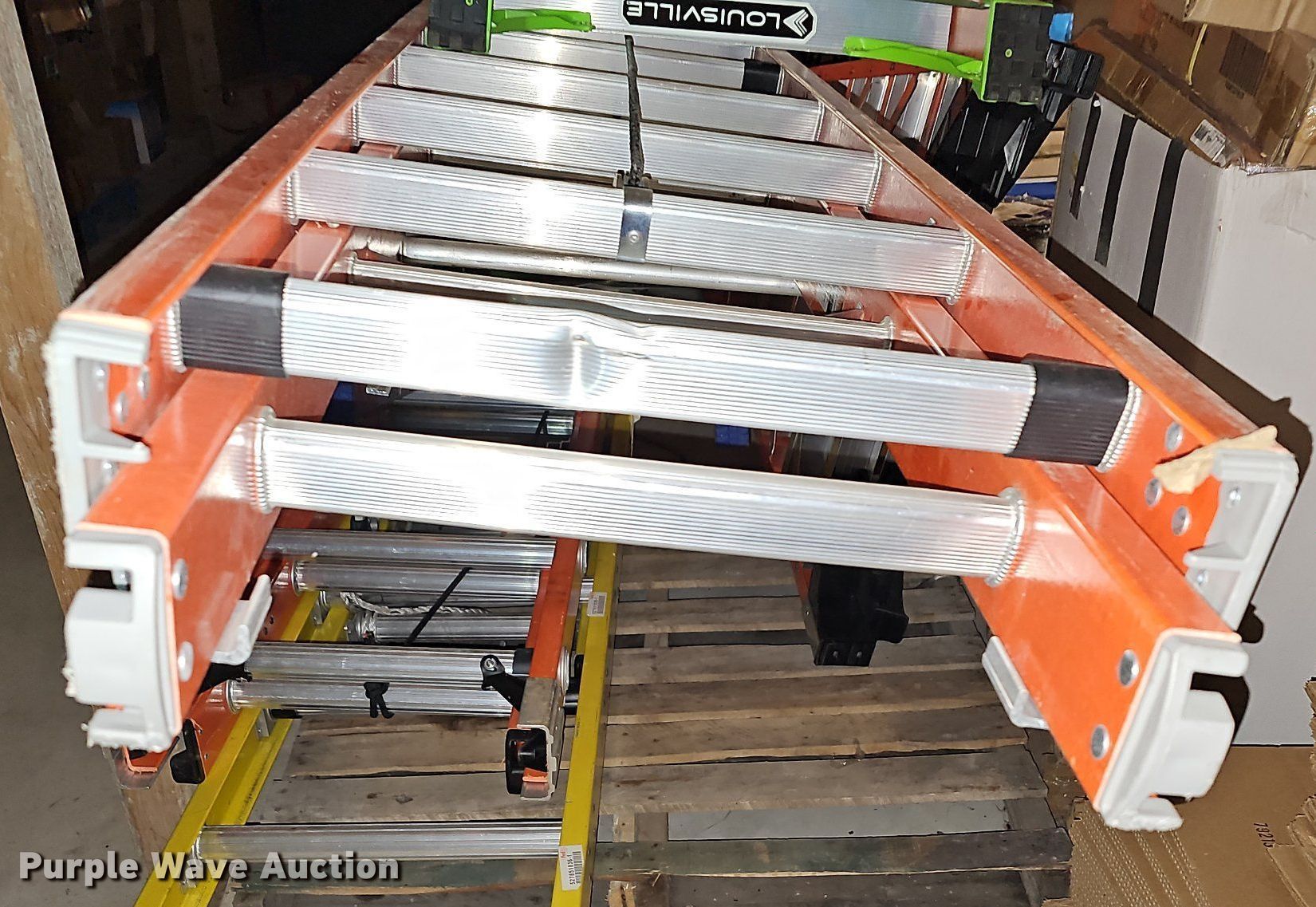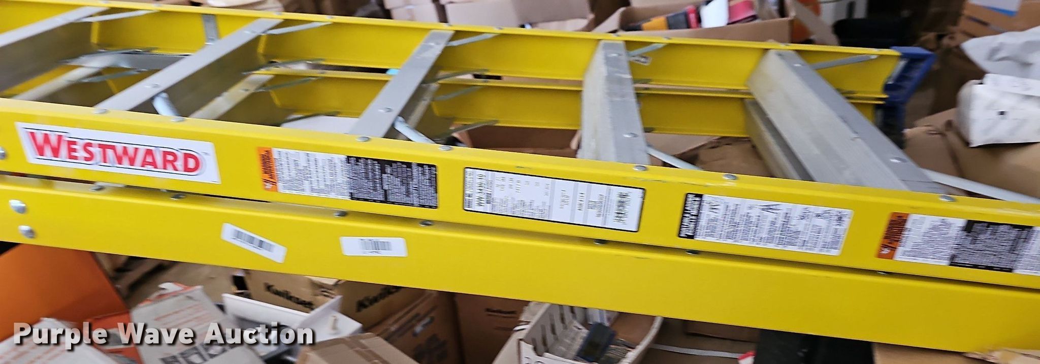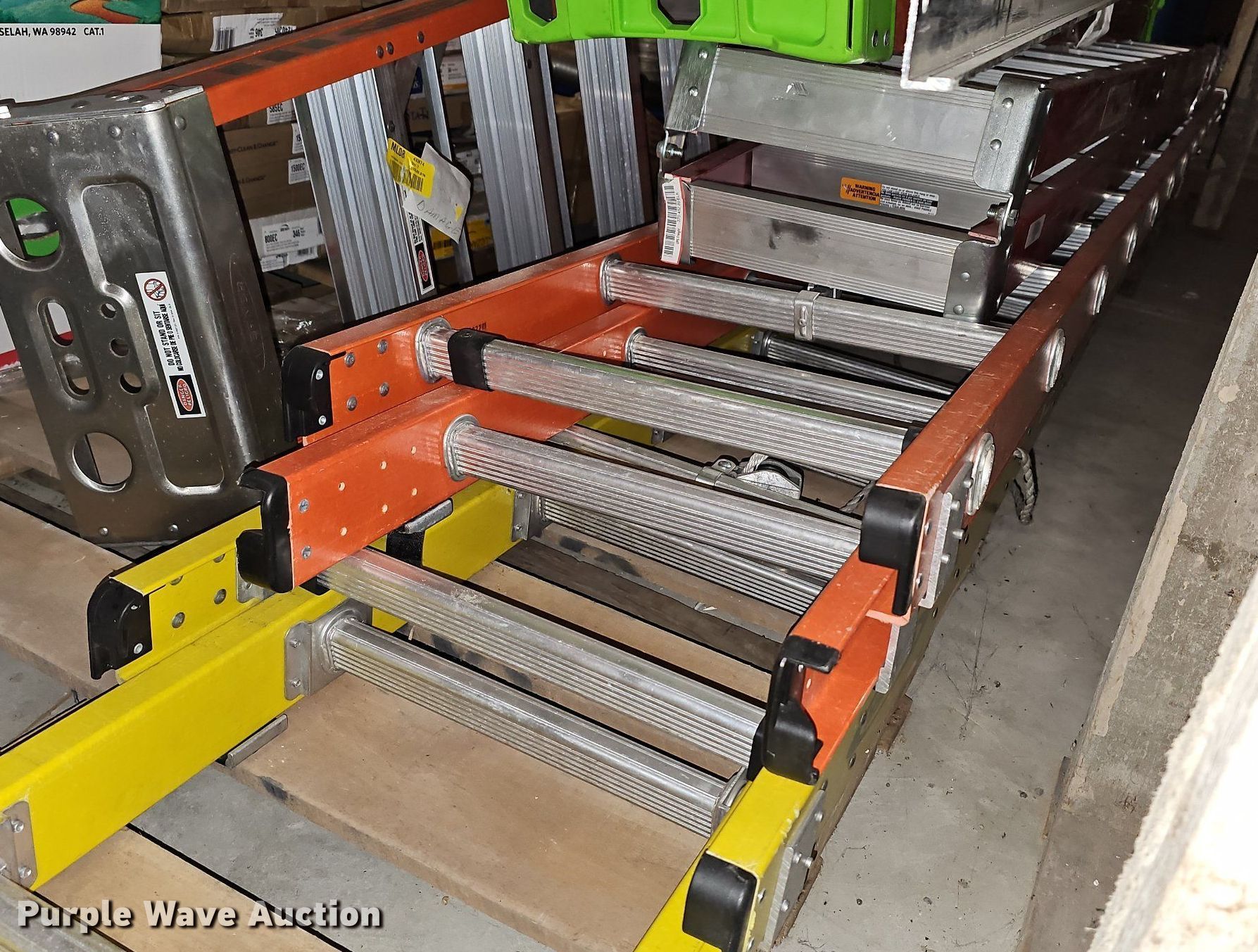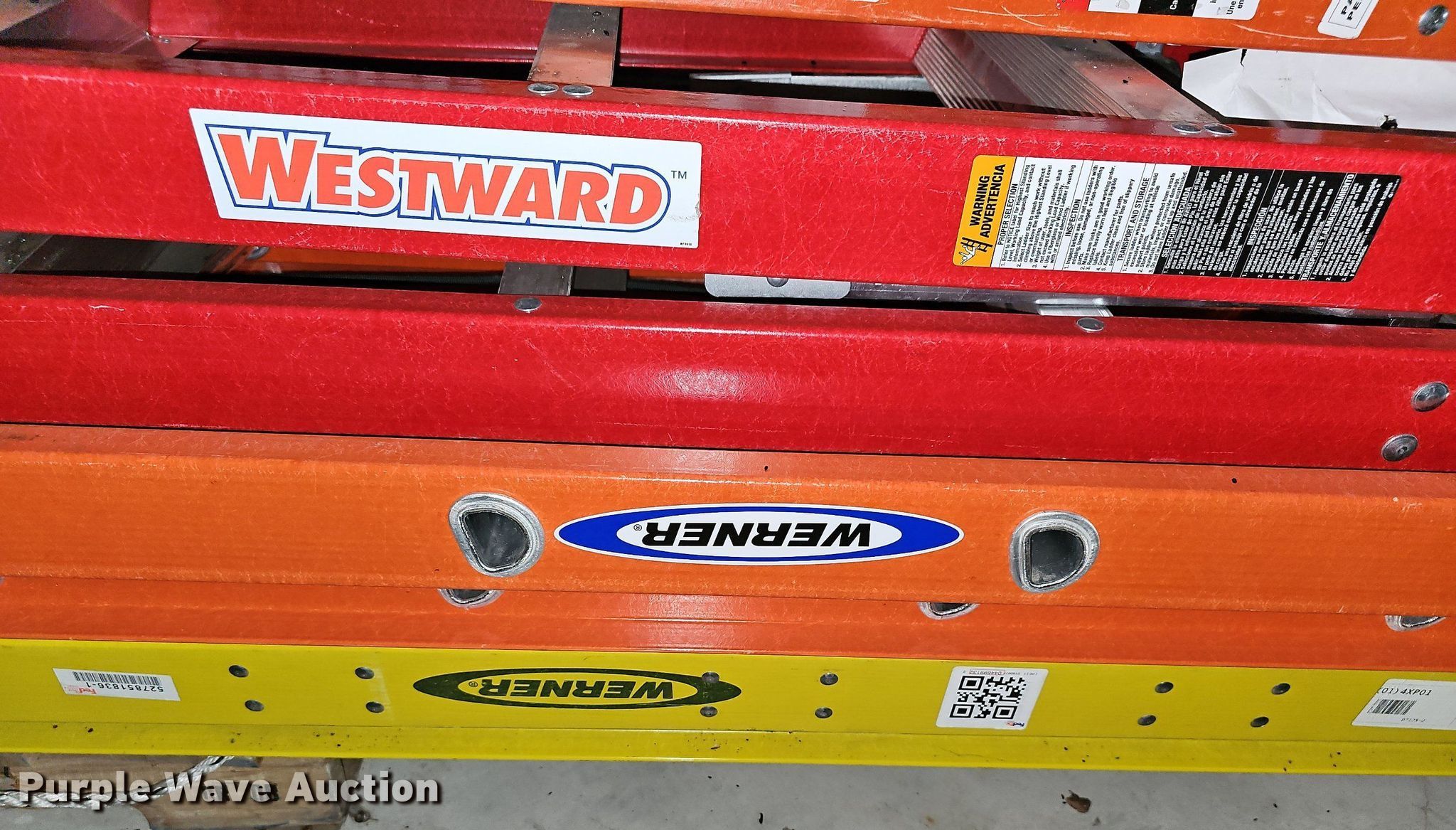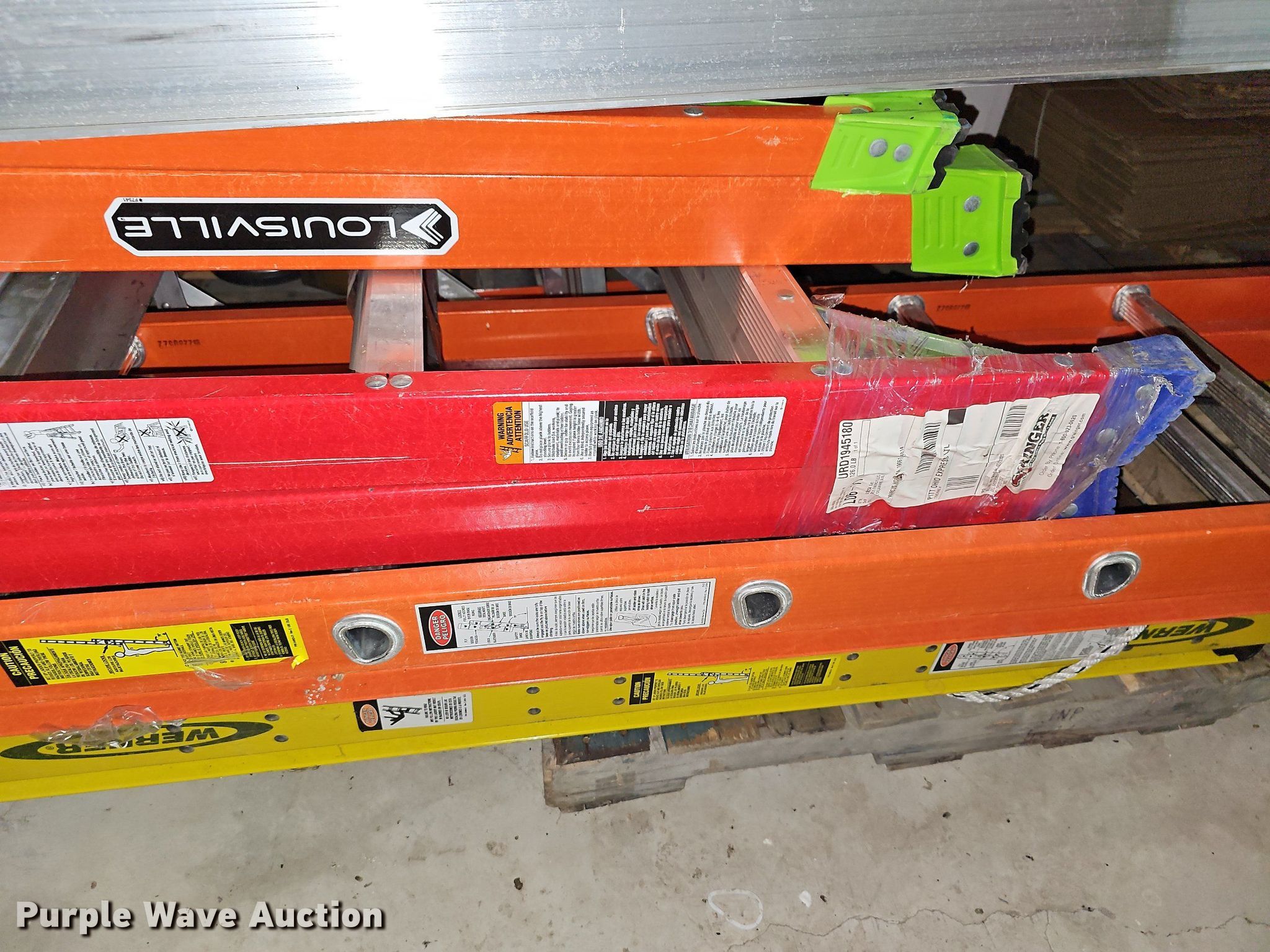 Purple Wave is selling a used Tools in Kansas. This item is a (11) ladders with the following: (3) extension, (5) Step, Single step frame, Werner, Louisville, Westward, Unused