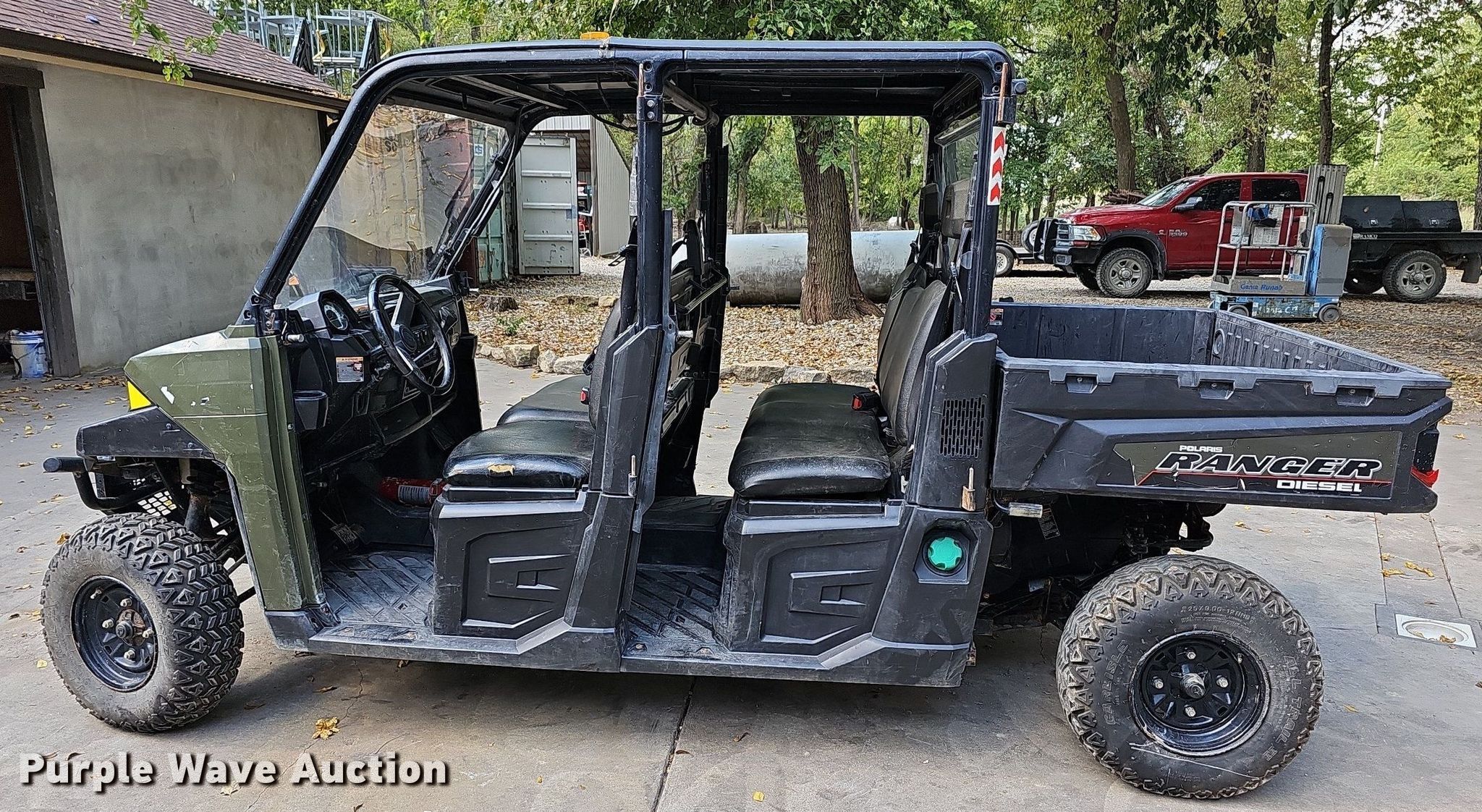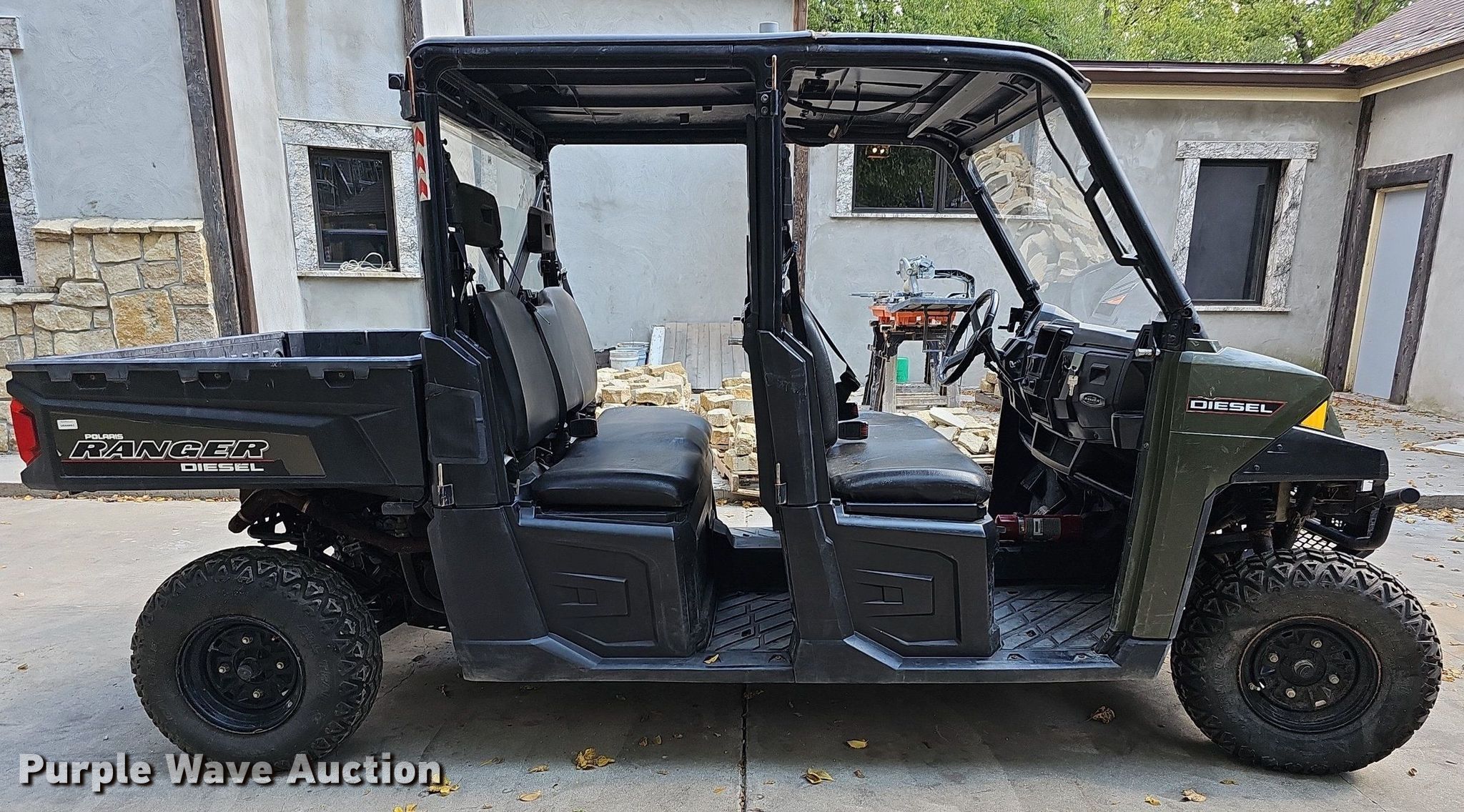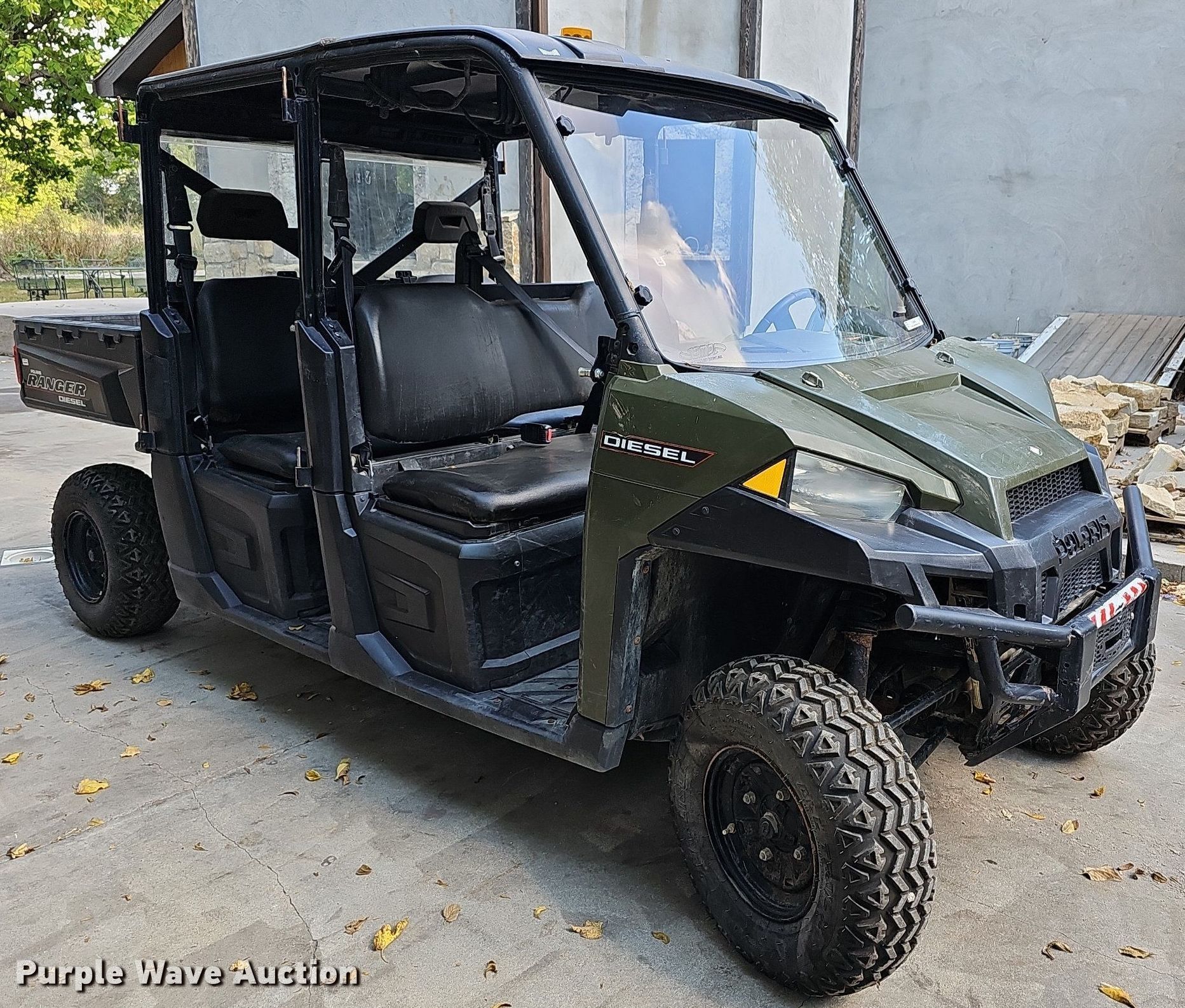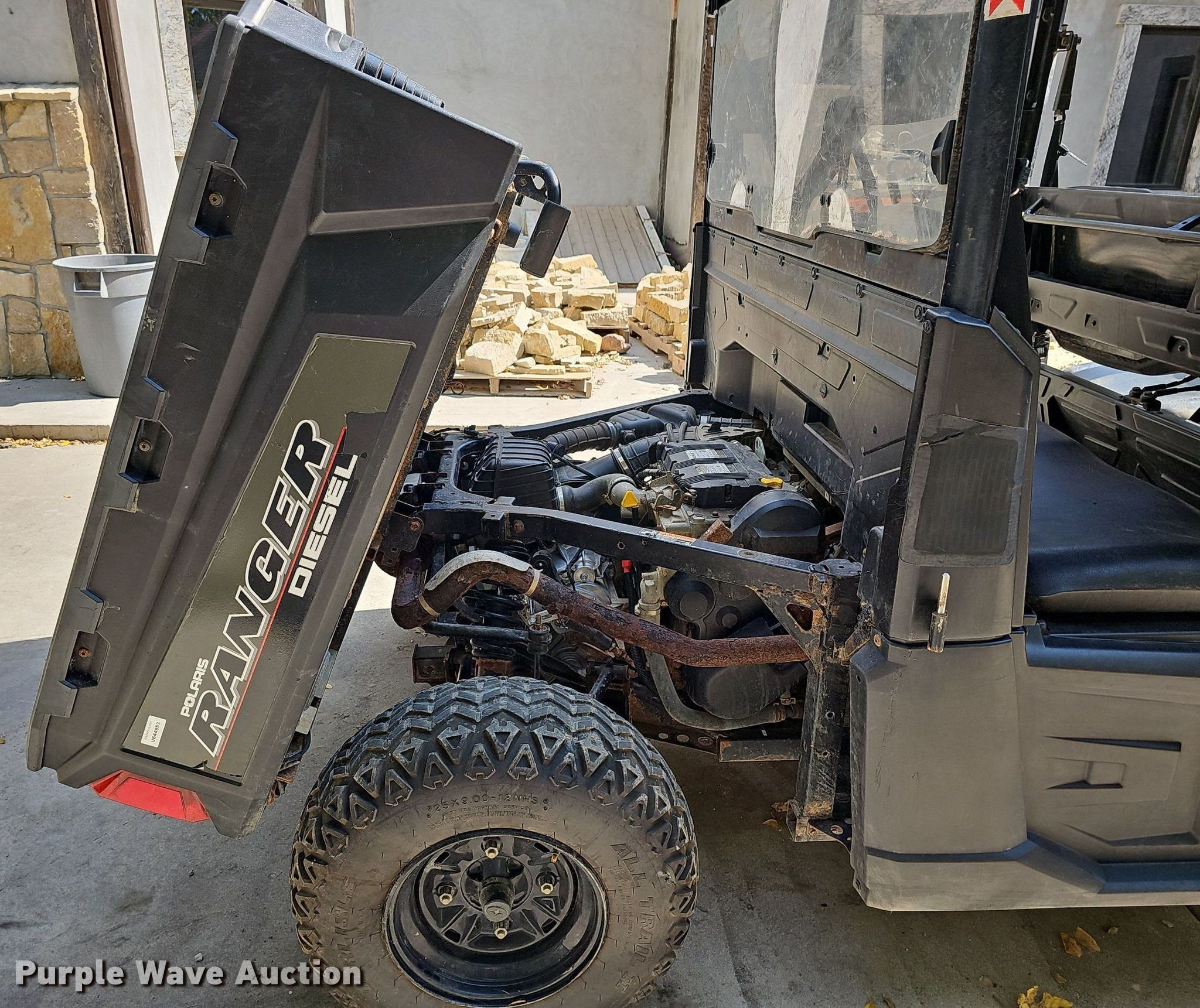 2018 Polaris Ranger utility vehicle. Miles: 4,341 on odometer, Hours: 1,426 on meter, VIN: 4XARVSD1XJ8508116. Engine Kohler, Displacement: 1.028L, Cylinders: 3, Fuel type: Diesel. Transmission Automatic. Chassis Four wheel drive. Features Grill guard, Receiver hitch, Dump bed 5" L x 42" W, Dump bed type: Manual. Tires Size: 25x9.00-12. Kansas non-highway not intend for road use title. Title distribution may be delayed up to 14 days from verification of funds. Emmett, KS 66422