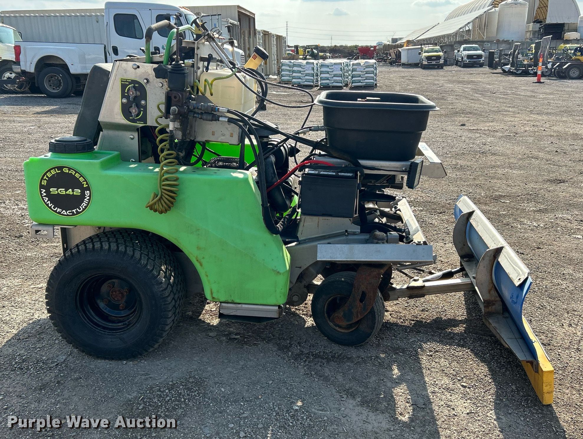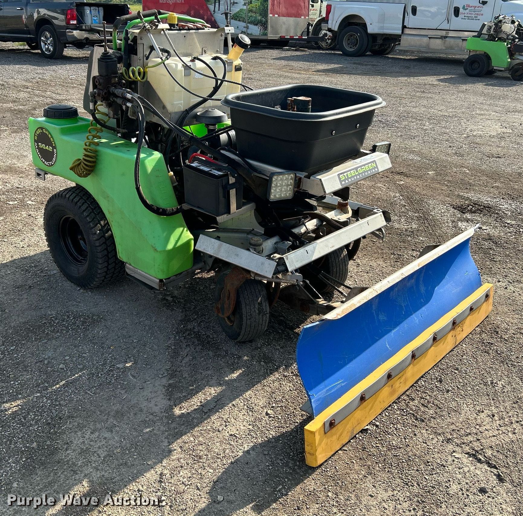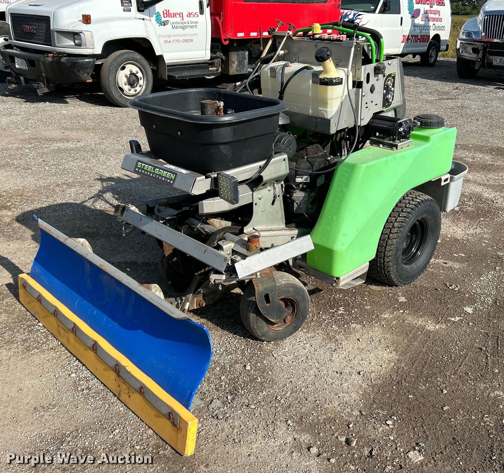 Steel Green SG42 applicator. Hours: 128 on meter, Serial: SG42-20002. Engine Briggs & Stratton , Displacement: 627cc, Cylinders: 1, Fuel type: Gas. Transmission Hydrostatic. Features (2) 15 gal spray tanks, Spreader hopper, 56" snow plow. Tires Front: 13x6.50-6, Rear: 22x11.00-10. Bluegrass Landscape & Snow Management. Bridgeton, MO 63044