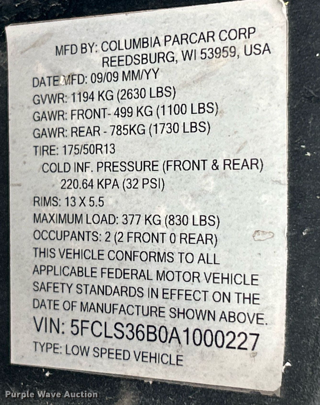 Purple Wave is selling a used Utility Vehicle in Missouri. This item is a 2010 Columbia Parcar Summit utility vehicle with the following: Hours: 4,419 on meter, VIN: 5FCLS36B0A1000227