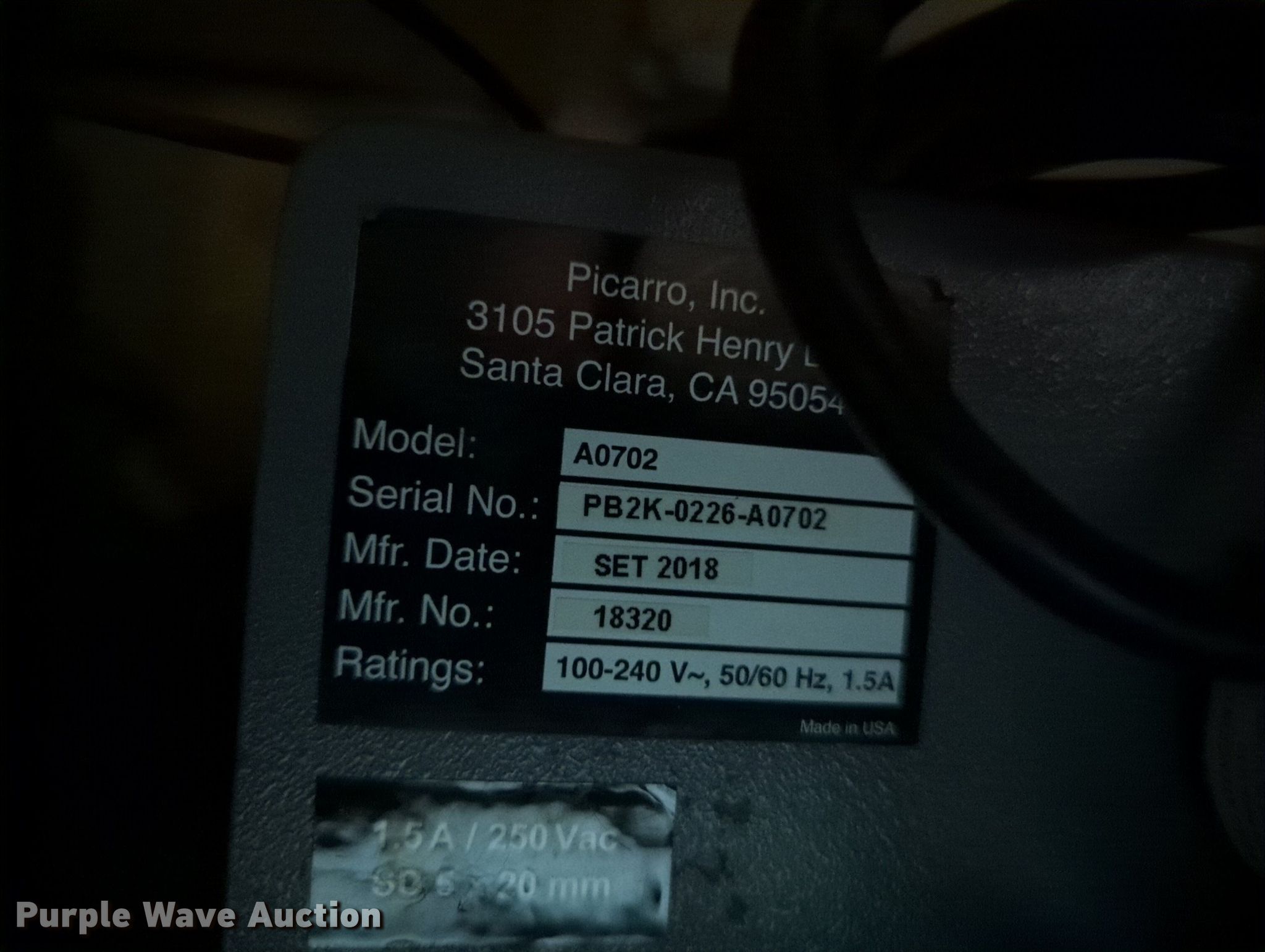 Purple Wave is selling a used Ag Electronics in Oklahoma. This item is a Picarro gas concentration analyzer with the following: Serial: PB2K-0226-A0702, Unit #: 1829-1