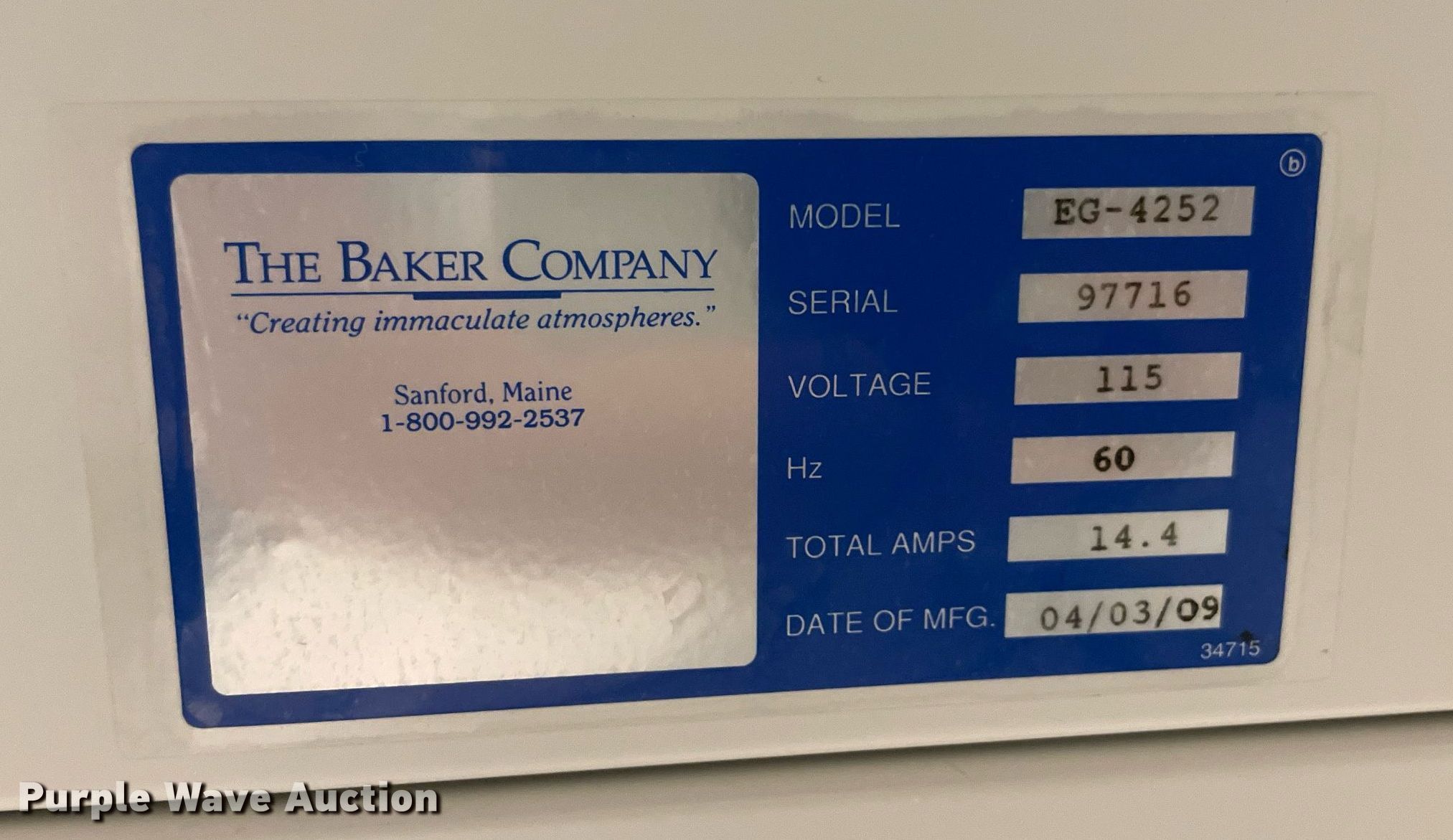 Purple Wave is selling a used Other Industrial or Business in Oklahoma. This item is a The Baker Company EdgeGard 4252 laminaflow hood with the following: Serial: 97716