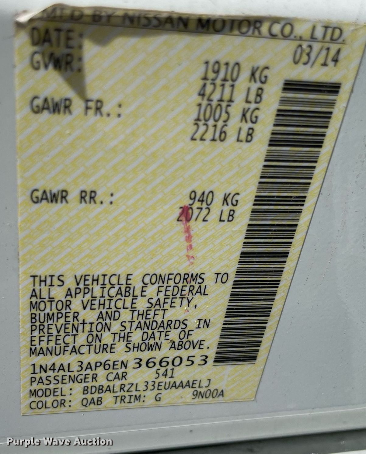 Purple Wave is selling a used Passenger Vehicle in Texas. This item is a 2014 Nissan Altima with the following: Miles: 104,828 on odometer, VIN: 1N4AL3AP6EN366053