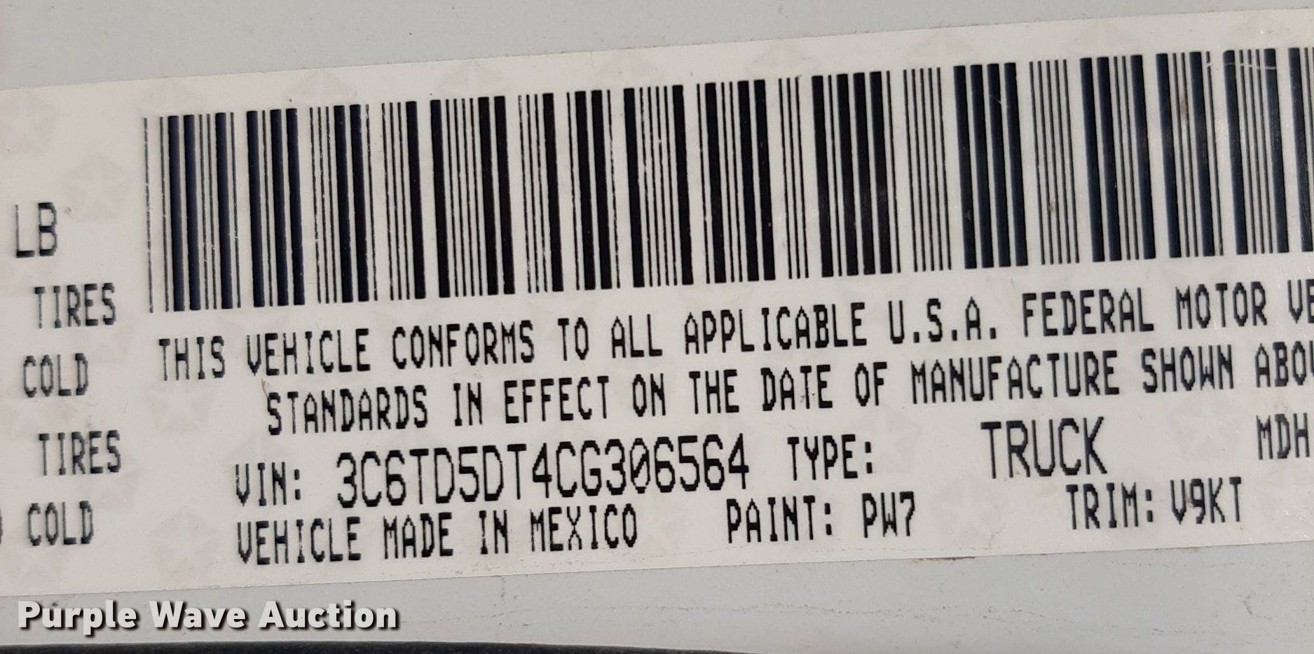 - VIN: 3C6TD5DT4CG306564