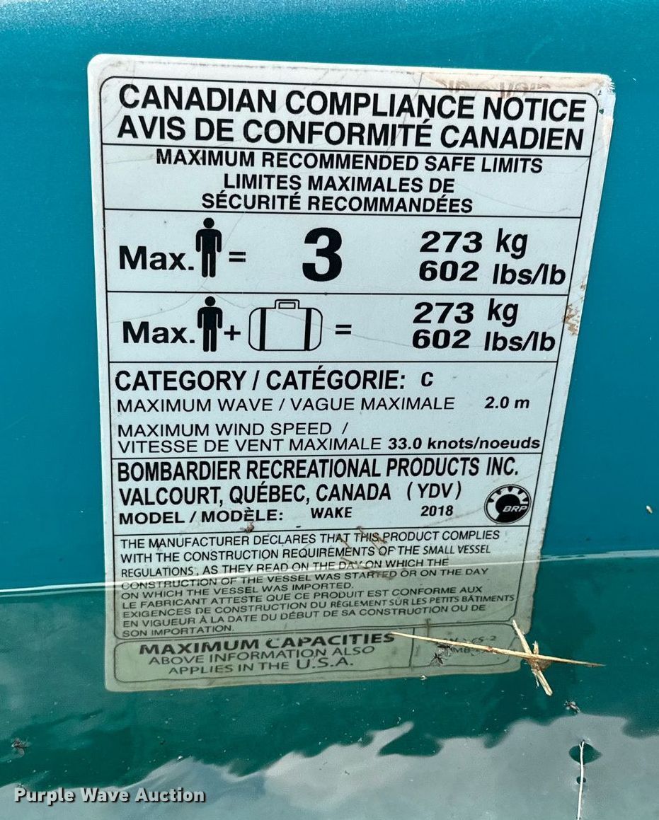 2018 Sea Doo Wake Pro 230 personal watercraft. Hours: 159 on meter, Length: 11' 6", Hull ID: YDV12738C818, Claim #: 3-814300. Engine Displacement: 1.4938L, Cylinders: 3, Fuel type: Gas. Operators station Capacity Person: 3, 602 lbs. Trailer 1997 Norshel , VIN: 1N9BW151XV1067043, Overall length: 12', Overall width: 56", Ball hitch size: 2", Axles: Single, Tire size: 4.80-12. Notes Crack in hull, Dead battery, Non-operational unit. Insurance Salvage Unit.. Sea Doo- Oklahoma title. Trailer- Transfer of ownership documentation will be a bill of sale. Distribution of ownership documentation may be delayed up to 14 days from verification of funds. Oklahoma Farm Bureau Insurance. Seminole, OK 74868