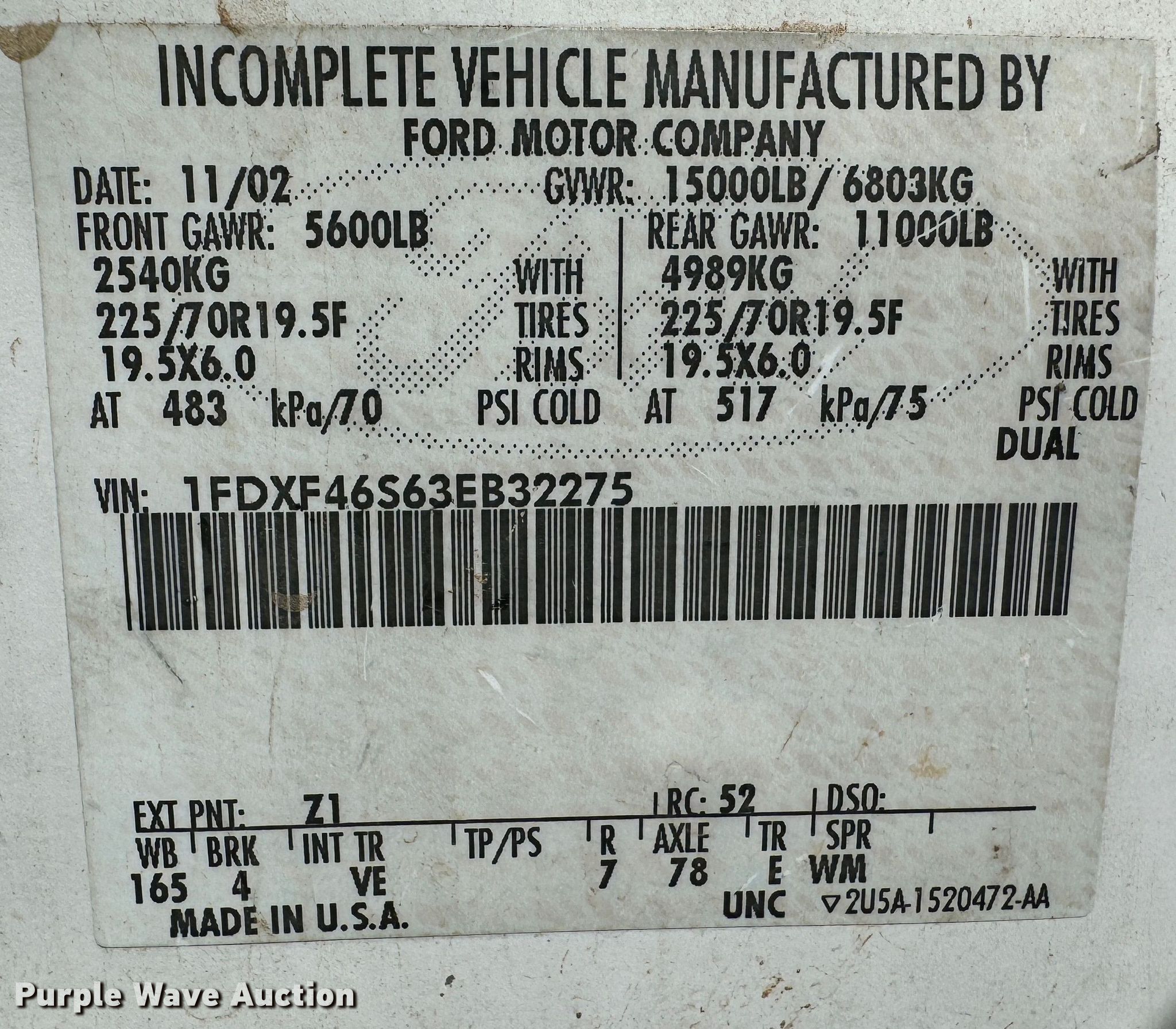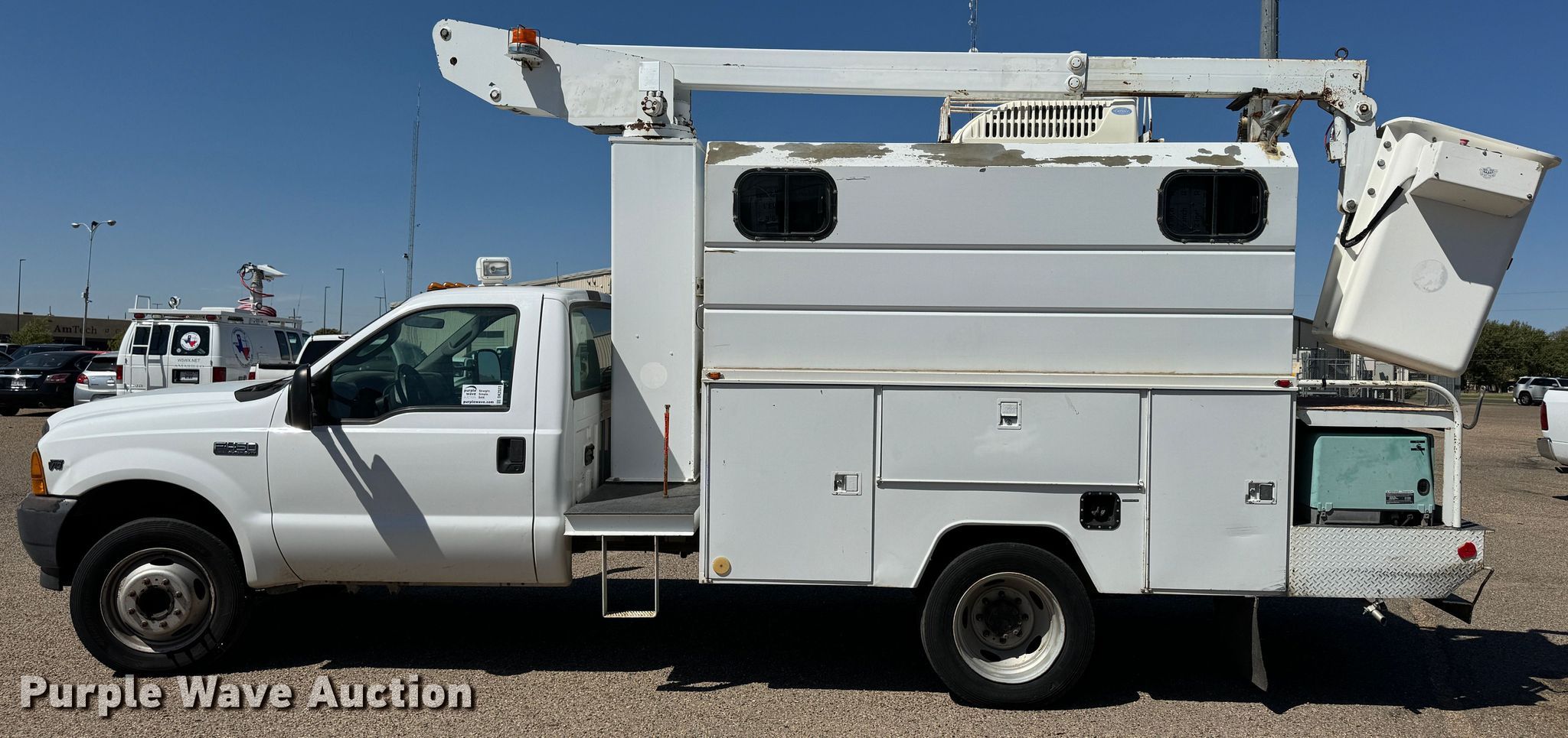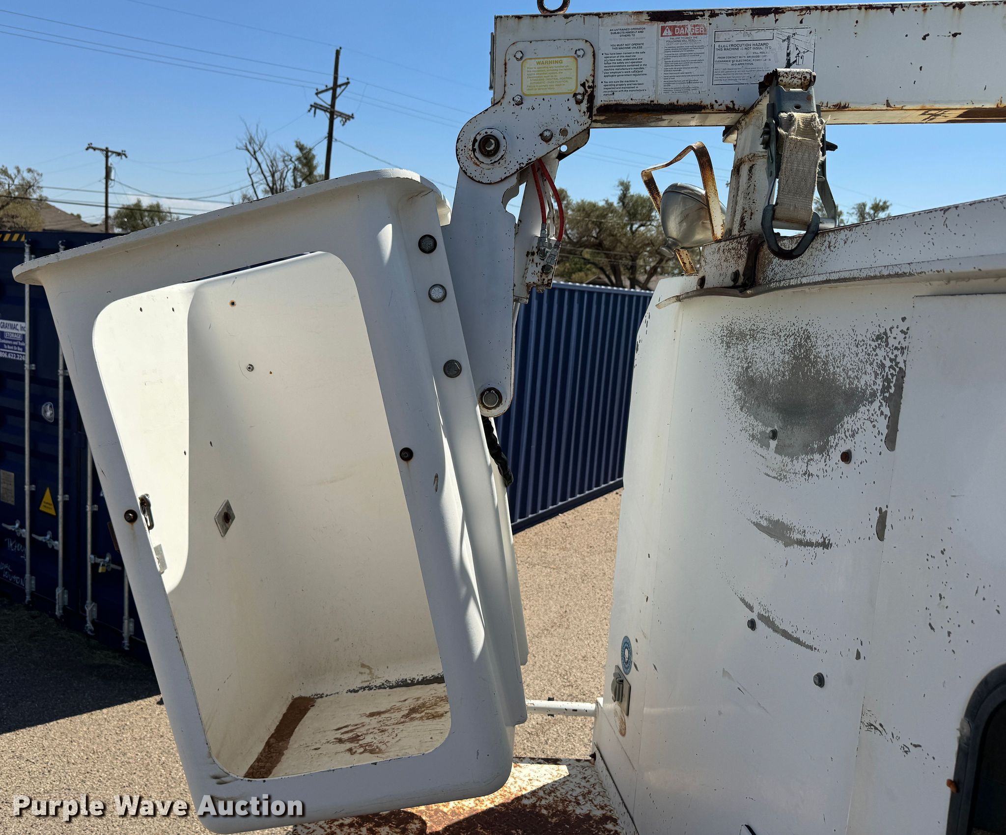 2003 Ford F450 Super Duty fiber optic splicing truck. Miles: 170,067 on odometer, VIN: 1FDXF46S63EB32275, Unit #: 25. Engine Displacement: 6.8L, Cylinders: 10, Fuel type: Gas. Transmission Automatic. Chassis Axles: Single, Suspension: Spring, Brakes: Hydraulic, GVWR: 15,000 lbs, Wheelbase: 165". Interior AC, Heat, Auxiliary controls. Features Bed ETI SB108WSB Canopy, Serial: 84421, 14' L x 93.5" W, Carrier AC, Boom 2002 ETI ETT-29-SNT, Serial: 1202T92549, Maximum lift capacity: 350 lbs, Maximum lift height: 29', Boom type: Articulating, Telescopic, Man basket, Boom controls Ground, Platform/ basket, Onan CMM 5500 generator. Tires Size: 225/70R19.5. Texas title. Title distribution may be delayed up to 14 days from verification of funds. AW Broadband. 3433 Plains Boulevard. Amarillo, TX 79102
