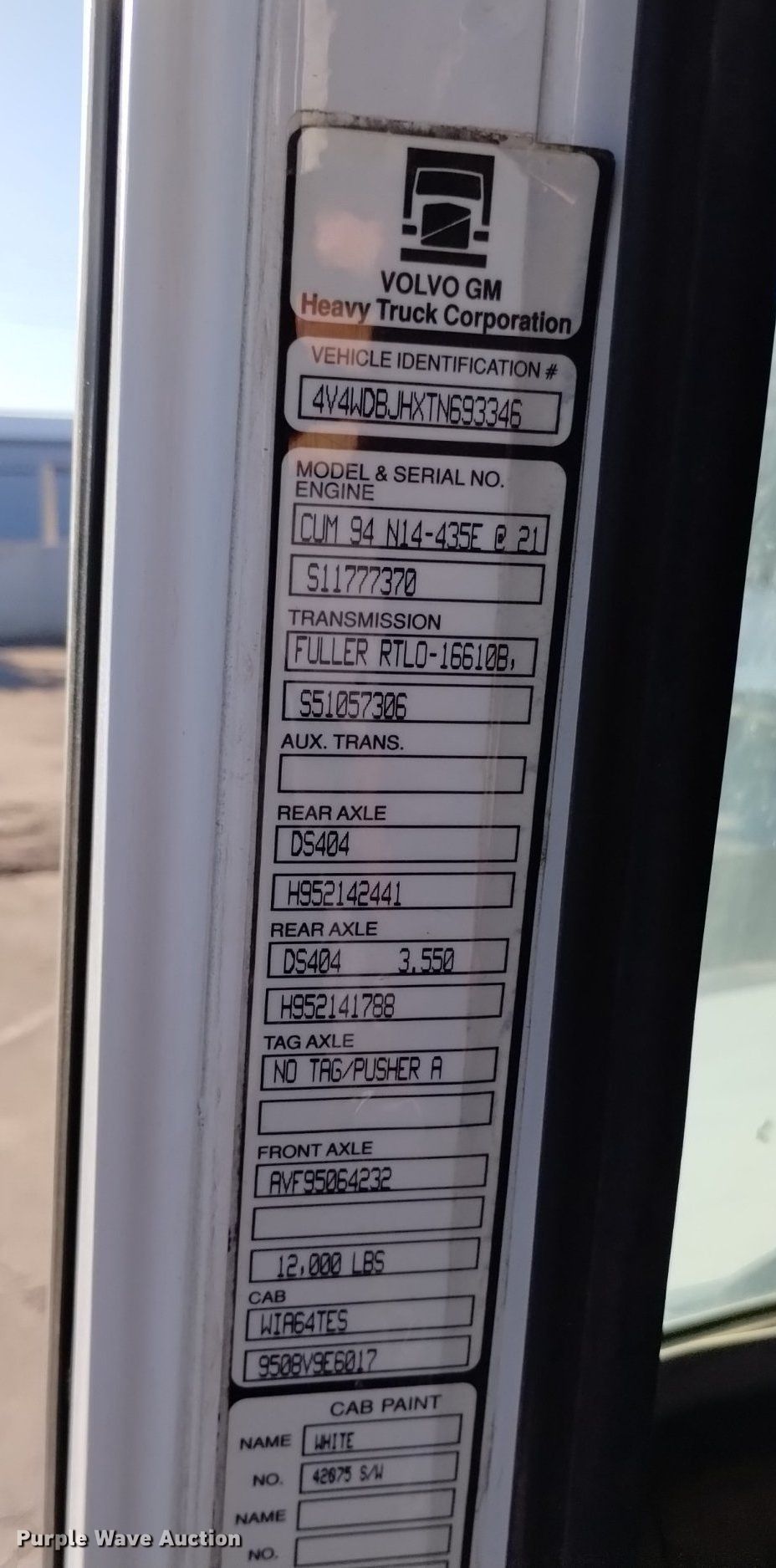 1996 Volvo semi truck. Miles: Unknown, VIN: 4V4WDBJHXTN693346, Unit #: 105. Engine Cummins N14, Displacement: 14.0L, Cylinders: 6, Fuel type: Diesel, Engine brake. Transmission Eaton Fuller RTLO16610B, Manual, Speed: 10. Chassis Axles: Tandem, Differential lock: Inter-axle, Suspension: Air, Brakes: Air, PTO, Truck chassis: 16' 9", GVWR: 50,000 lbs FAWR: 12,000 lbs, IAWR: 19,000 lbs, RAWR: 19,000 lbs. Interior AC, Heat, Heated mirrors, Cruise control, Sleeper Sleeper length: 53", Beds: Single, Rear climate control. Features Deck plate: Aluminum, Fifth wheel type: Air operated, Sliding, Fuel tank: Dual. Tires Front: 295/75R22.5. Notes Windshield chipped or cracked, Rear suspension not holding air. Arizona title. Mileage has not been verified. Exempt will be written in the odometer disclosure on the title. Title distribution may be delayed up to 14 days from verification of funds. Reddi Services. 12268 North 92nd Drive. Peoria, AZ 85345
