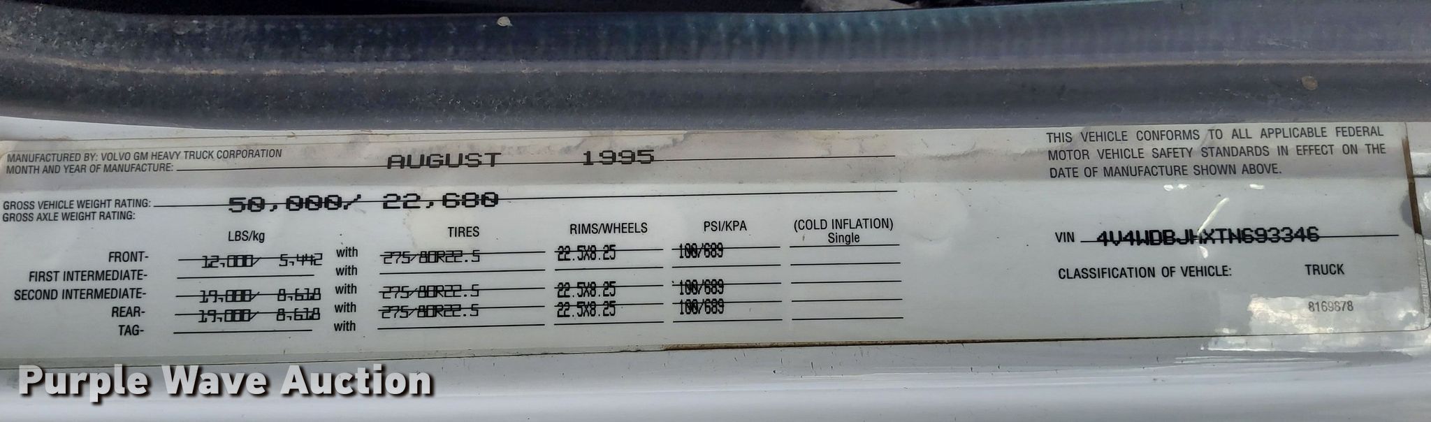 Purple Wave is selling a used Truck Tractor in Arizona. This item is a 1996 Volvo semi truck with the following: Miles: Unknown, VIN: 4V4WDBJHXTN693346, Unit #: 105
