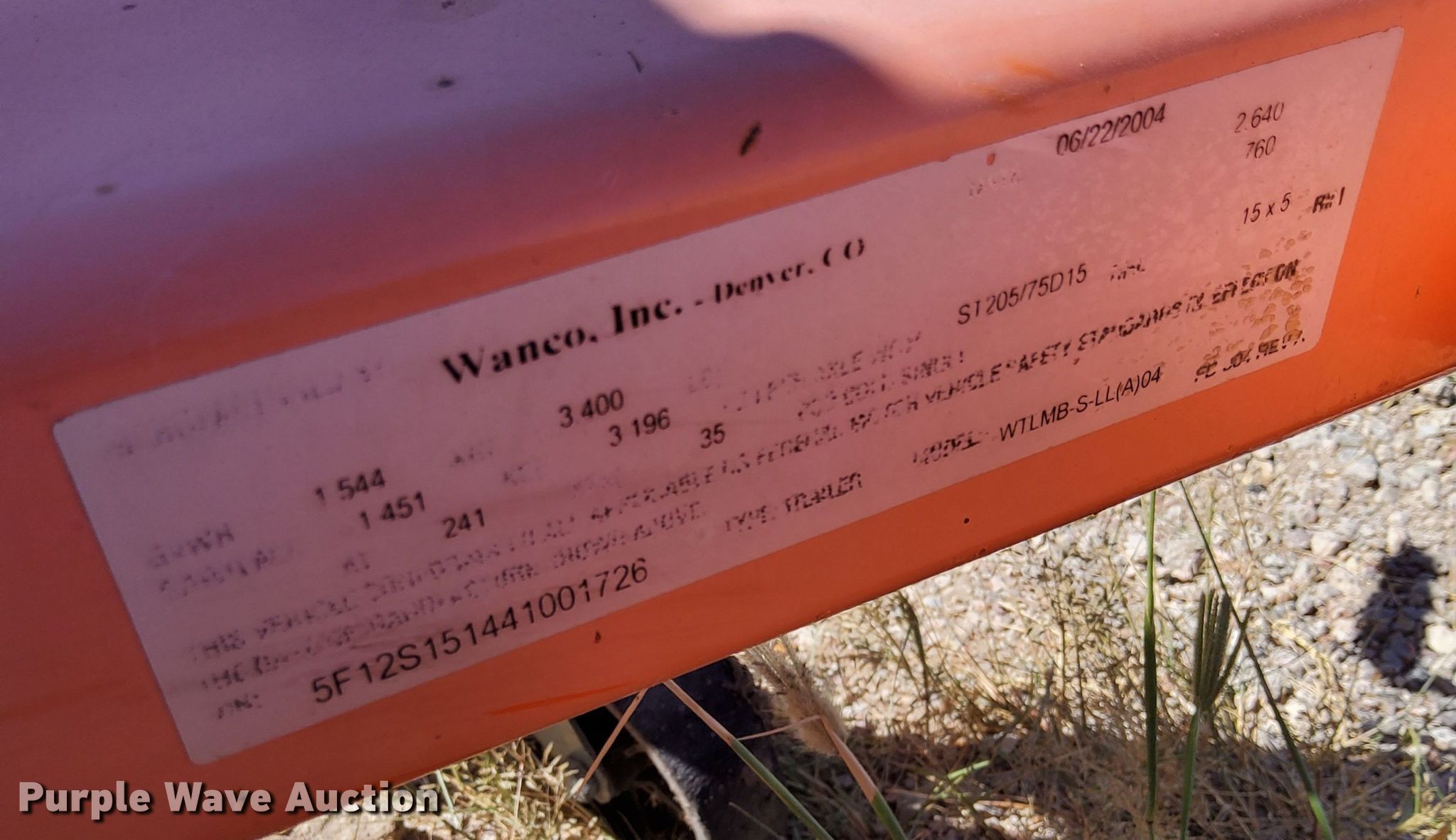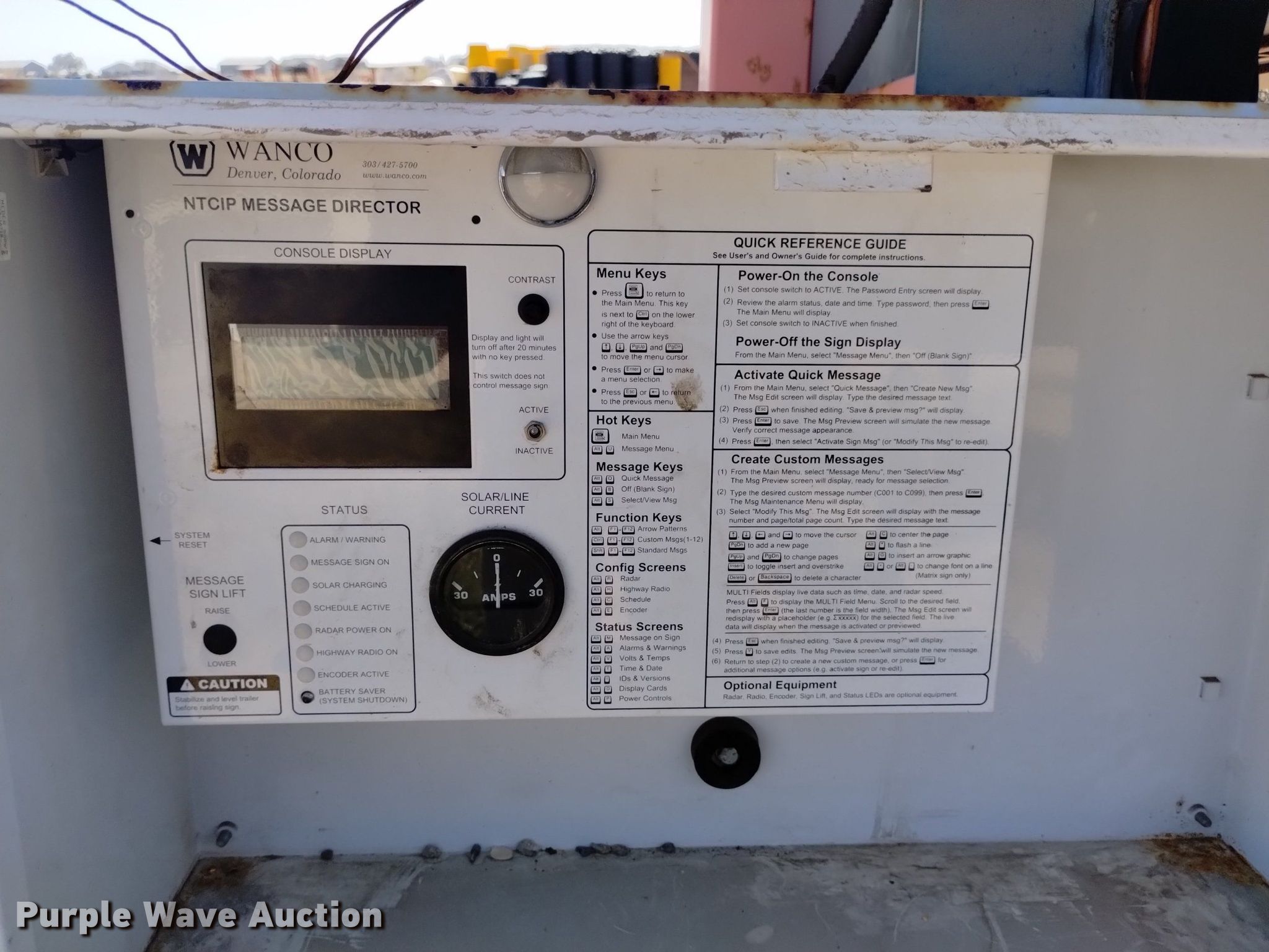(2) message board trailers. 2005 Wanco. VIN: 5F12S121951000157. Tires Size: 205/75R15. Notes No batteries. 2004 Wanco WTLMB-S-LL(A)04 VIN: 5F12S151441001726. Tires Size: 205/75R15. Notes No batteries. This is worksite support equipment and will not come with a title. Transfer of ownership documentation will be a bill of sale. Roadway Safety Solutions, llc. Wiggins, CO 80654