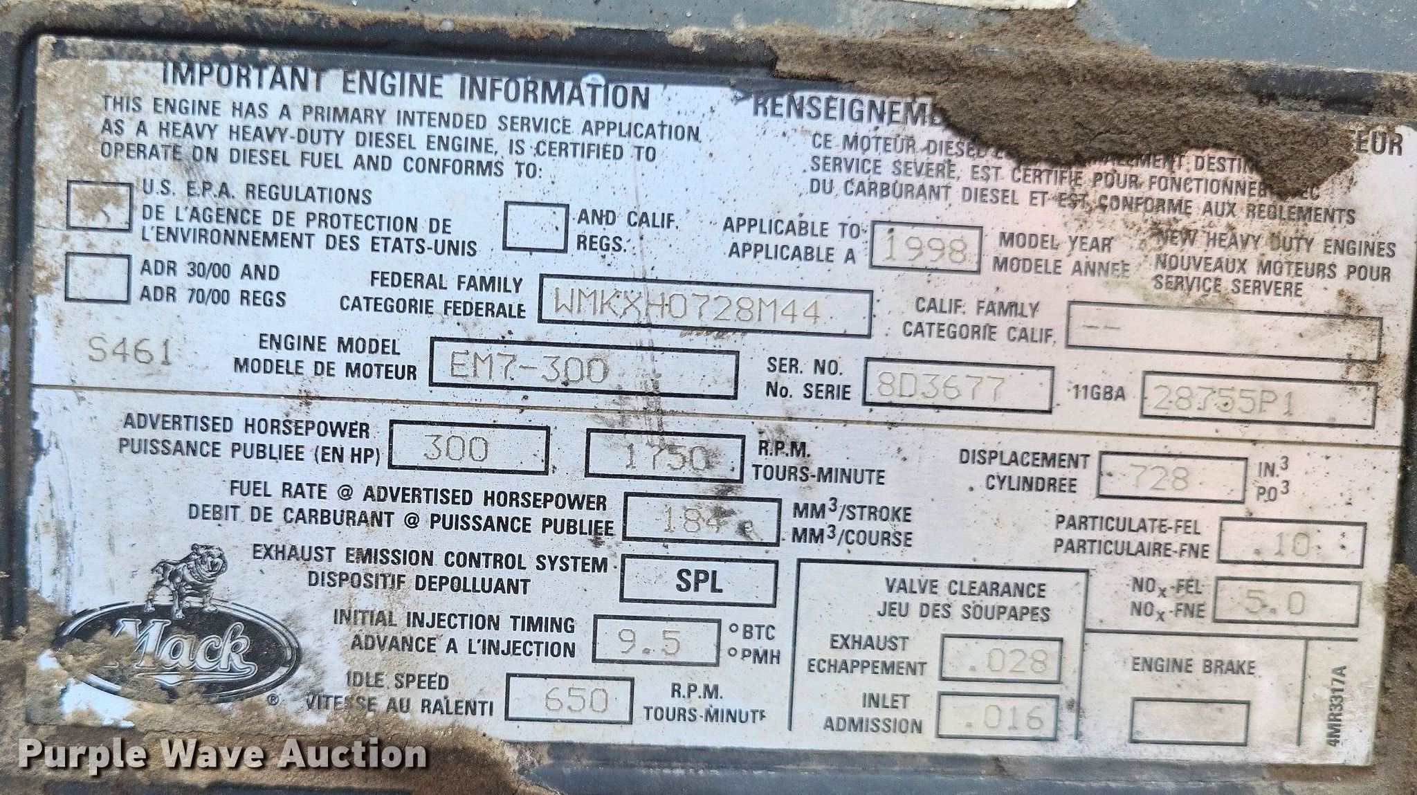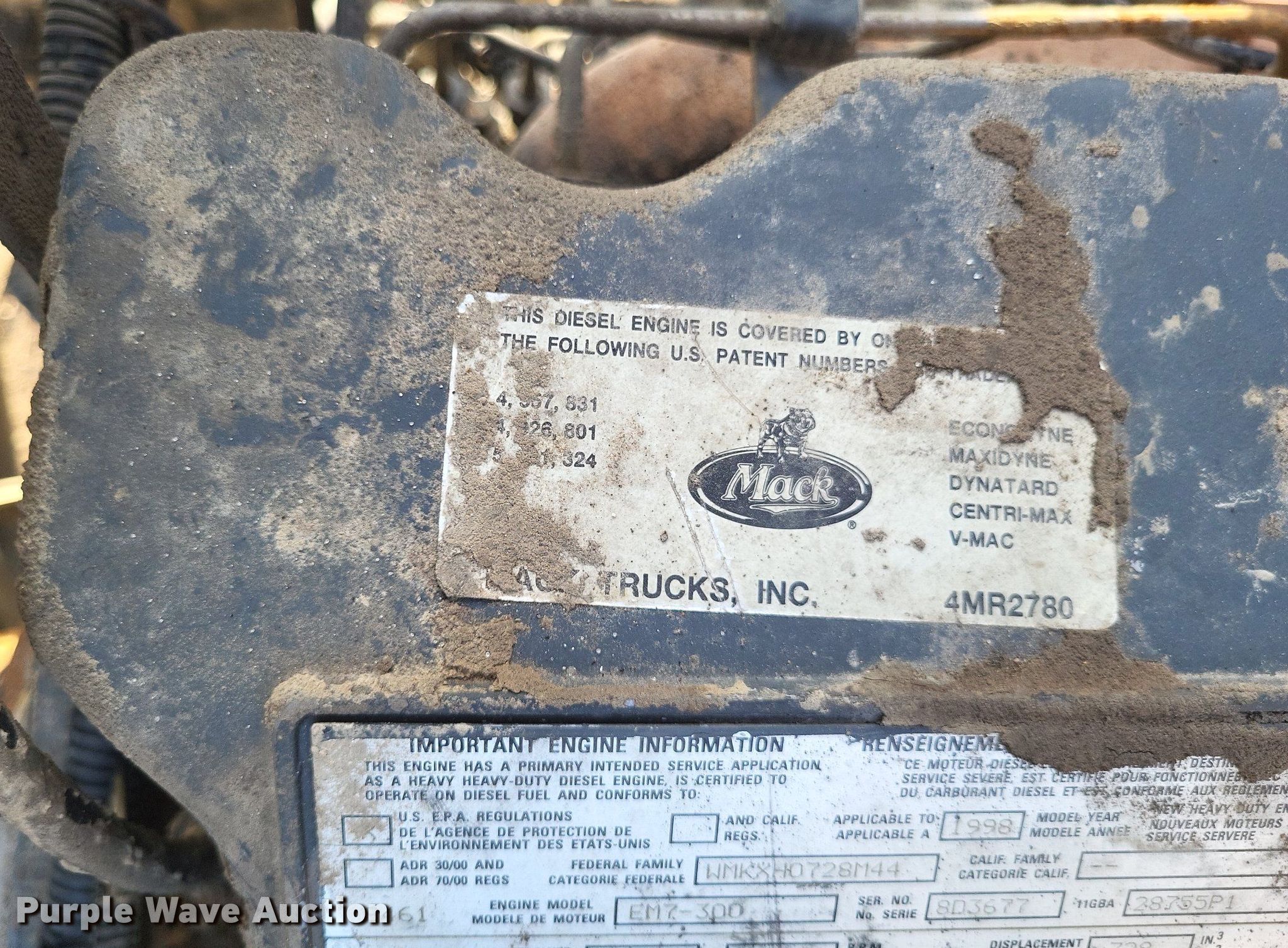1998 Mack RD truck cab and chassis. Miles: Unknown, VIN: 1M2P264C9WM026609. Engine Displacement: 12.0L, Cylinders: 6, Fuel type: Diesel, HP: 350. Transmission Manual, Speed: 8. Chassis Double frame, Axles: Tandem, Differential lock: Inter-axle, Suspension: Spring, Brakes: Air, PTO. Tires Size: 425/65R22.5. Notes Windshield chipped or cracked, Parts missing, Spring suspension broken, Non-operational unit, Unit must be towed or hauled. Arkansas title. Mileage has not been verified. Exempt will be written in the odometer disclosure on the title. Atlas Asphalt, Inc... 4437 Hwy 5. Mountain Home, AR 72635