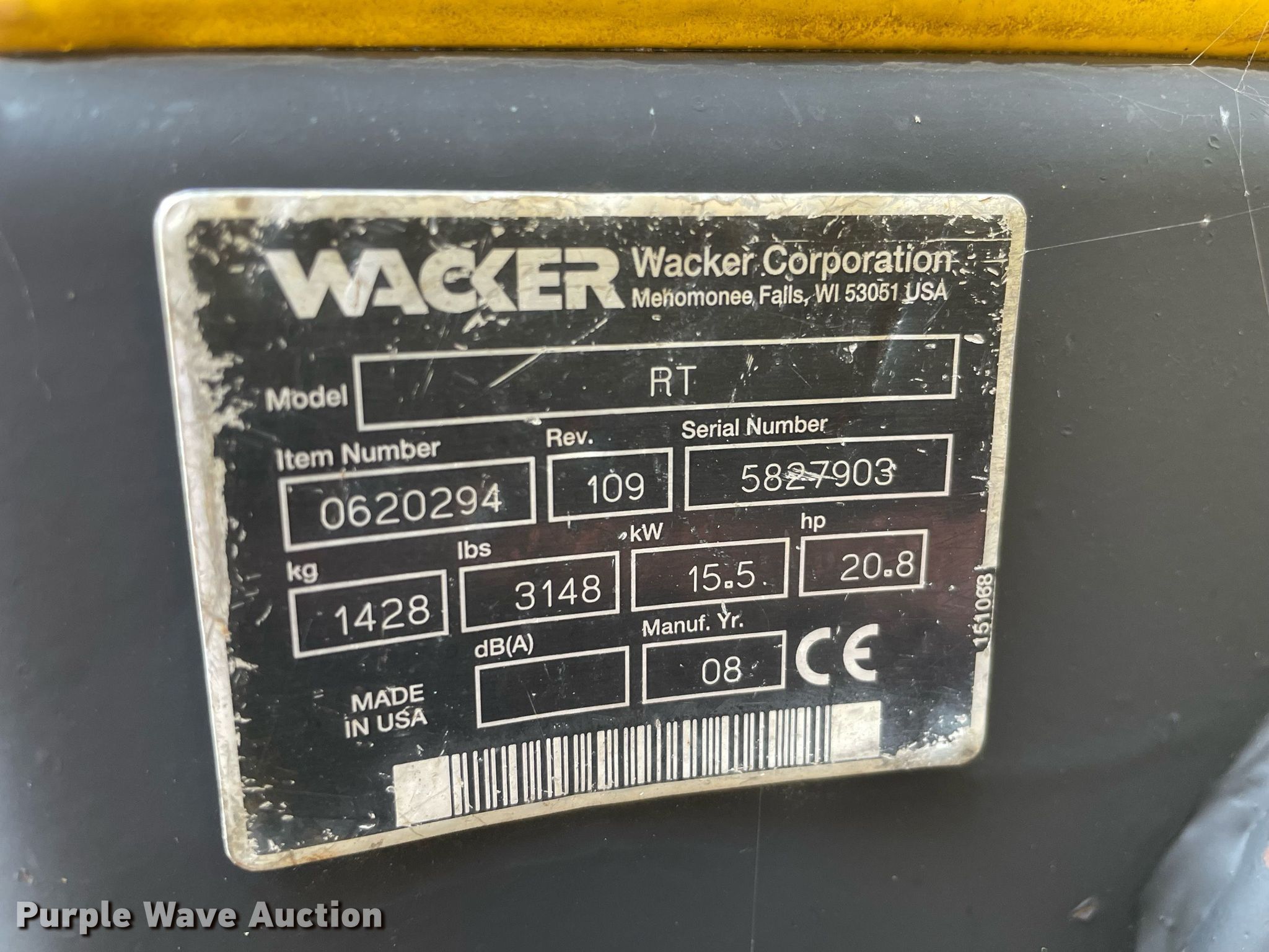 2008 Wacker RT trench compactor. Hours: 983, Serial: 5827903. Engine Lombardini, Cylinders: 3, Fuel type: Diesel. Transmission Hydrostatic. Features Vibratory system, Drum: Padfoot Width: 32", Diameter: 20", Drum scrapers: Front, Rear, Remote control. River City Equipment - Open inspection October 20. 1007 West 12th Avenue Court. Milan, IL 61264