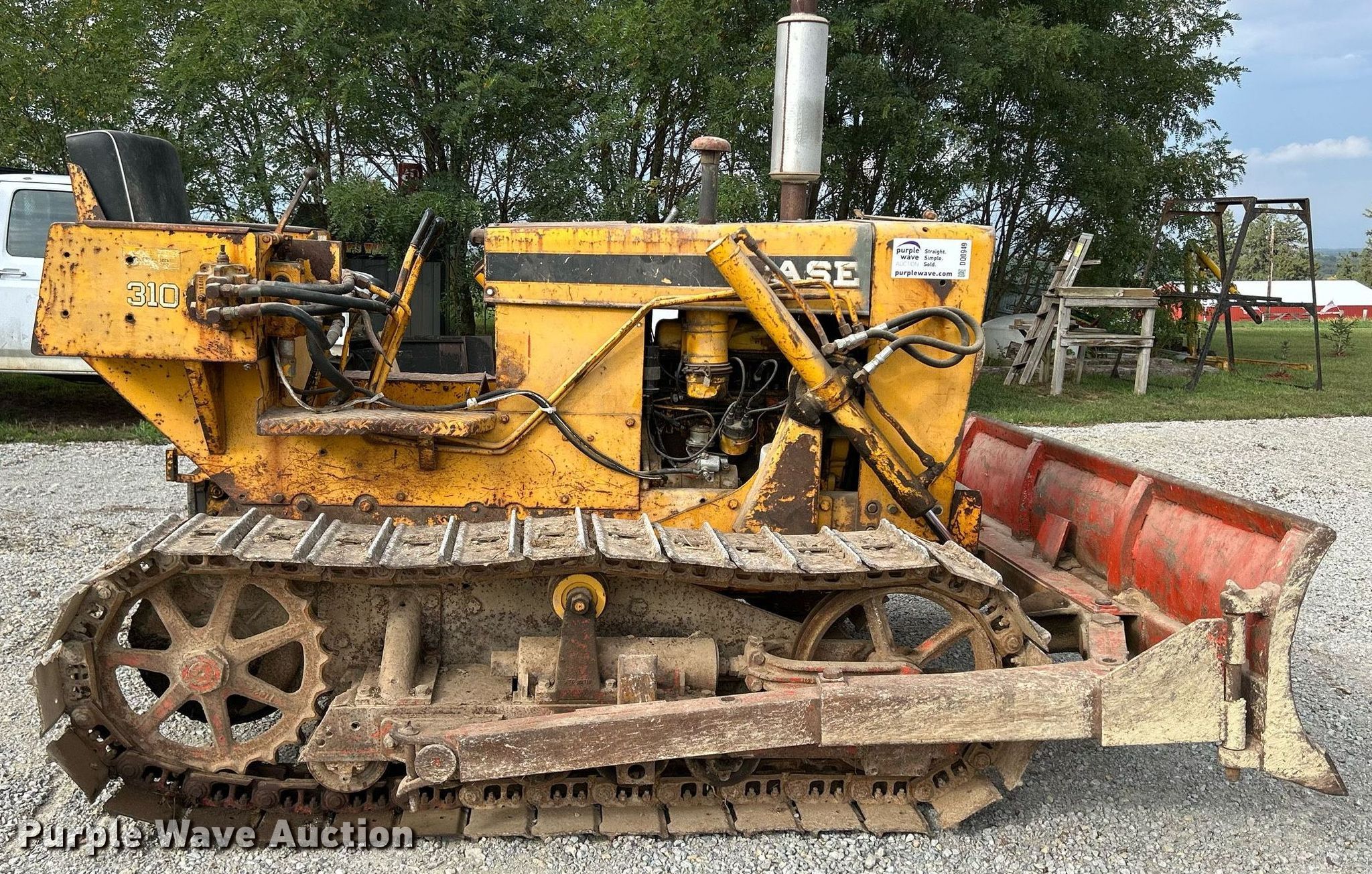 1965 Case 310G dozer. Hours: 547 on meter Actual hours unknown, Miles or hours may vary, unit still in use, Serial: 3025491. Engine Case, Cylinders: 4, Fuel type: Gas. Transmission Direct-drive, 3F - 1R. Operators station Steering: Clutch brake. Features Rear drawbar, Dozer blade Type: Straight, Width: 86". Tracks Width: 14", Grouser pads: Single, Bottom rollers: 5. Notes Right blade frame cracked, Left track pad broken. 4067 Breezy Hill Rd. Fennimore, WI 53809