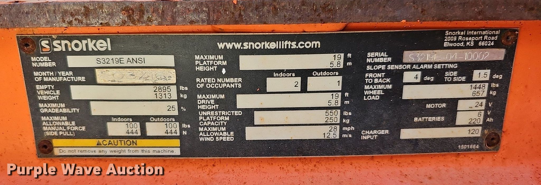 2016 Snorkel S3219E scissor lift. Hours: 798 on meter, Serial: S3219E0410002. Electric Motor Volts: 24. Features Maximum lift capacity: 550 lbs, Maximum lift height: 19', Platform: 103" L x 31" W, AC power outlet, Controls: Platform, Ground, Platform extensions: Manual, Safety alarm. Tires Tire size: 12x4, Solid, Non-marking. Notes Owners manual included. Nebraska Commercial Equipment. 10038 Kings Plaza. Omaha, NE 68122